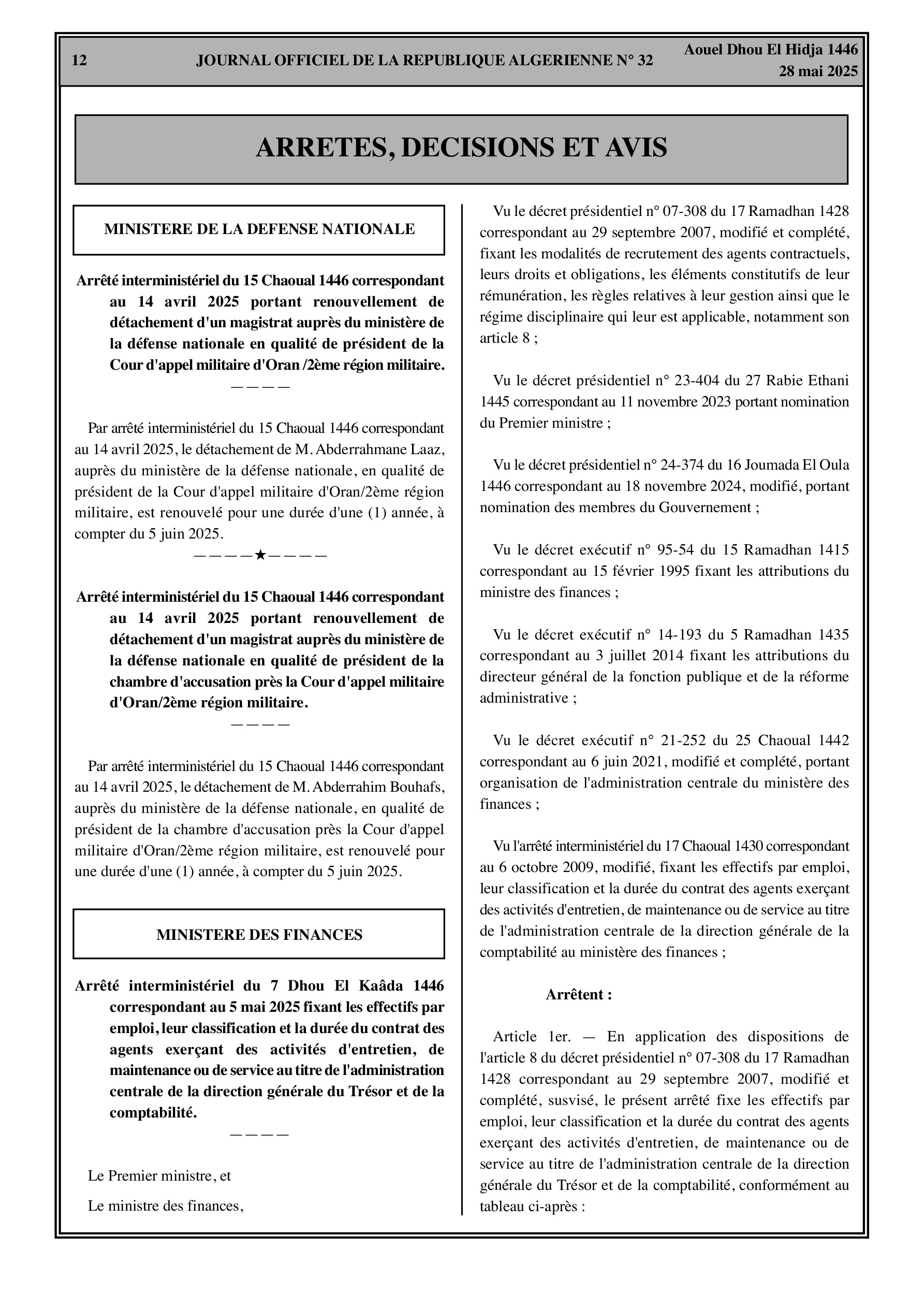 Renouvellement du détachement d'un magistrat en qualité de président de la Cour d'appel militaire d'Oran. Renouvellement du détachement d'un magistrat en qualité de président de la chambre d'accusation près la Cour d'appel militaire d'Oran. Pour une durée d'un (1) an, à compter du 5 juin 2025.