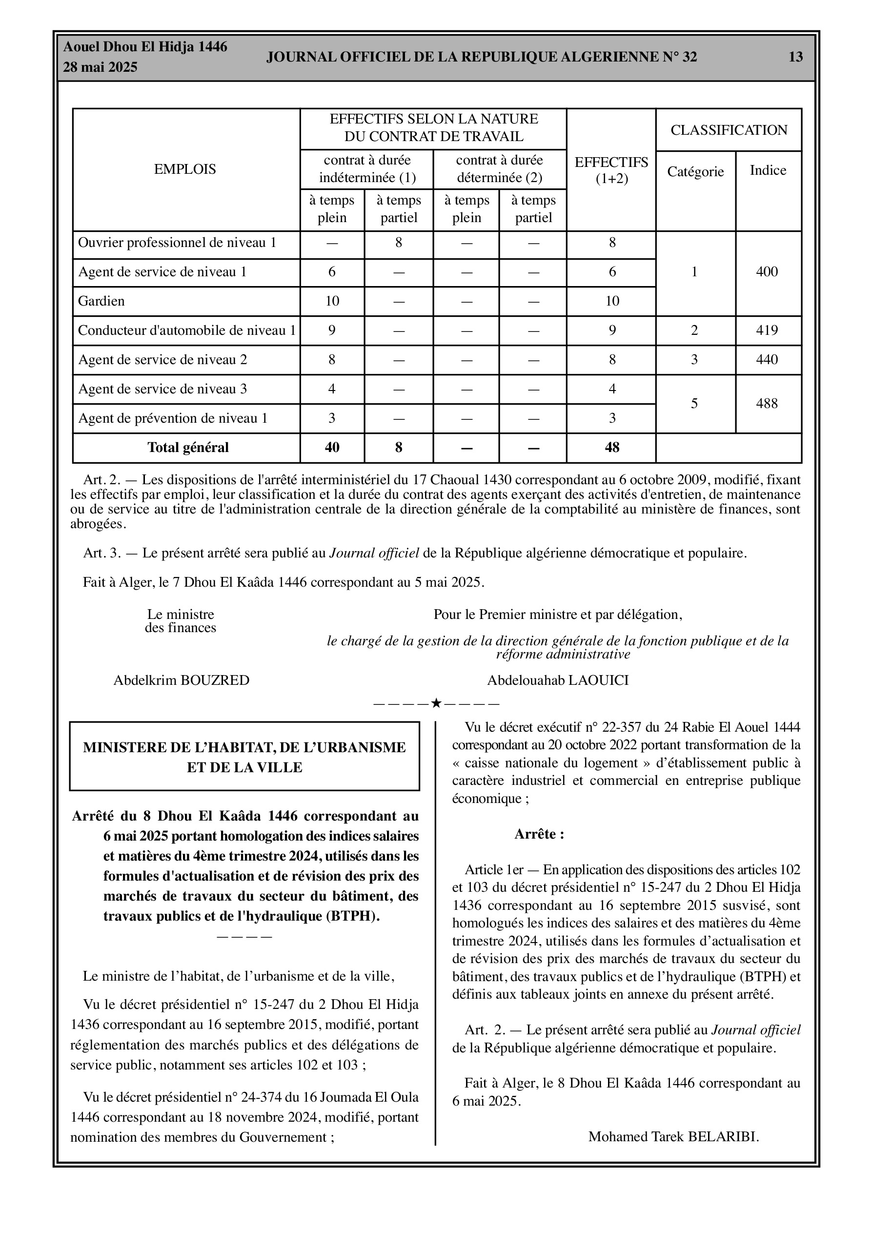 Arrêté ministériel portant homologation des indices salaires et matières du 4ème trimestre 2024, utilisés dans les formules d'actualisation et de révision des prix des marchés de travaux du secteur du bâtiment, des travaux publics et de l'hydraulique (BTPH).