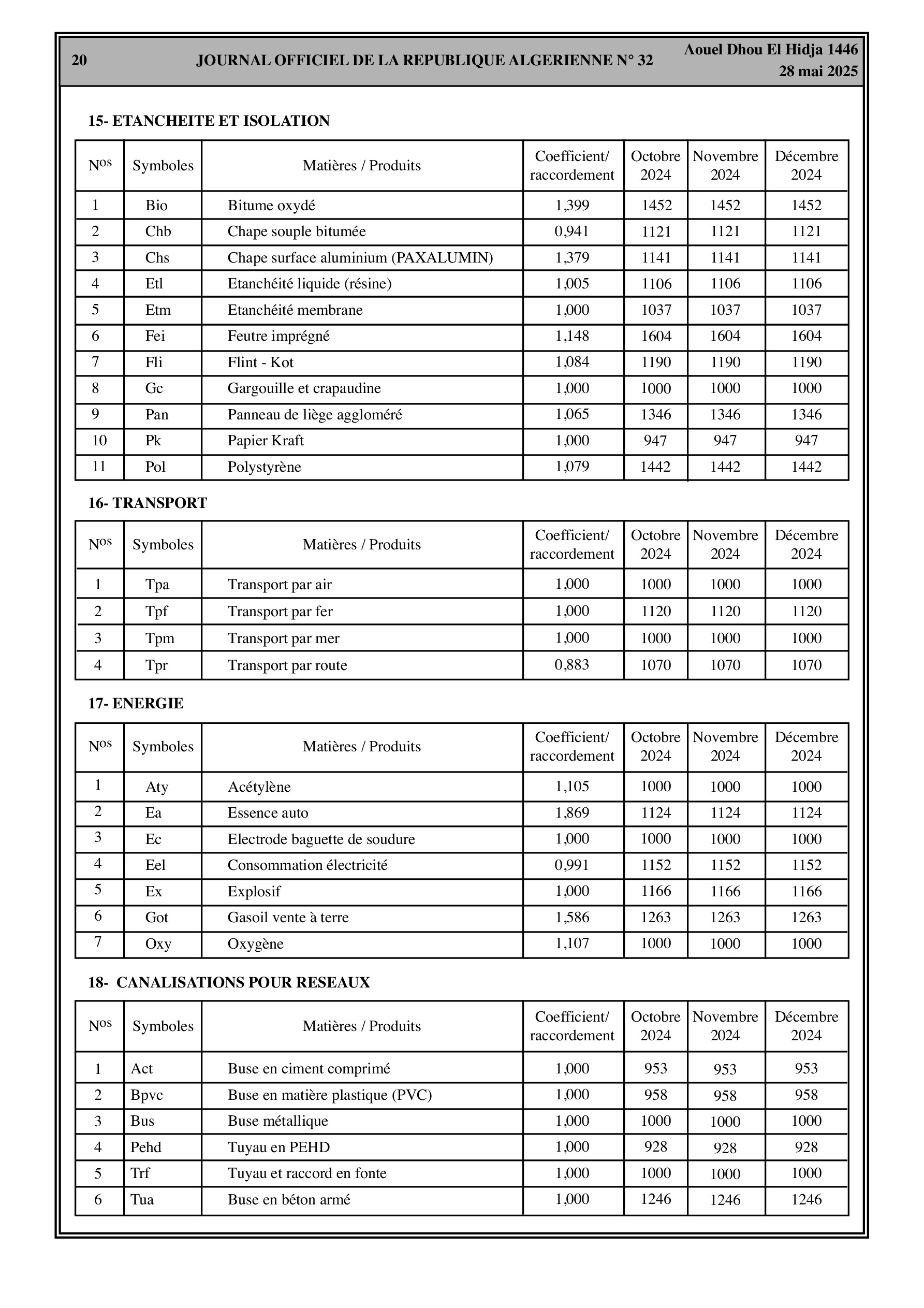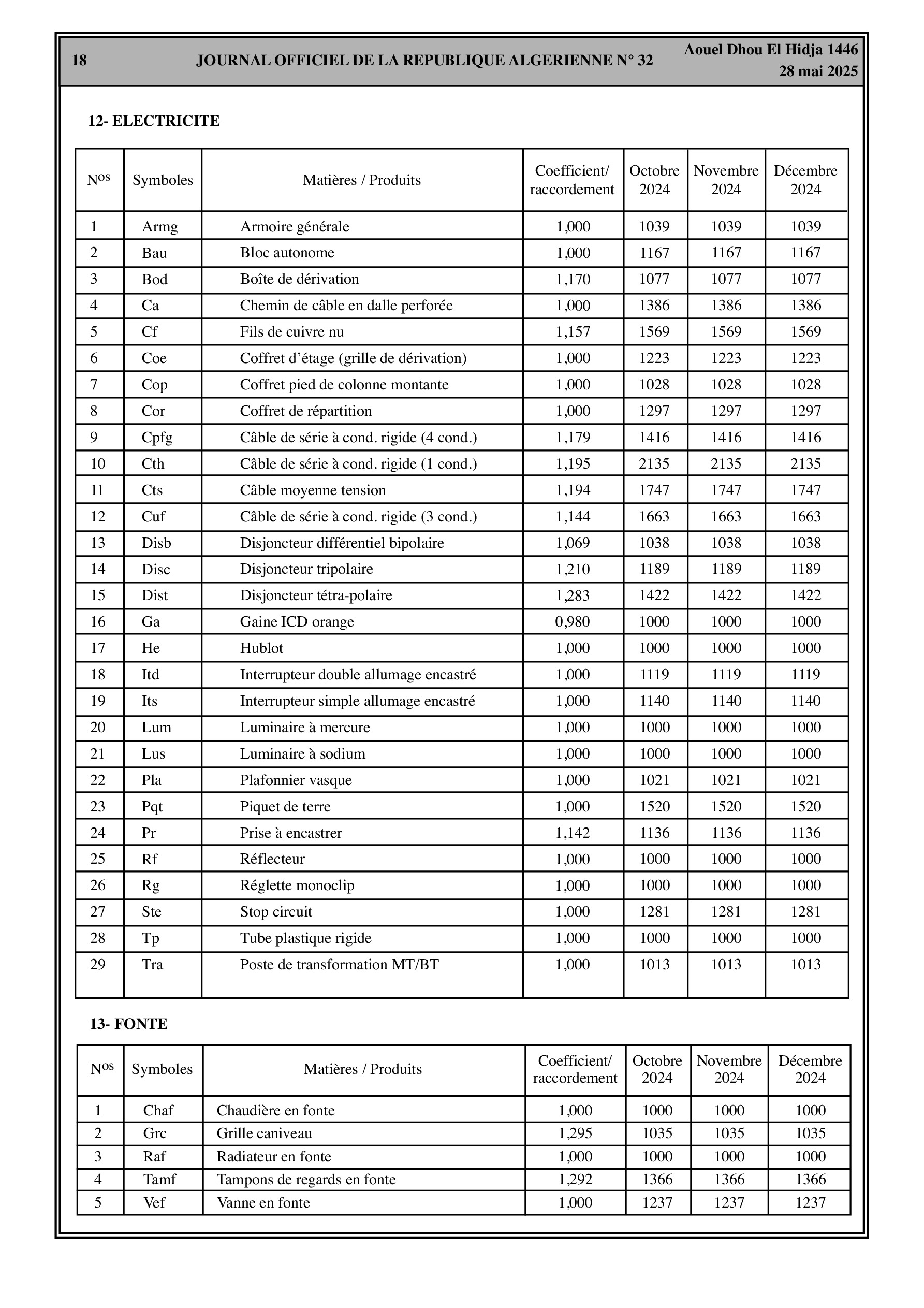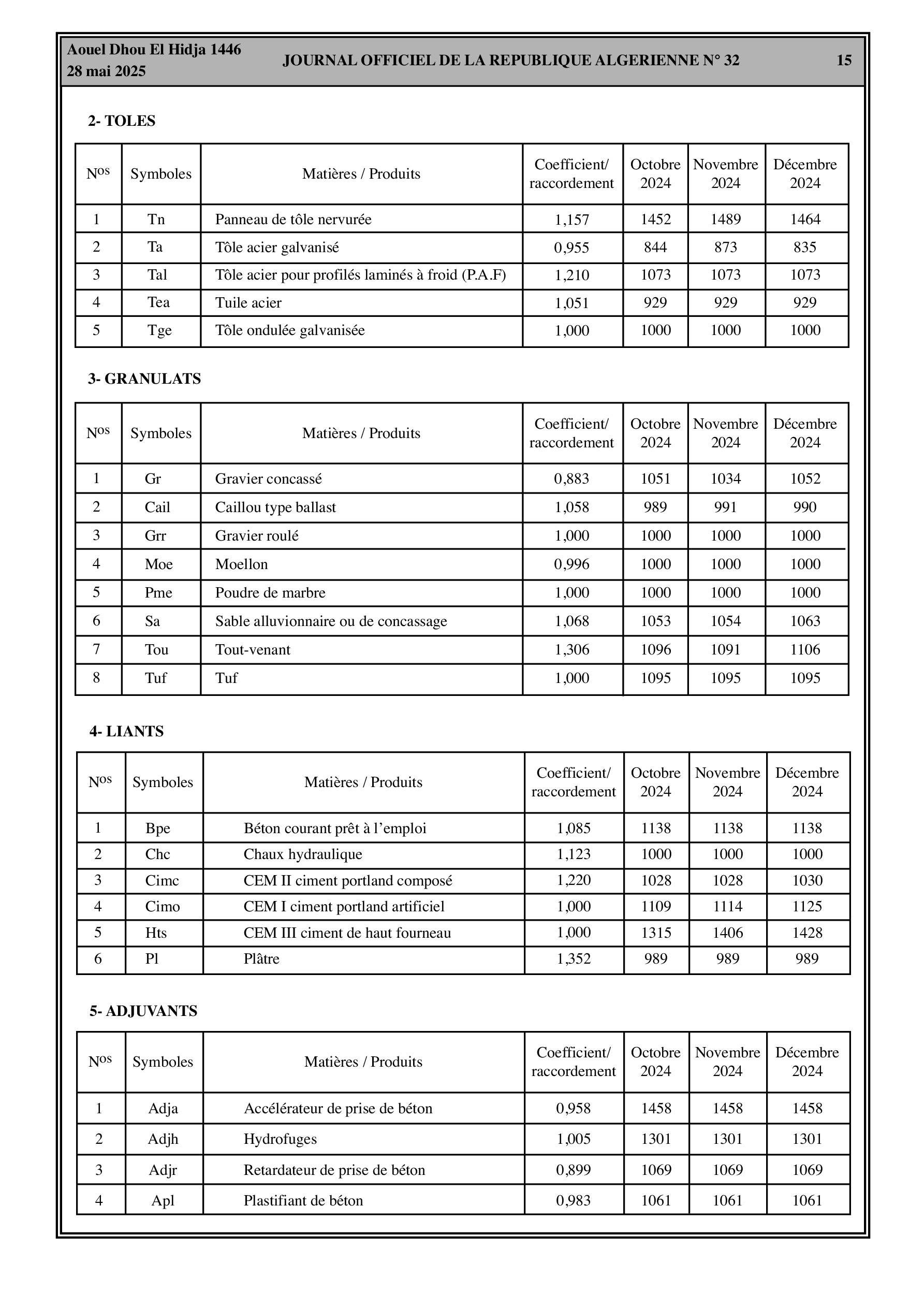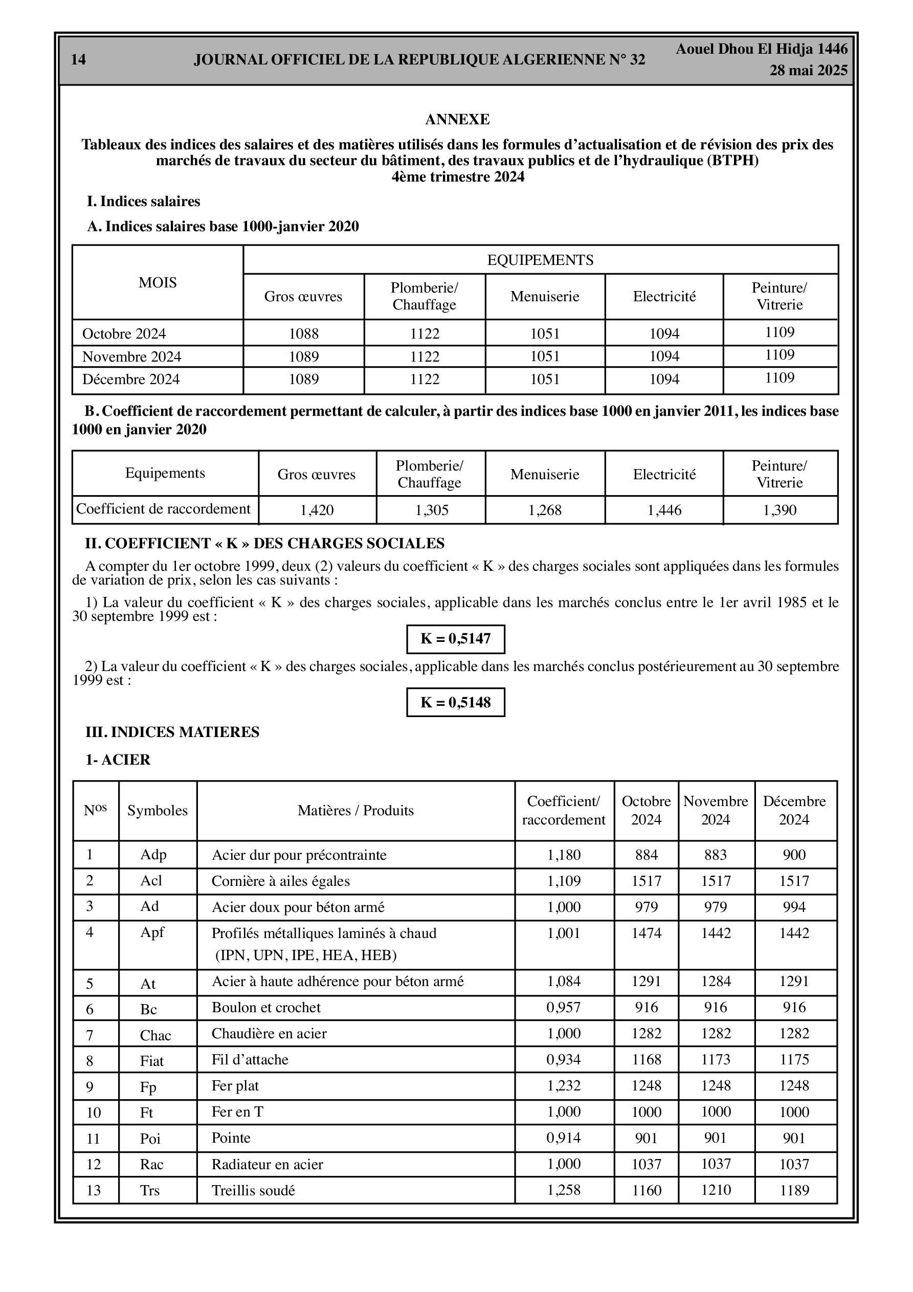 Homologation de tableaux détaillés des indices des salaires et des matières (acier, ciment, sable, etc.) pour le 4ème trimestre 2024 (p 14-21), avec des coefficients de raccordement pour calculer les nouveaux indices à partir de la base 1000 janvier 2011 et base 1000 janvier 2020. Détermination du coefficient 'K' des charges sociales applicable dans les formules de variation de prix (K=0,5147 pour les marchés conclus avant le 30 septembre 1999 et K=0,5148 pour les marchés conclus après cette date).