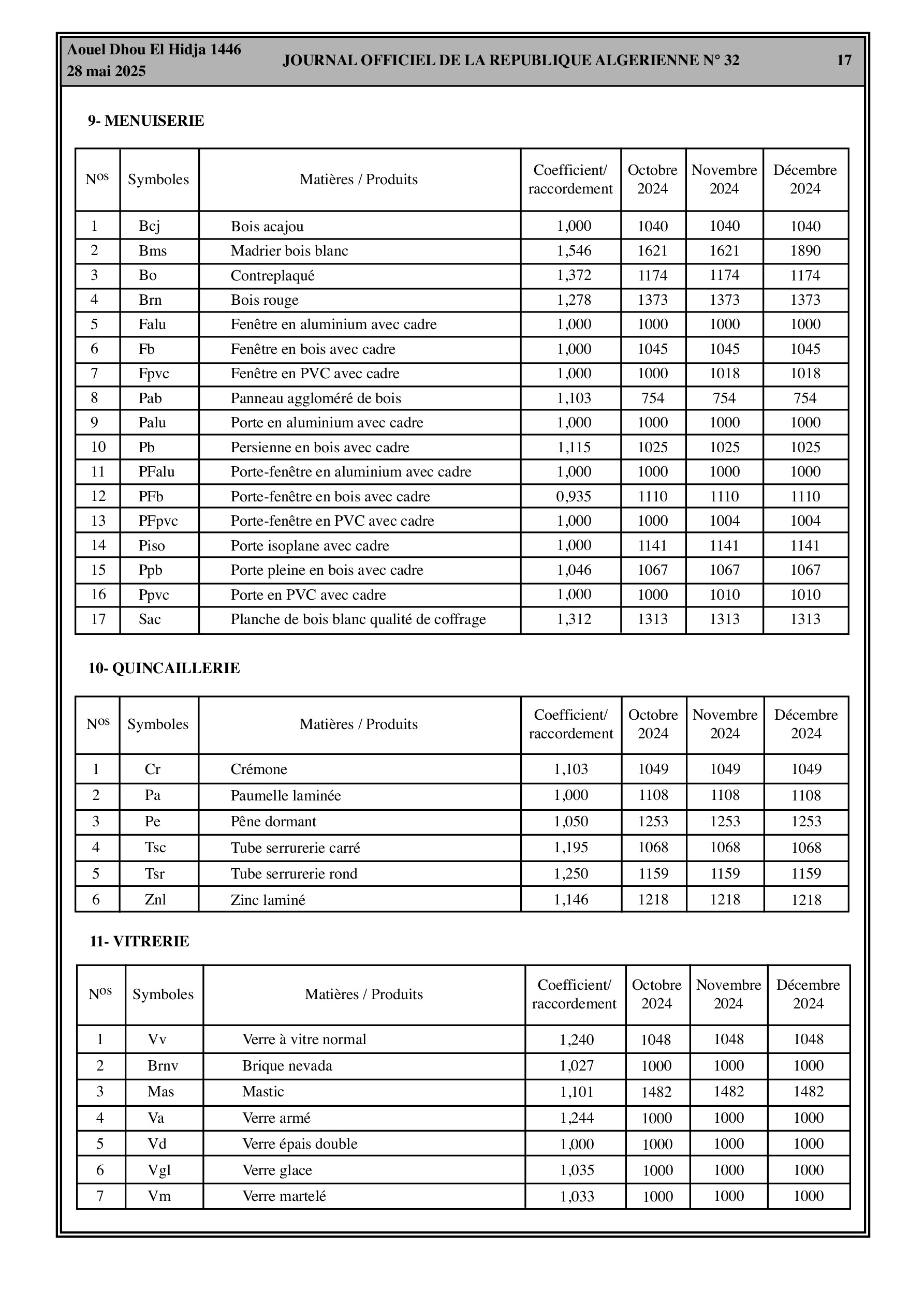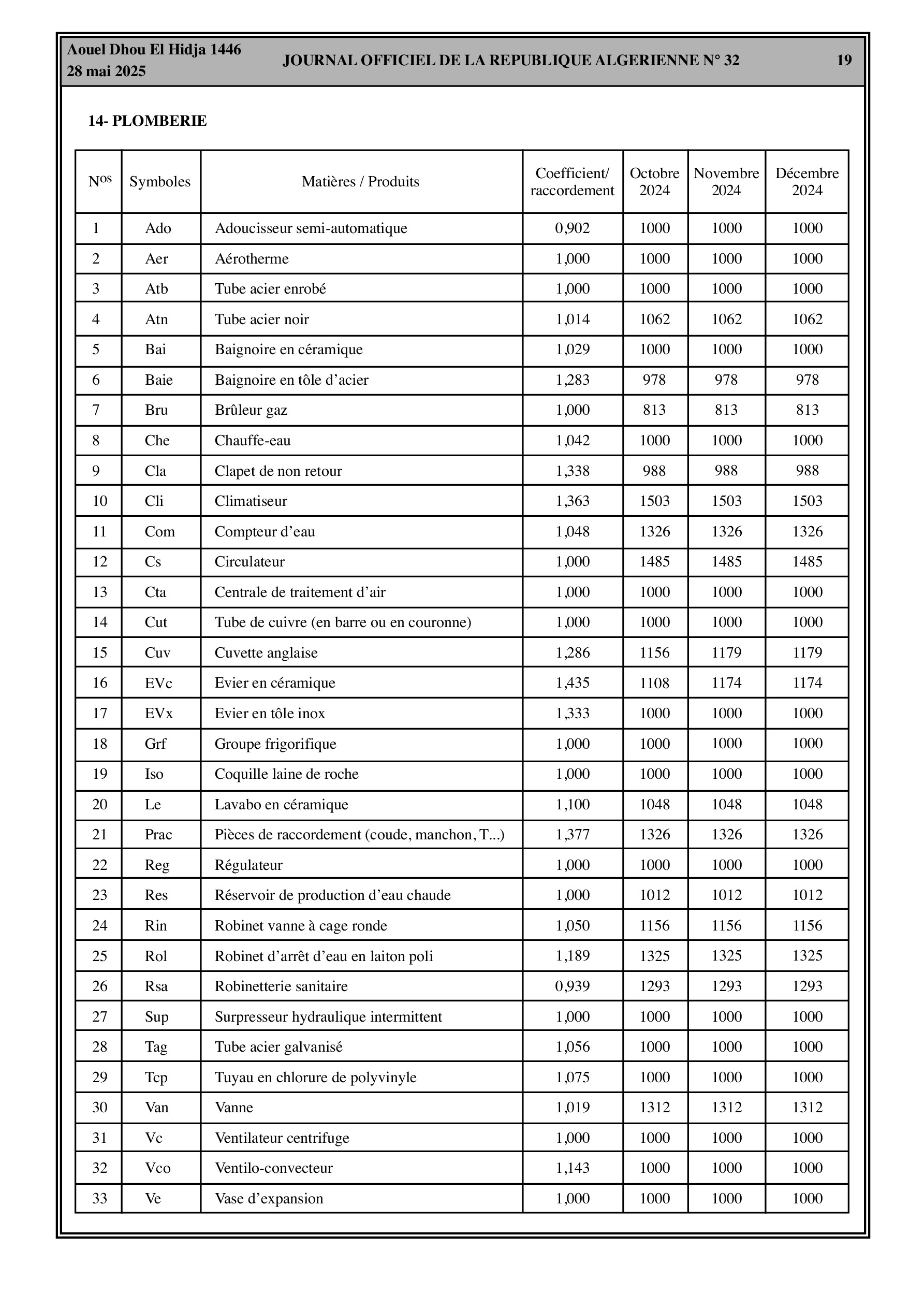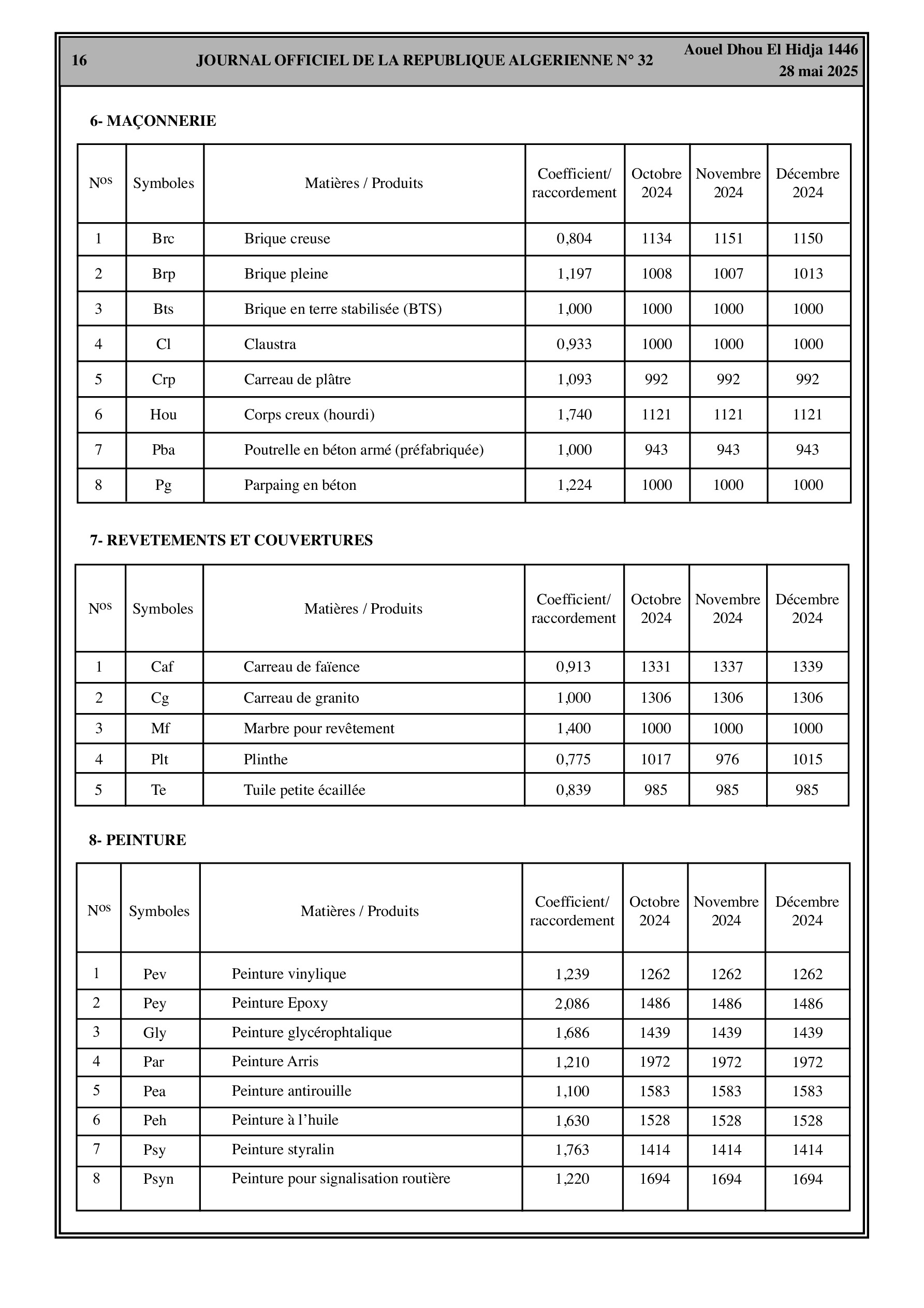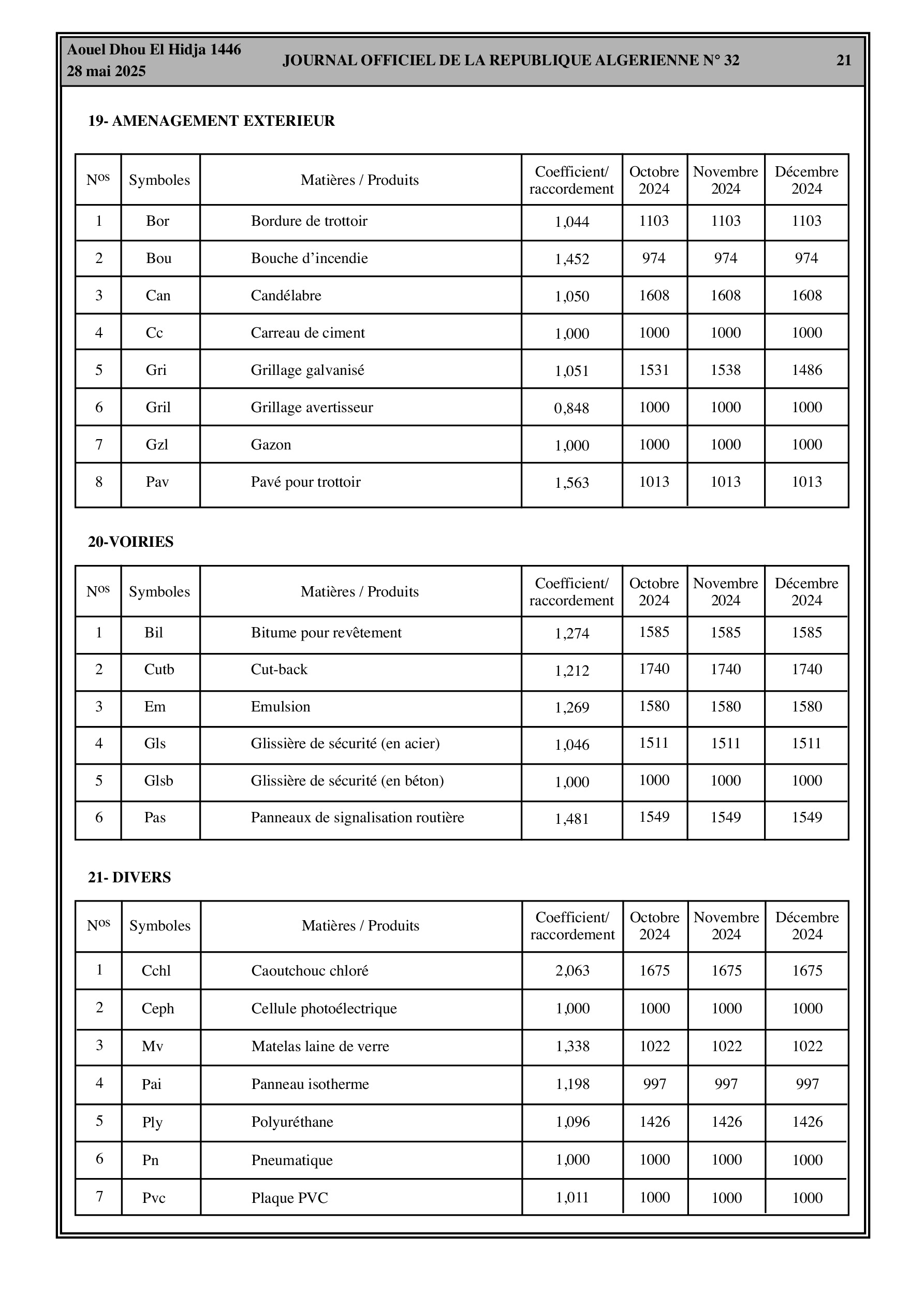 Homologation de tableaux détaillés des indices des salaires et des matières (acier, ciment, sable, etc.) pour le 4ème trimestre 2024 (p 14-21), avec des coefficients de raccordement pour calculer les nouveaux indices à partir de la base 1000 janvier 2011 et base 1000 janvier 2020. Détermination du coefficient 'K' des charges sociales applicable dans les formules de variation de prix (K=0,5147 pour les marchés conclus avant le 30 septembre 1999 et K=0,5148 pour les marchés conclus après cette date).