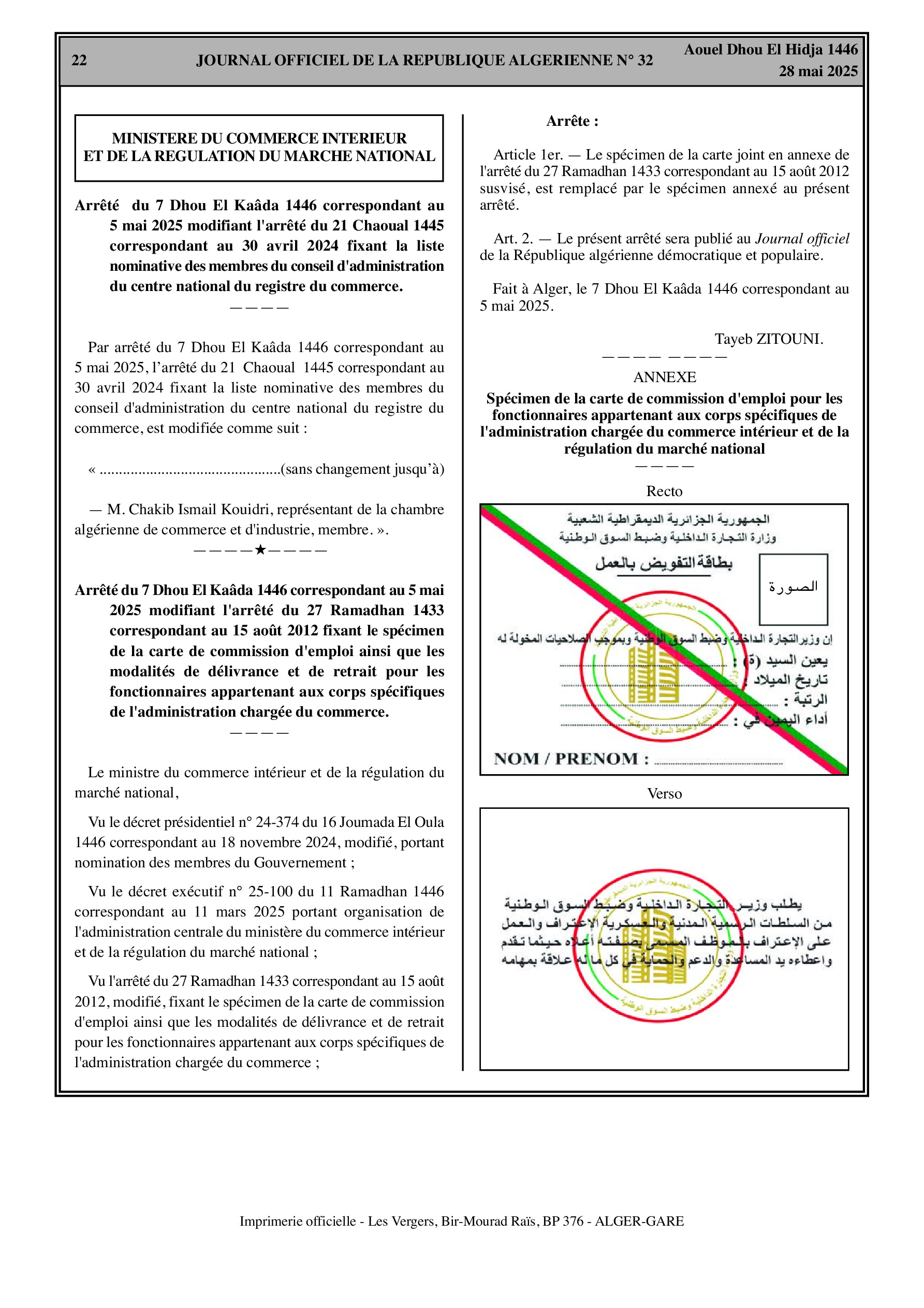 Modification de l'arrêté du 30 avril 2024 désignant M. Chakib Ismail Kouidri, représentant de la chambre algérienne de commerce et d'industrie, comme membre du conseil d'administration du Centre National du Registre du Commerce (CNRC). Modification de l'arrêté du 15 août 2012 fixant un nouveau spécimen de la carte de commission d'emploi pour les fonctionnaires du commerce, précisant son contenu et sa forme.