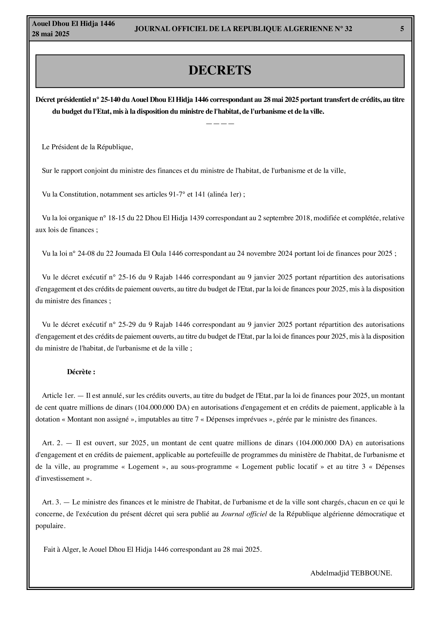 Décret présidentiel n° 25-140 du Aouel Dhou El Hidja 1446 correspondant au 28 mai 2025 portant transfert de crédits d'un montant de 104.000.000 de dinars algériens, du budget de l'Etat au profit du ministre de l'habitat, de l'urbanisme et de la ville, applicable au programme « Logement », au sous-programme « Logement public locatif » au titre des dépenses d'investissement.
