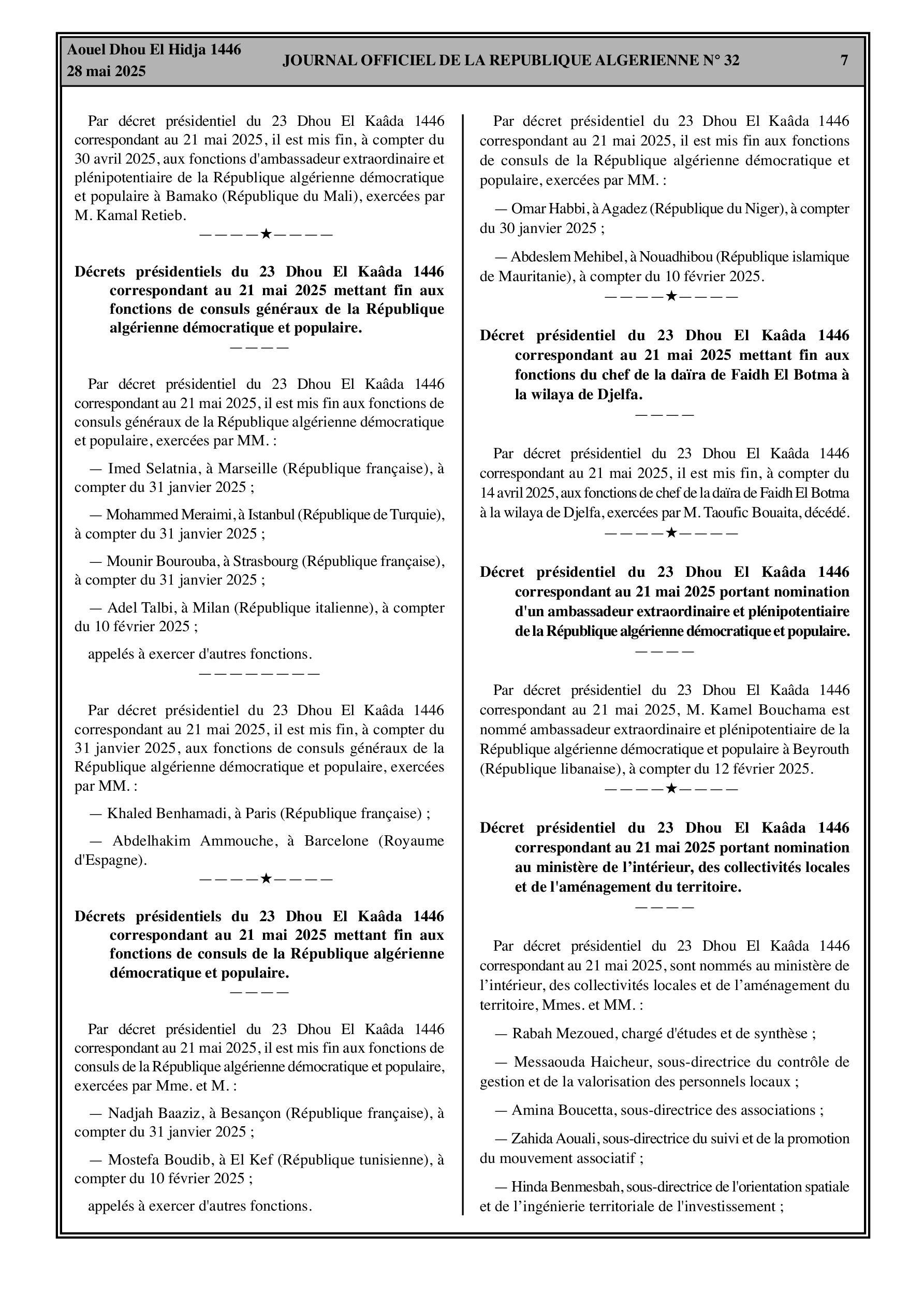 Fins de fonctions d'ambassadeurs et consuls (p 6-7), nomination d'un nouvel ambassadeur (p 7), fins de fonctions et nominations au ministère de l'Intérieur et des Collectivités locales (p 7-8), fins de fonctions à l'ex-ministère de l'Energie et des Mines (p 8), fins de fonctions de chefs de cabinet de walis et d'une inspectrice à la wilaya d'Alger (p 8), fins de fonctions de directeurs de la protection civile, d'un inspecteur au ministère des Moudjahidine et d'un ex-directeur des moudjahidine (p 9), fin de fonctions d'un directeur de l'éducation (p 9), fins de fonctions au ministère de la Formation et de l'Enseignement professionnels, de directeurs de la culture et d'un directeur d'institut national (p 9), fins de fonctions de directeurs des transports, de directeurs et chargé d'études au ministère du Tourisme, et de directeurs délégués de la santé et de la population (p 10), nominations au ministère de l'Enseignement supérieur, au ministère de la Culture, et de directeurs de la culture, des transports, du tourisme et de la santé (p 10-11).