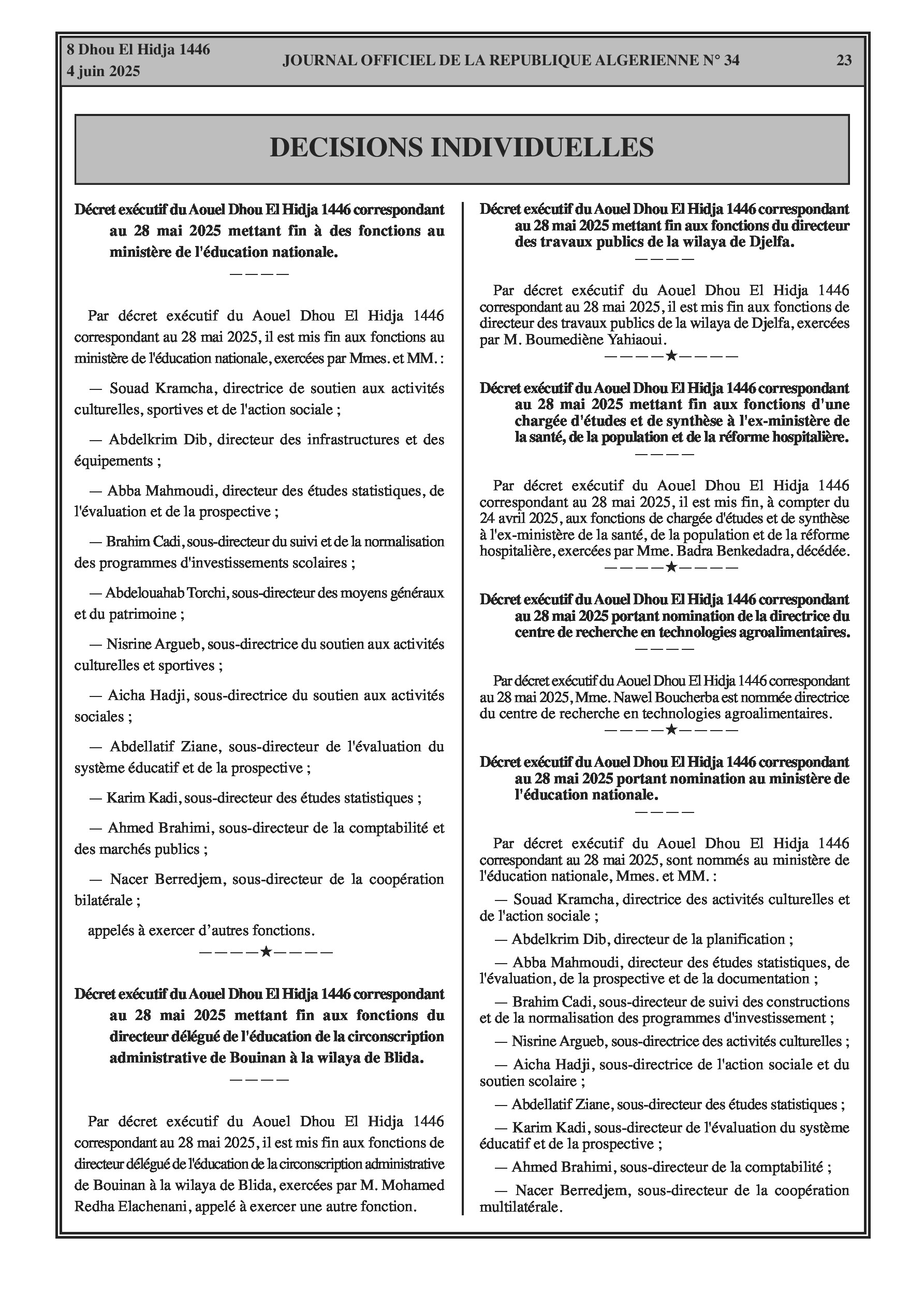 Décrets exécutifs concernant des fins de fonctions et de nouvelles nominations de responsables au ministère de l'éducation nationale, ex-ministère de la santé, et autres secteurs.