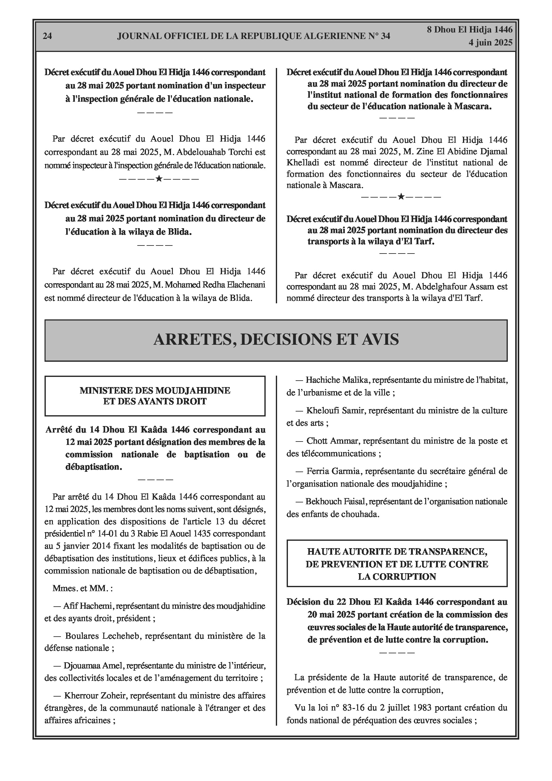 Décision de la présidente de la Haute autorité de transparence, de prévention et de lutte contre la corruption portant création de la commission des œuvres sociales de l'Autorité.