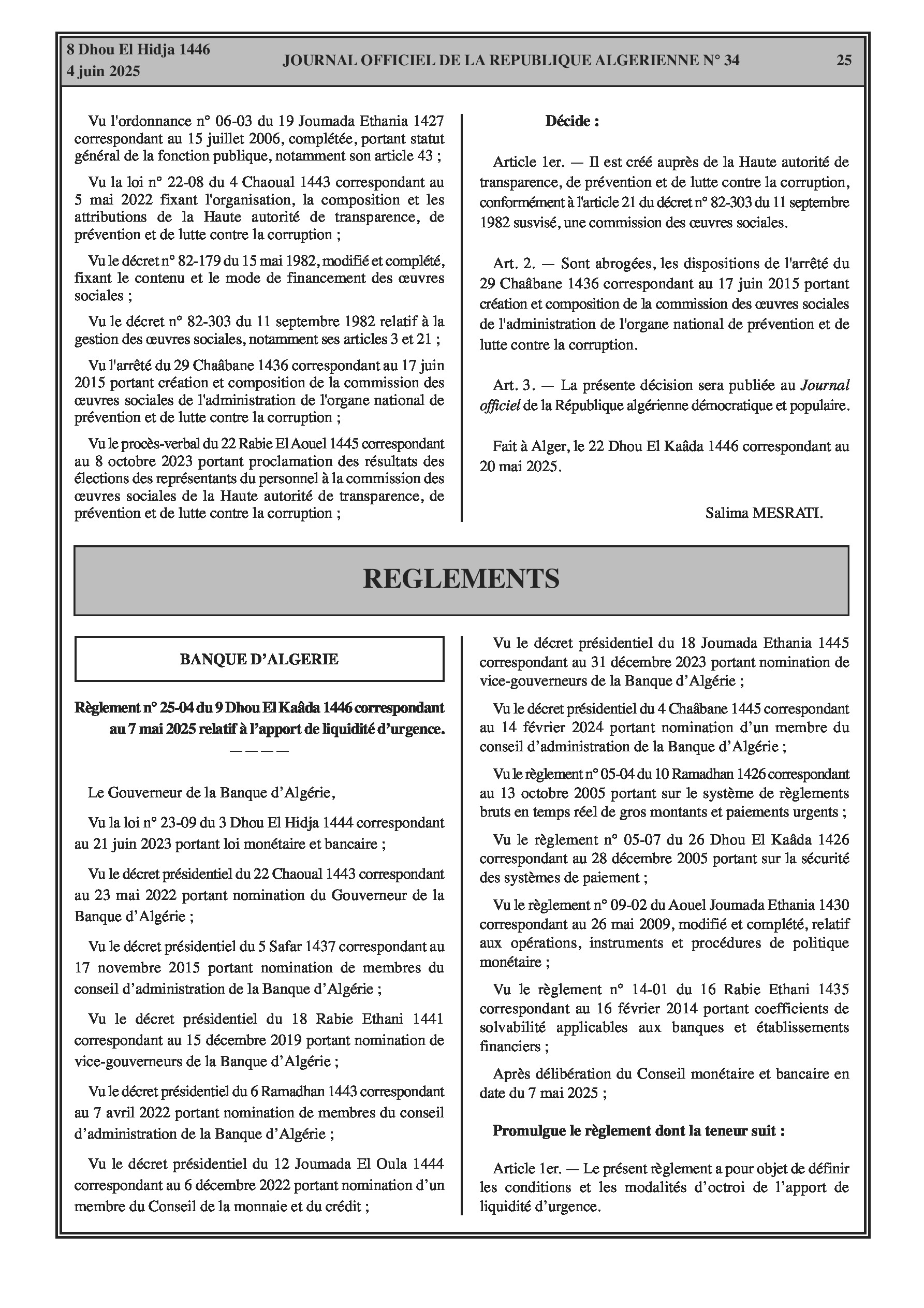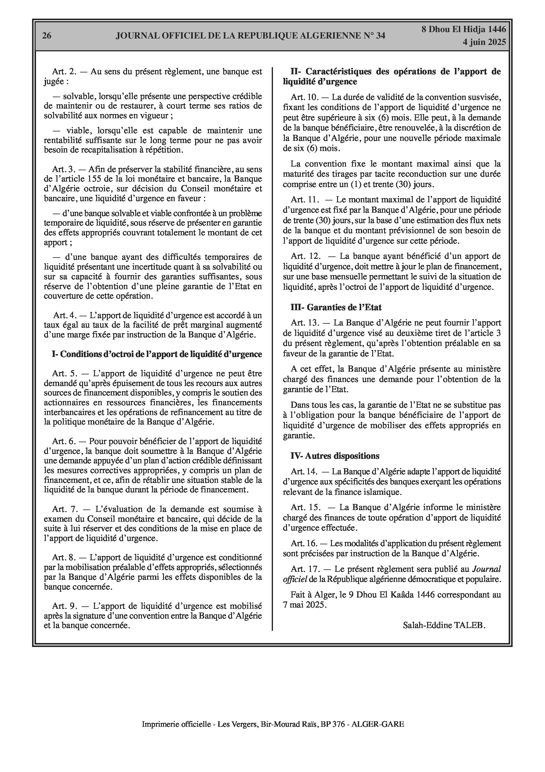Nouveau règlement de la Banque d'Algérie définissant les conditions et modalités d'octroi de l'apport de liquidité d'urgence aux banques pour préserver la stabilité financière.