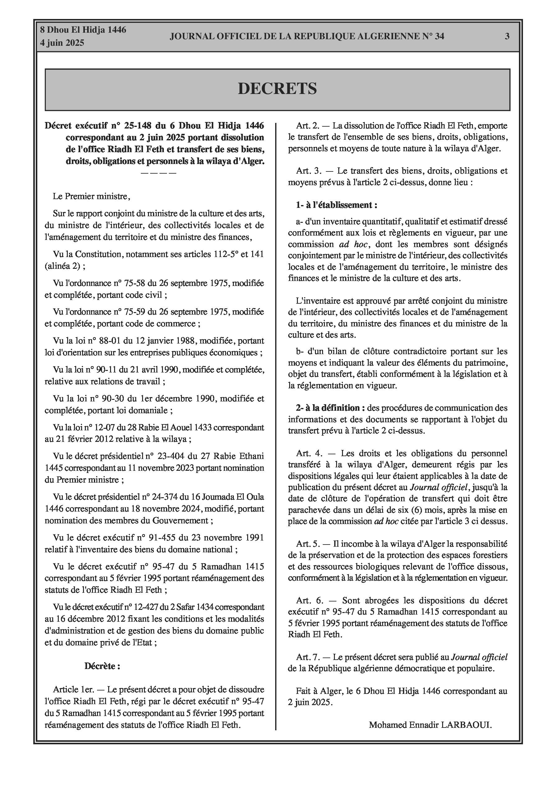 Décret exécutif portant dissolution de l'office Riadh El Feth et transfert de l'ensemble de ses biens, droits, obligations et personnels à la wilaya d'Alger.