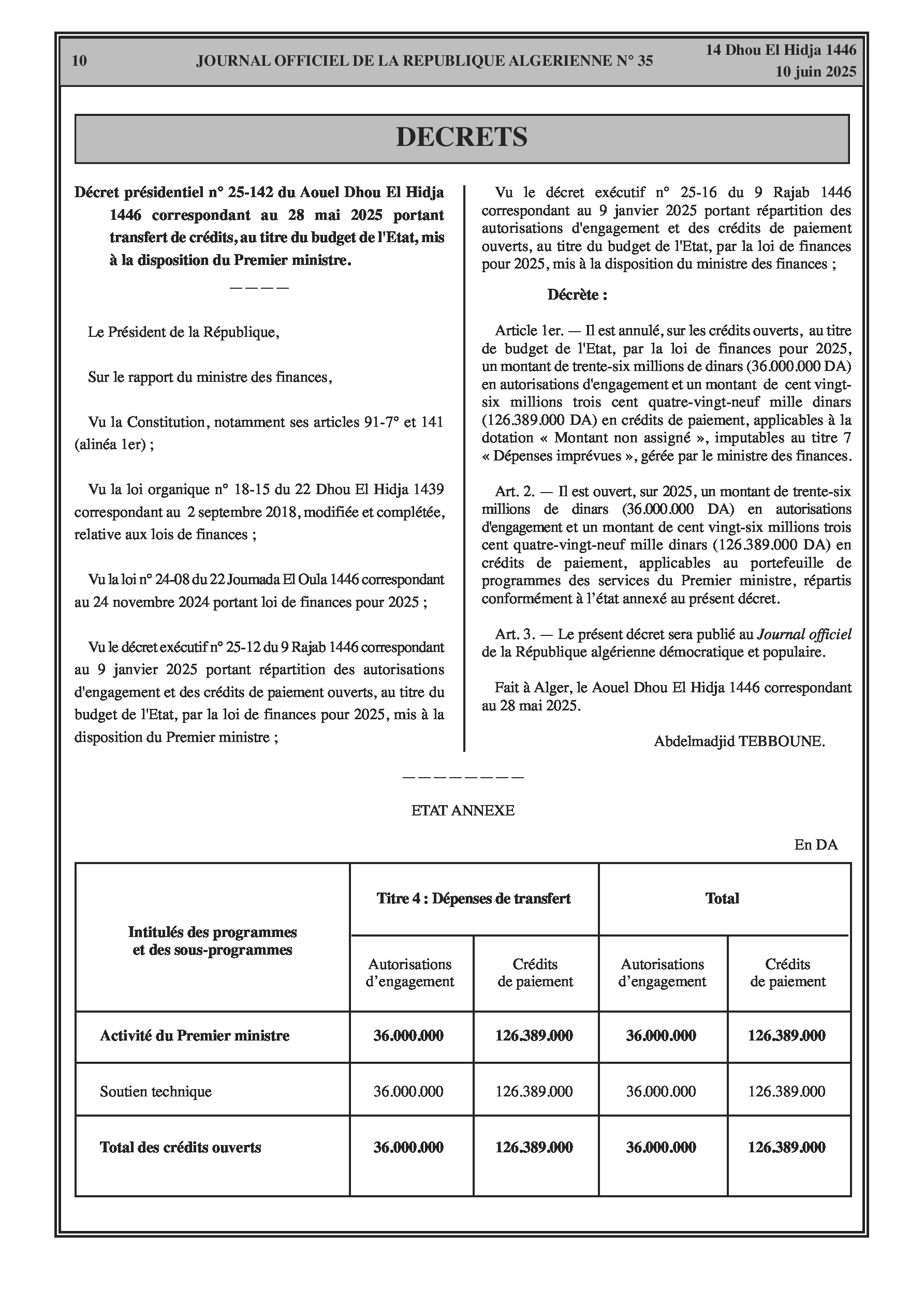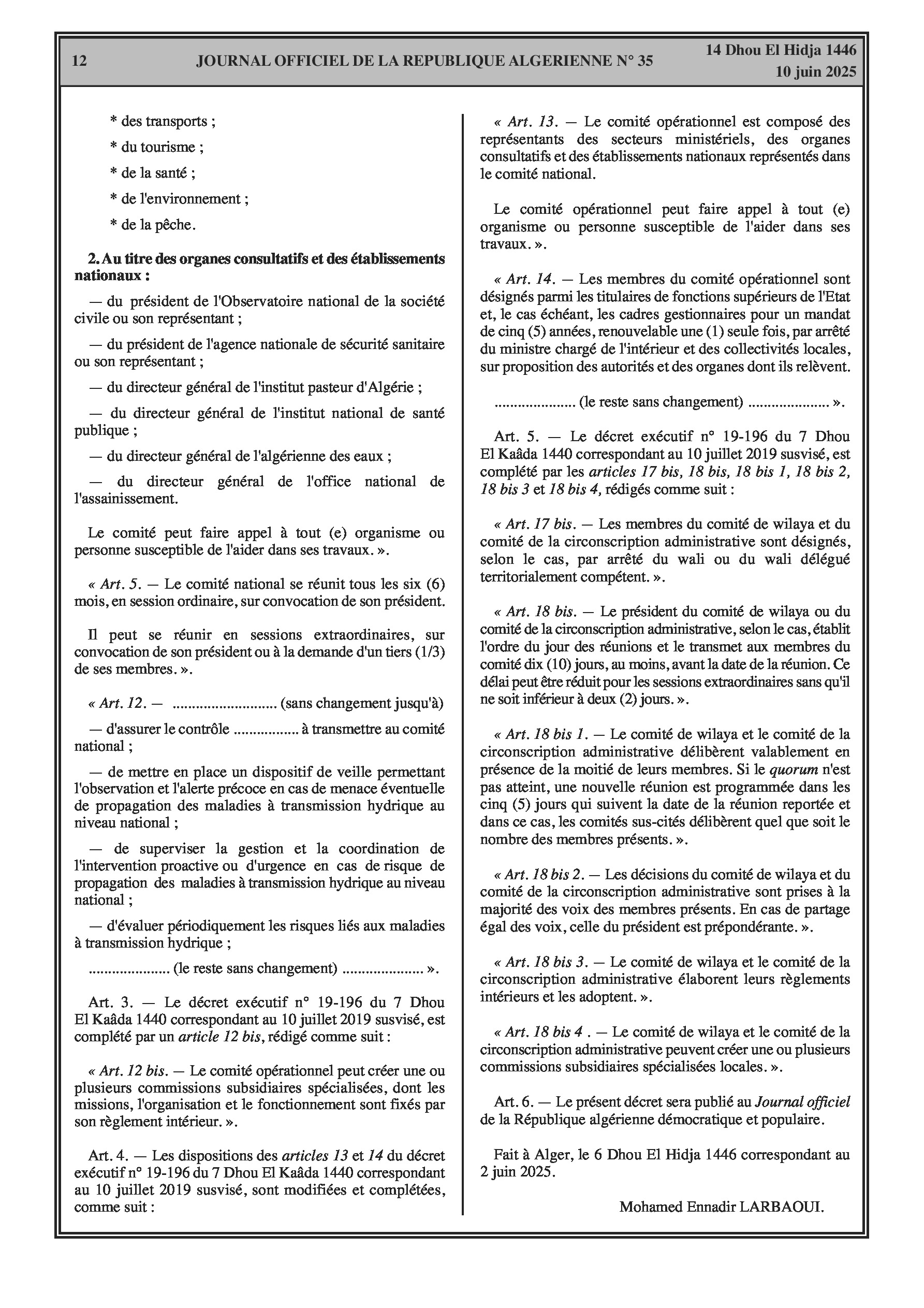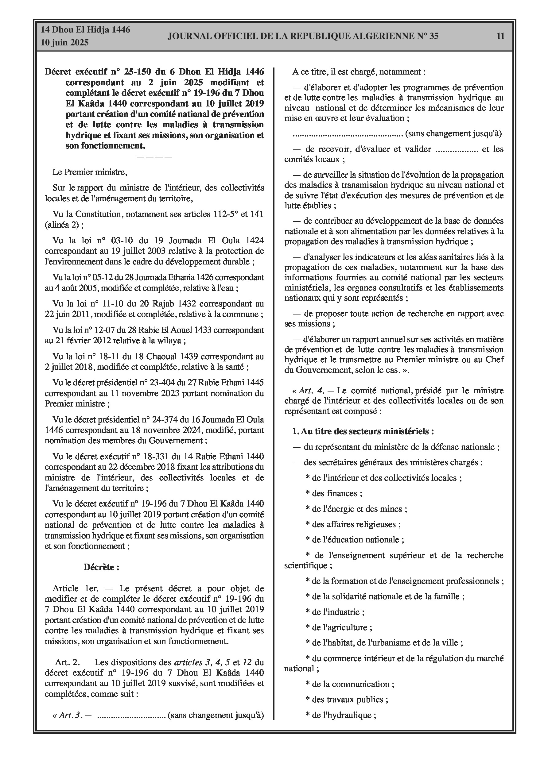 Le décret présidentiel n° 25-142 autorise des transferts de crédits au sein du budget de l'État pour 2025, réallouant des fonds pour les services du Premier ministre. Le décret exécutif n° 25-150 modifie et complète le décret n° 19-196 relatif à la création, aux missions, à l'organisation et au fonctionnement du comité national de prévention et de lutte contre les maladies à transmission hydrique, renforçant son cadre opérationnel et sa représentation.