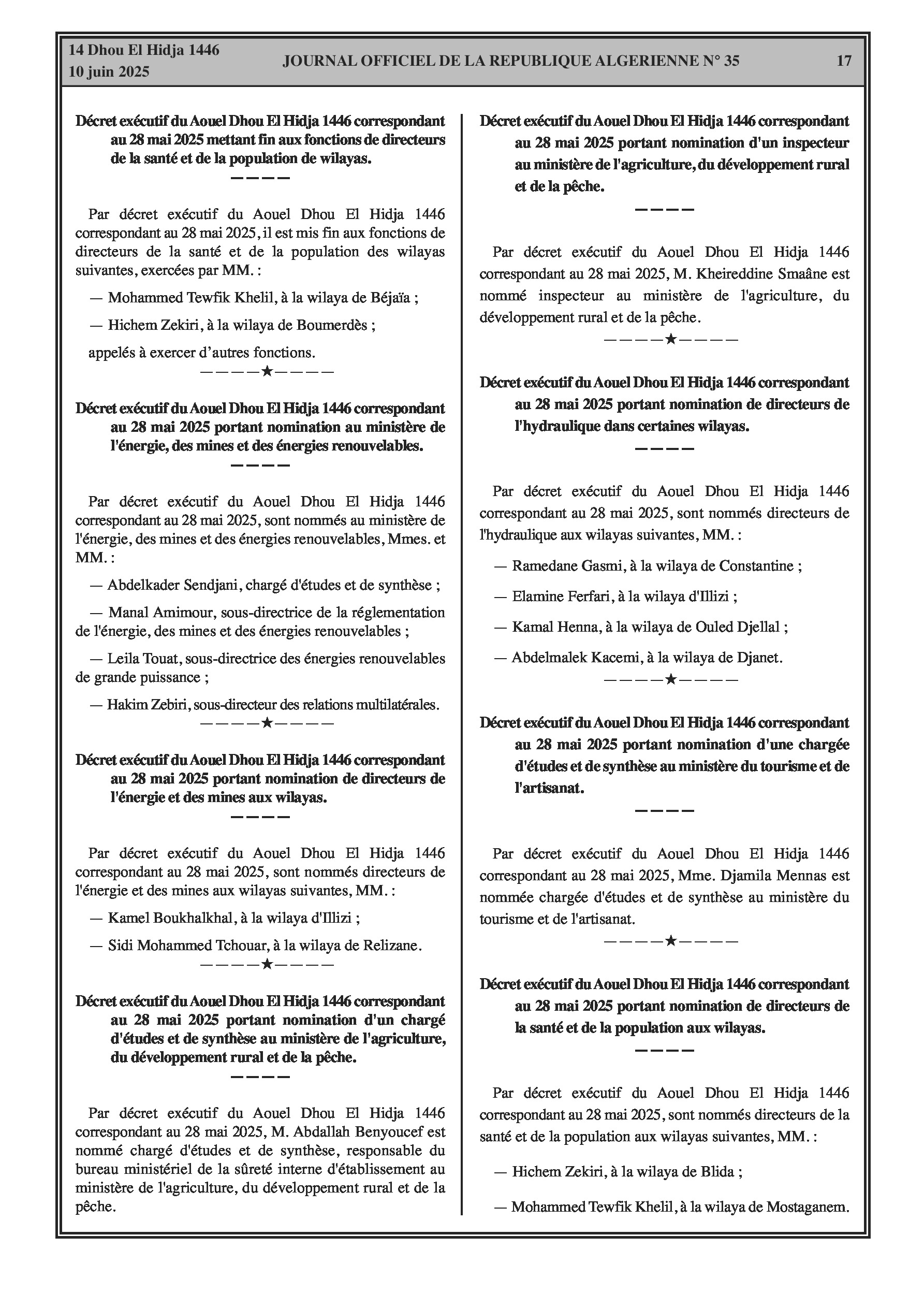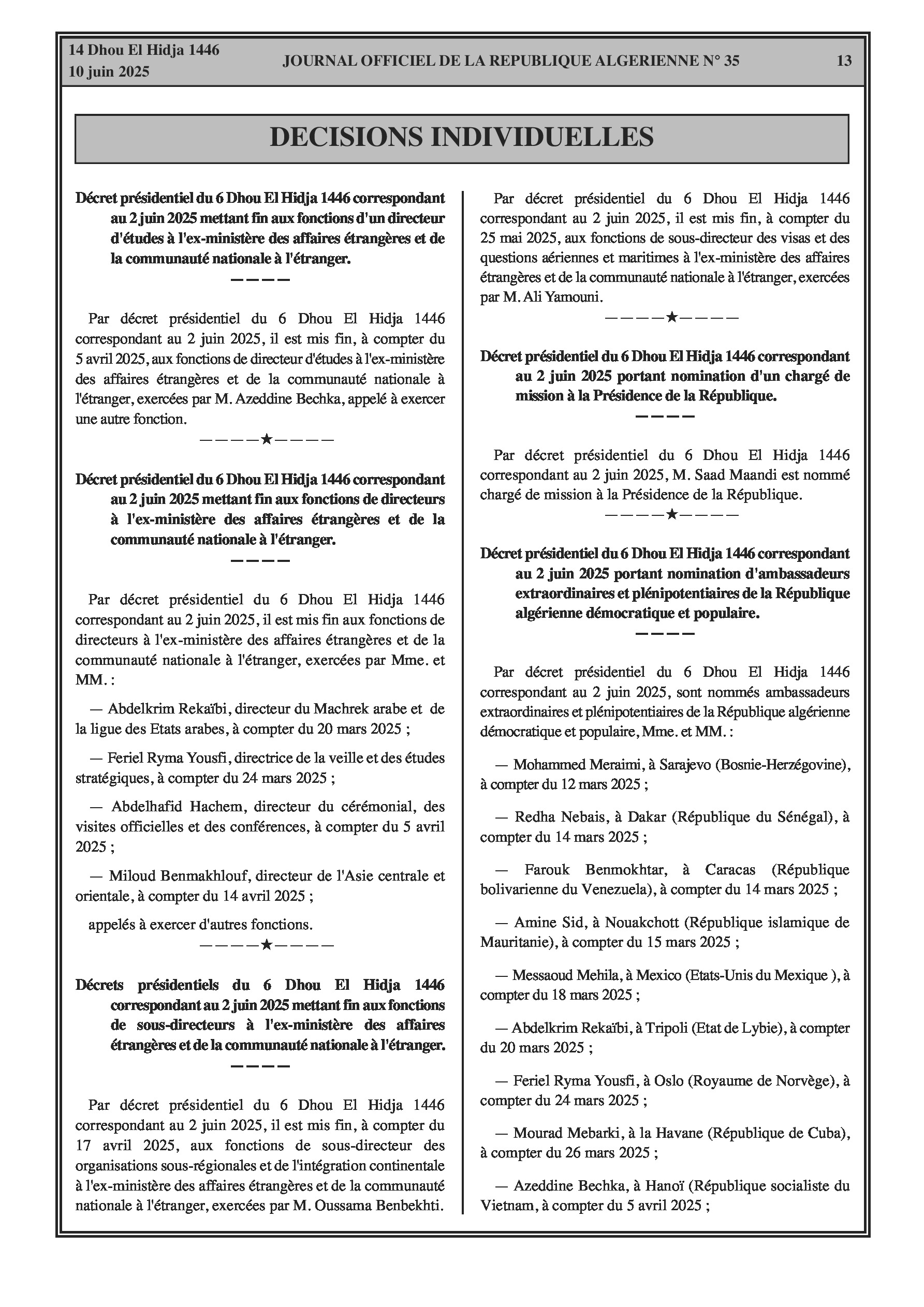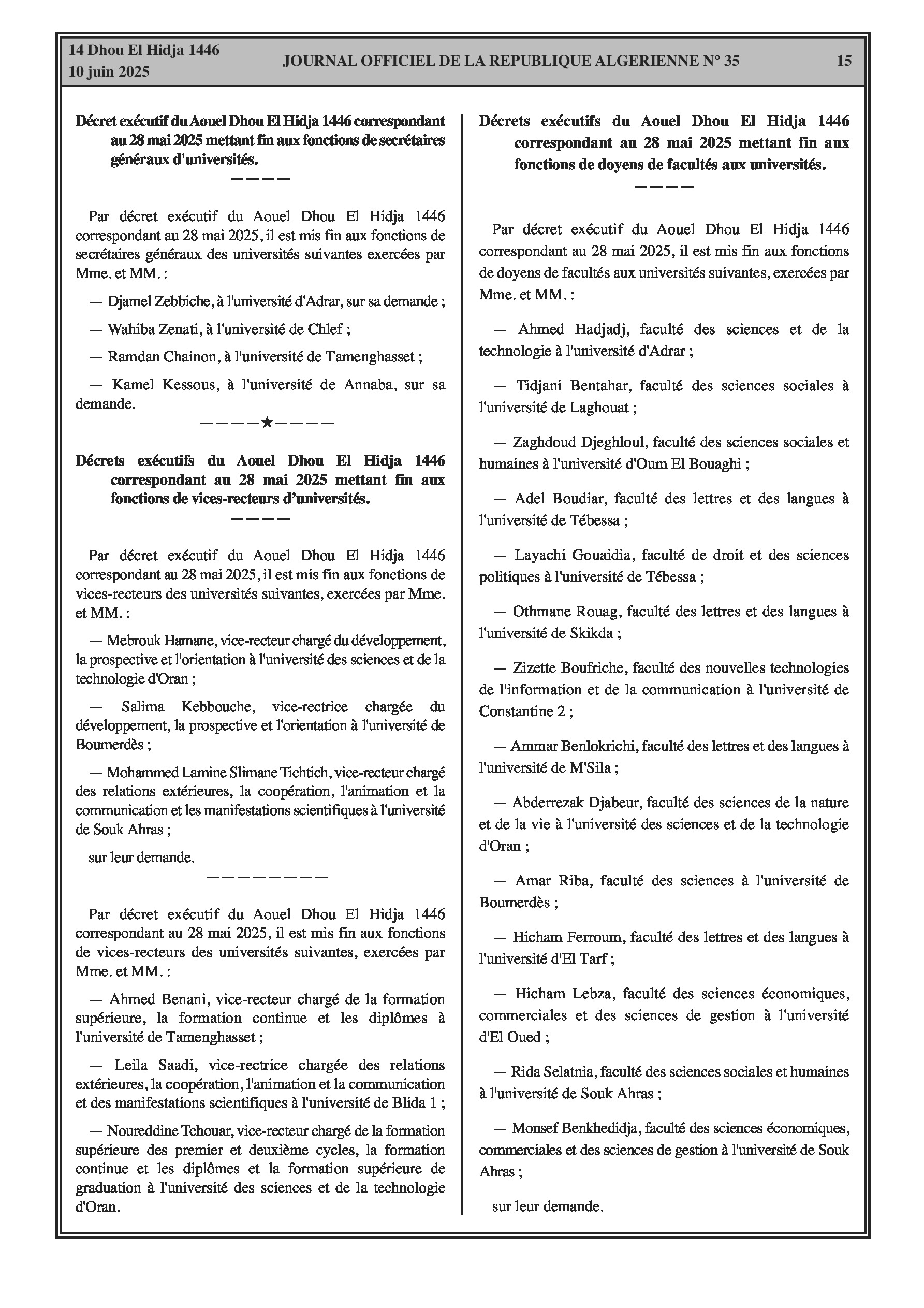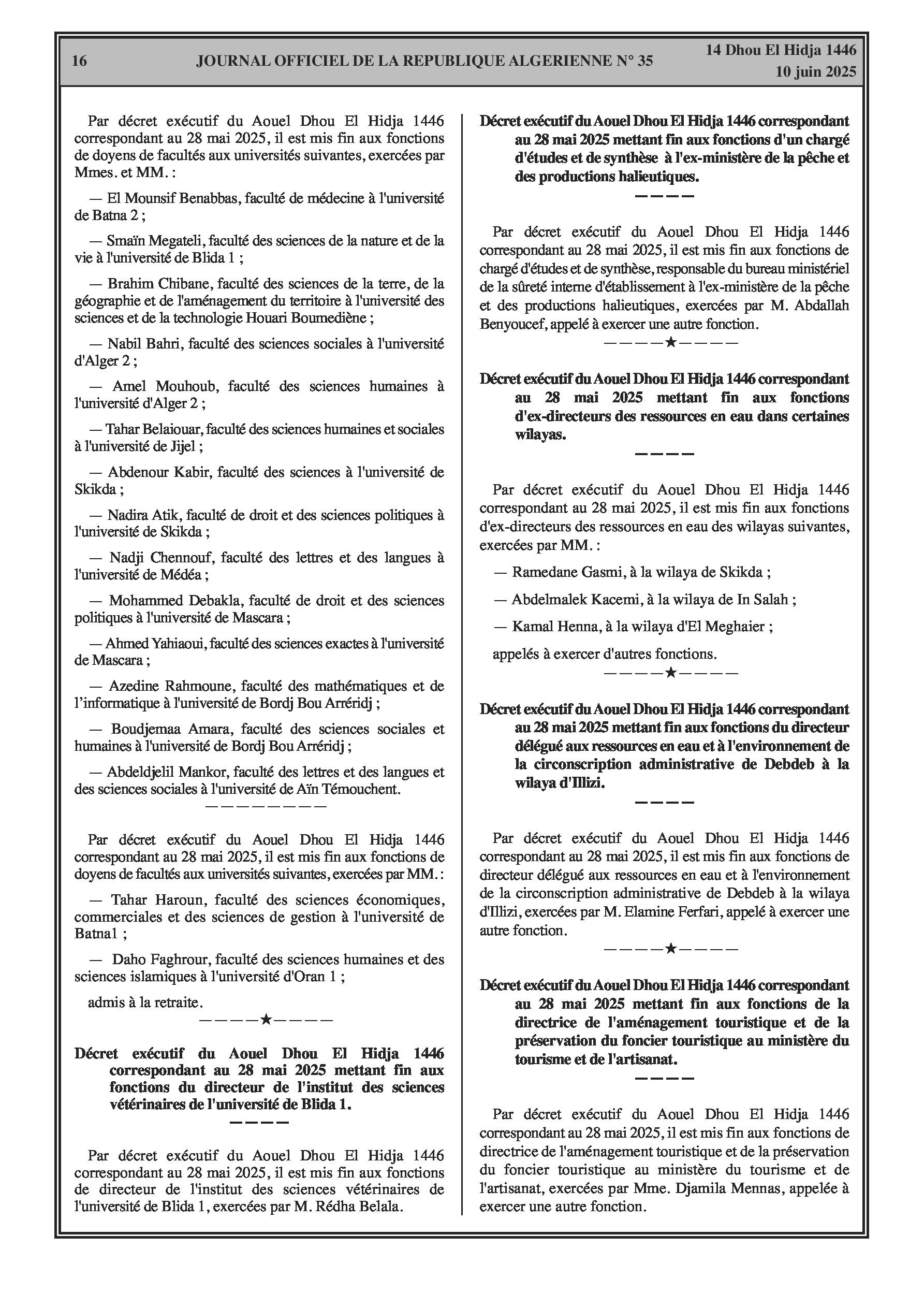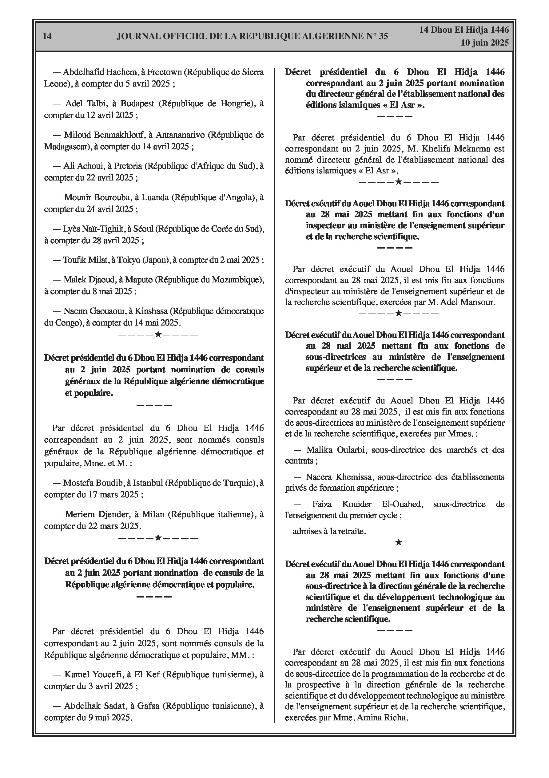 Plusieurs décrets annoncent d'importants mouvements de personnel, incluant des fins de fonctions et de nouvelles nominations pour : des Directeurs, Sous-directeurs, Ambassadeurs et Consuls au sein du ministère des Affaires étrangères ; le Directeur général de la maison d'édition islamique 'El Asr' ; un Inspecteur, des Sous-directrices, des Secrétaires généraux d'universités, des Vice-recteurs et des Doyens dans le secteur de l'Enseignement supérieur. De plus, des changements au niveau des directions (fins de fonctions et nominations) sont signalés dans les secteurs des sciences vétérinaires, de la pêche, des ressources en eau, du tourisme, de l'énergie, de l'agriculture et des directions régionales de la santé.
