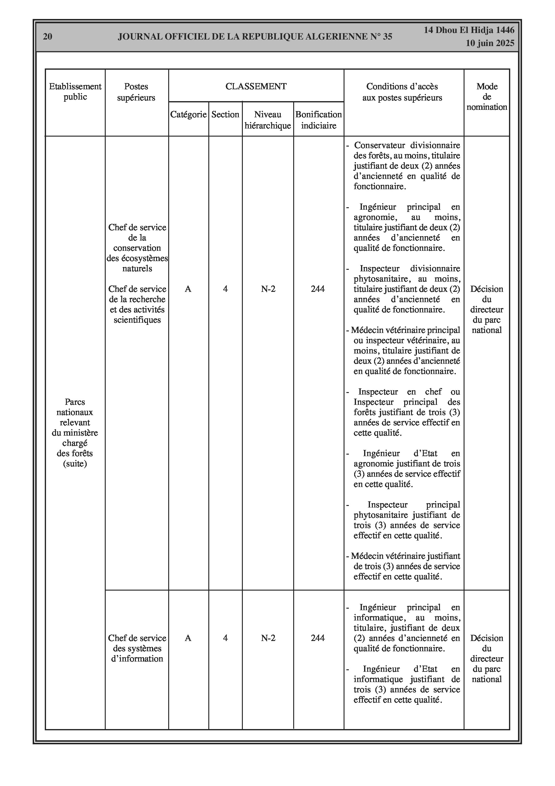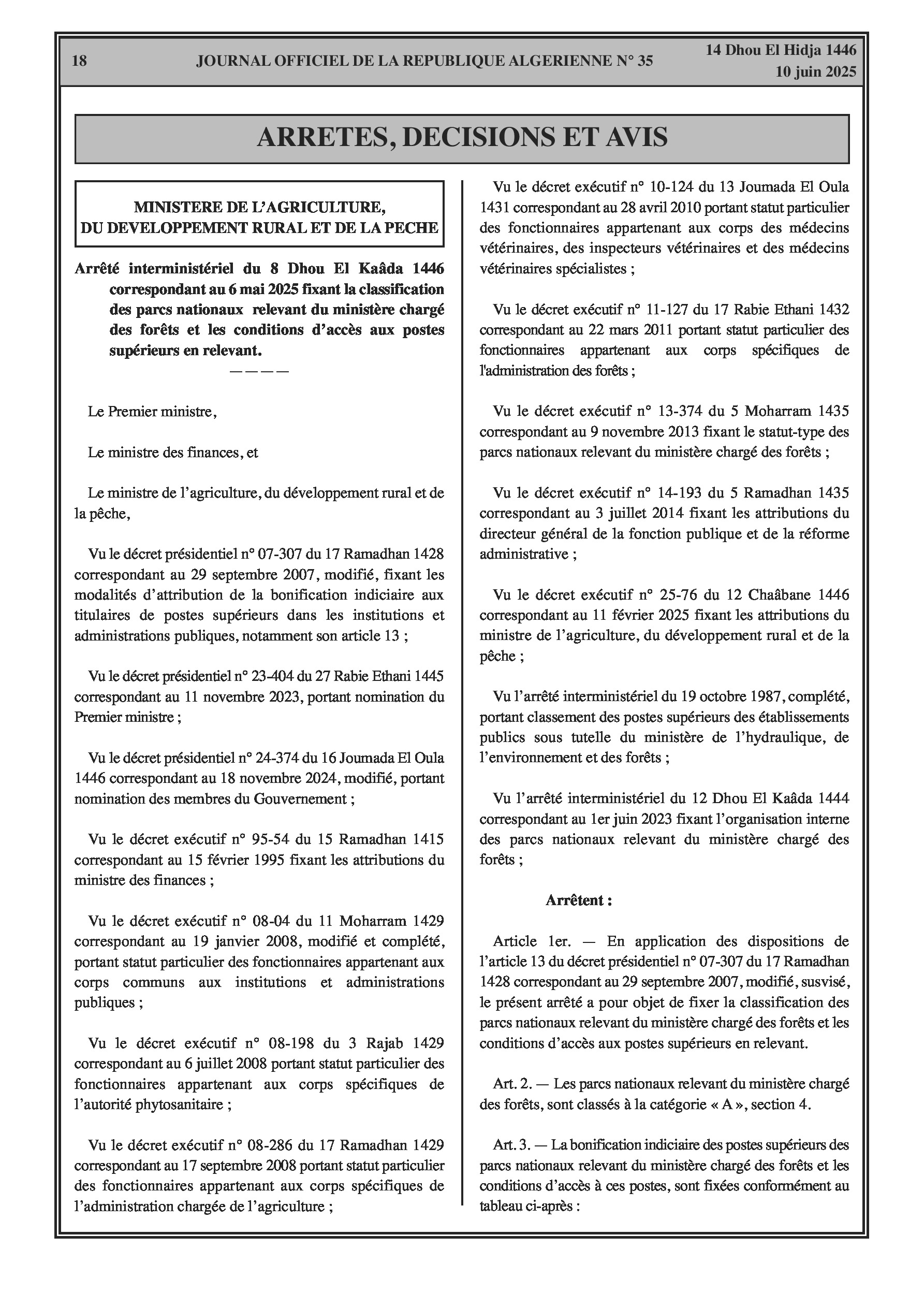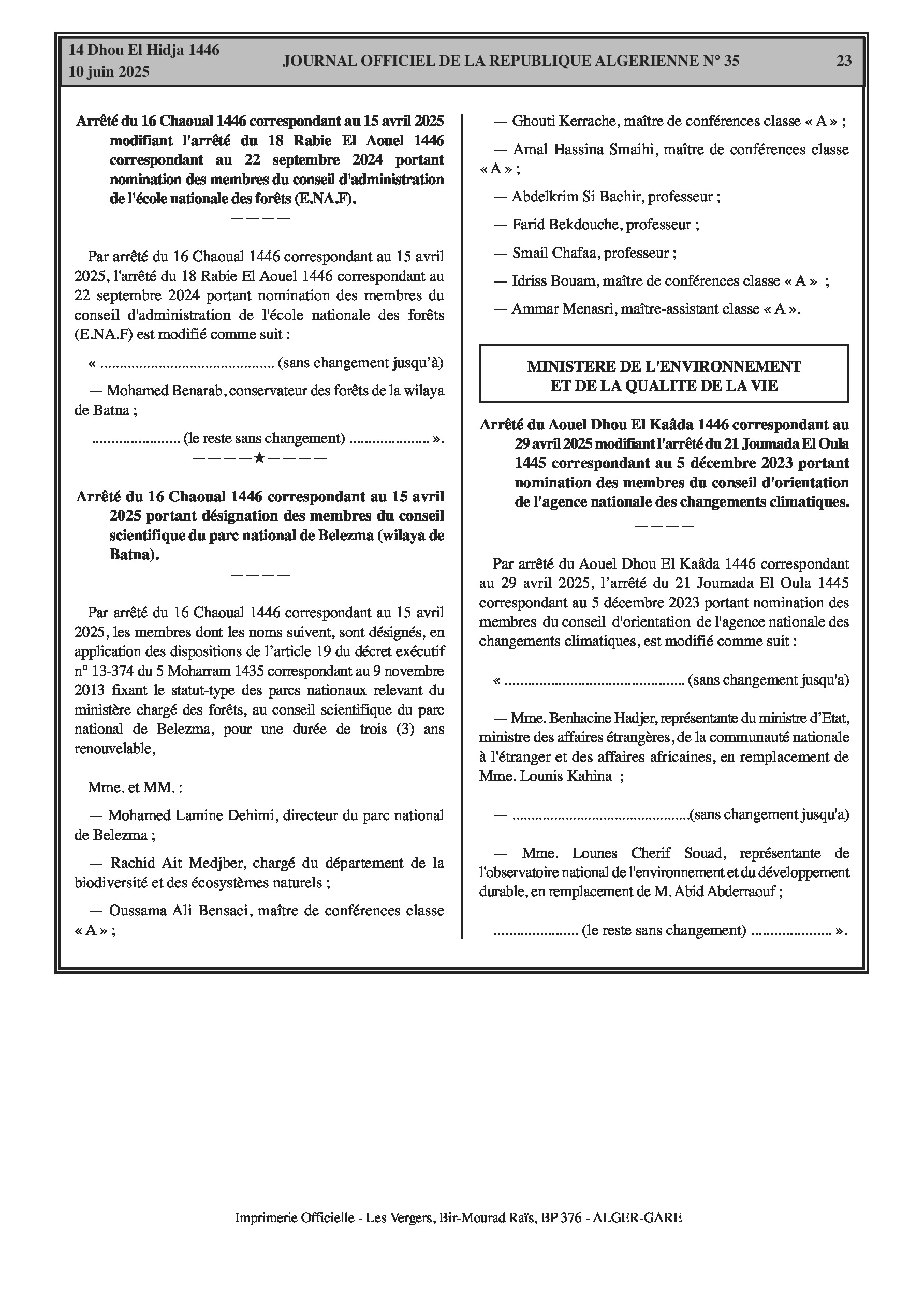 Un arrêté interministériel (Ministère de l'Agriculture) fixe la classification des parcs nationaux relevant du ministère chargé des forêts et les conditions d'accès aux postes supérieurs y afférents (pages 18-22). Un arrêté modifie la liste des membres du conseil d'administration de l'École Nationale des Forêts (E.NA.F). Un autre arrêté désigne les membres du conseil scientifique du parc national de Belezma (Batna). Enfin, un arrêté modifie les membres du conseil d'orientation de l'Agence Nationale des Changements Climatiques.
