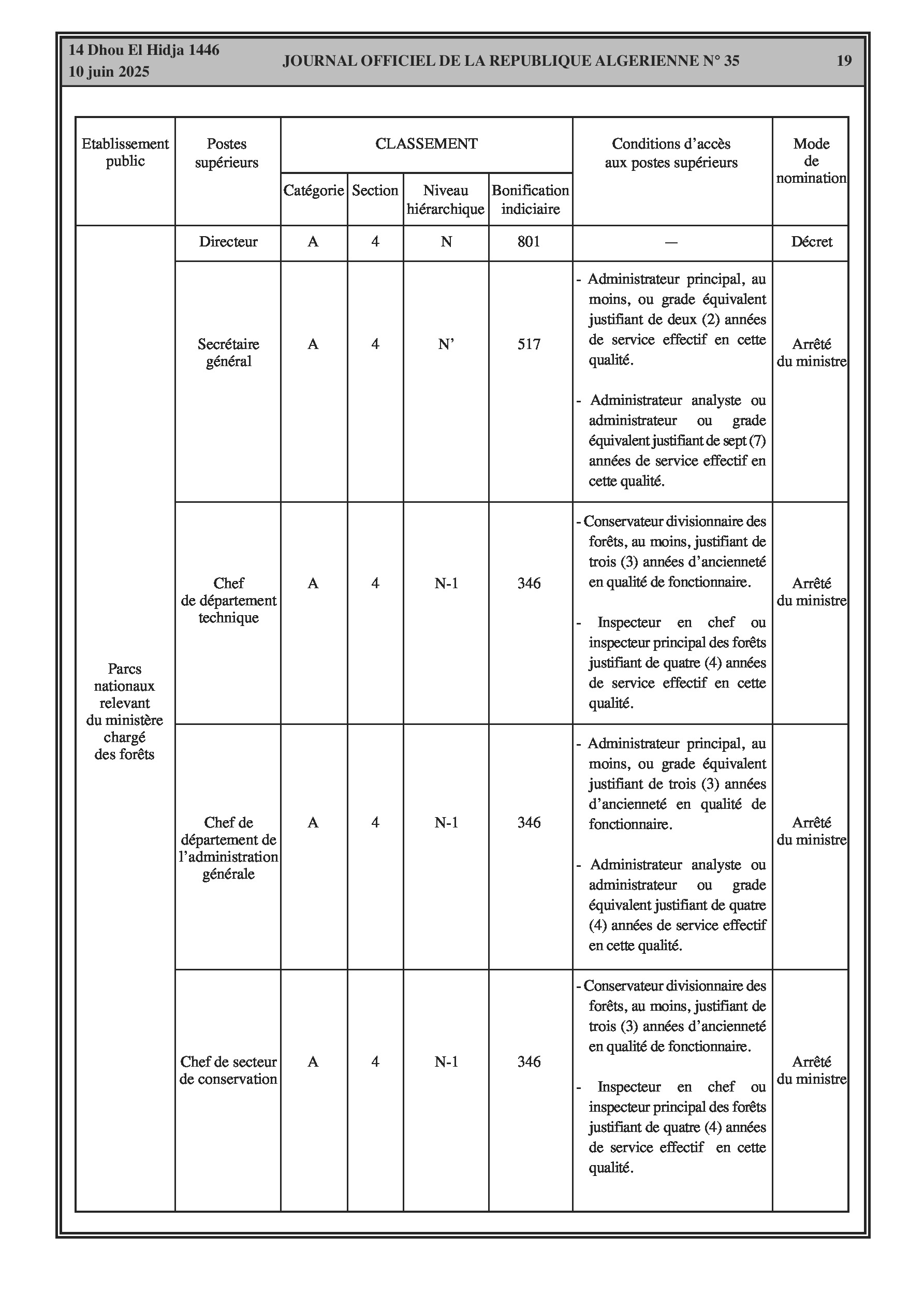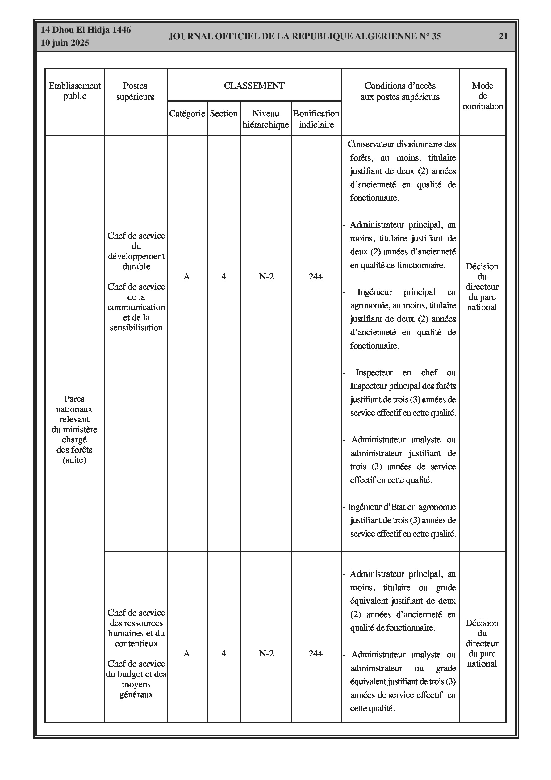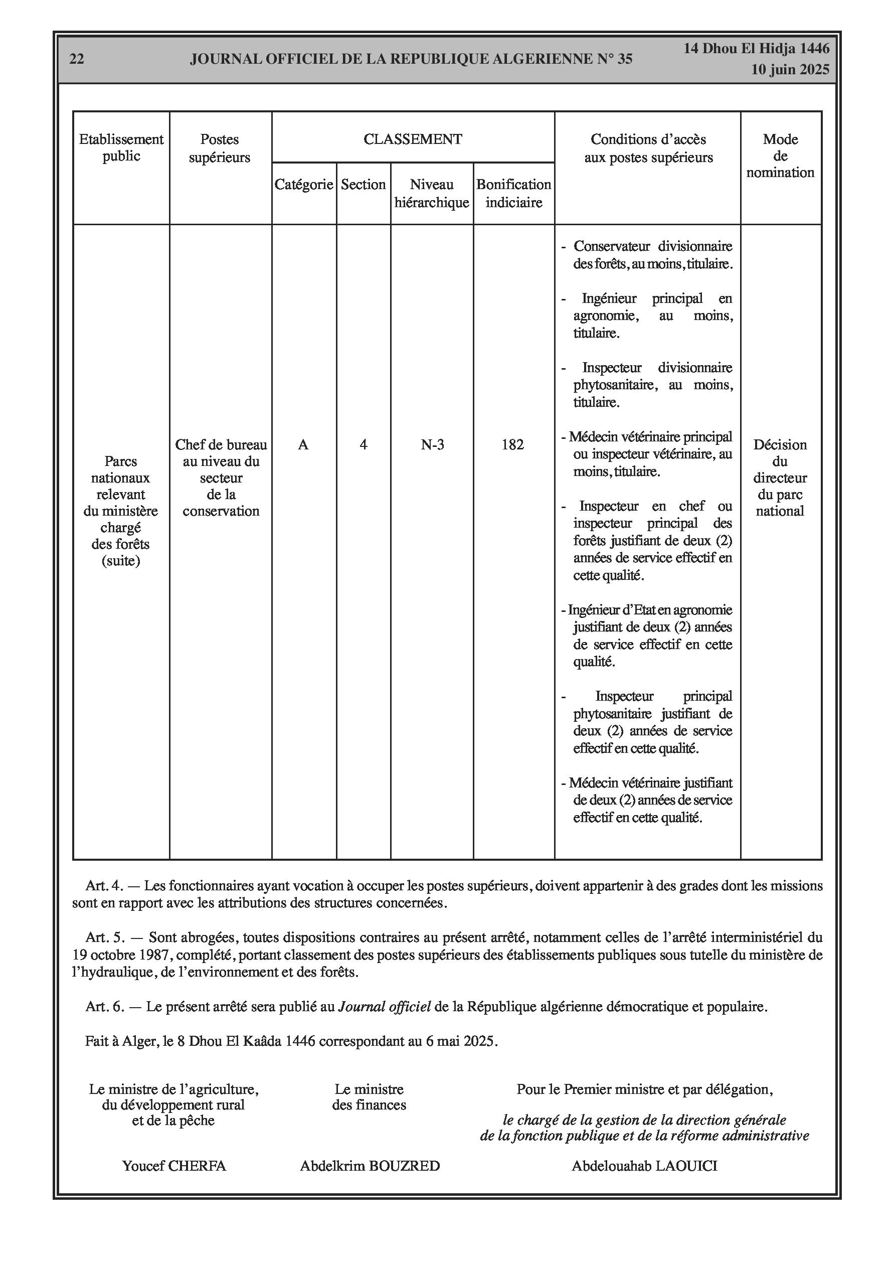 Un arrêté interministériel (Ministère de l'Agriculture) fixe la classification des parcs nationaux relevant du ministère chargé des forêts et les conditions d'accès aux postes supérieurs y afférents (pages 18-22). Un arrêté modifie la liste des membres du conseil d'administration de l'École Nationale des Forêts (E.NA.F). Un autre arrêté désigne les membres du conseil scientifique du parc national de Belezma (Batna). Enfin, un arrêté modifie les membres du conseil d'orientation de l'Agence Nationale des Changements Climatiques.