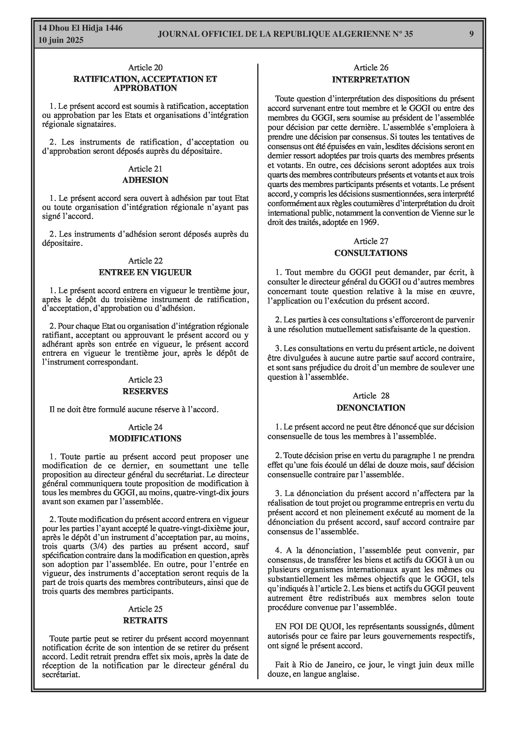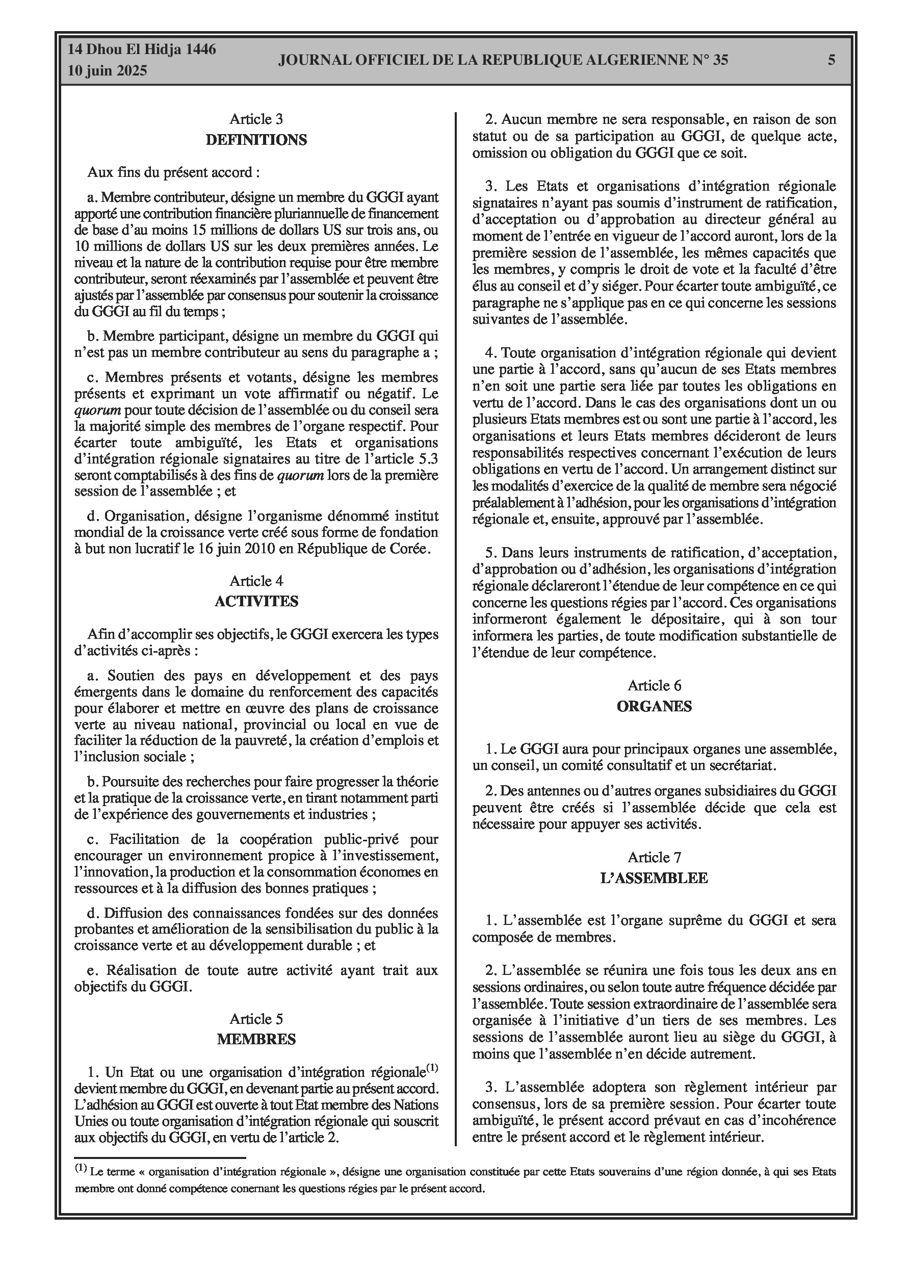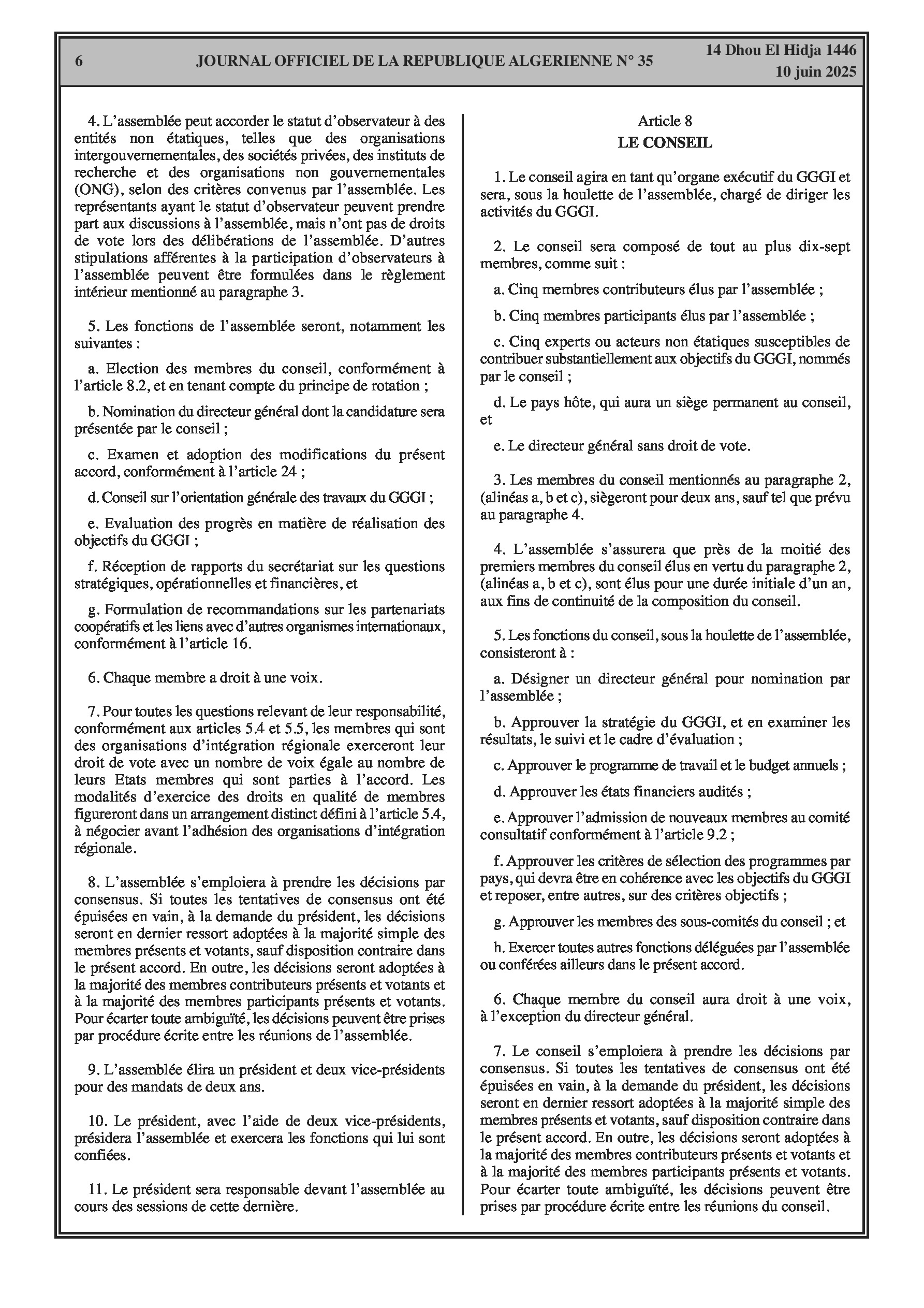 Le décret présidentiel n° 25-146 officialise l'adhésion de l'Algérie à l'accord portant création de l'Institut Mondial de la Croissance Verte, signé à Rio de Janeiro le 20 juin 2012. Le GGGI vise à soutenir les pays en développement dans leur transition vers un modèle de croissance verte, axé sur la performance économique, la réduction de la pauvreté, la création d'emplois, l'inclusion sociale et la durabilité environnementale.