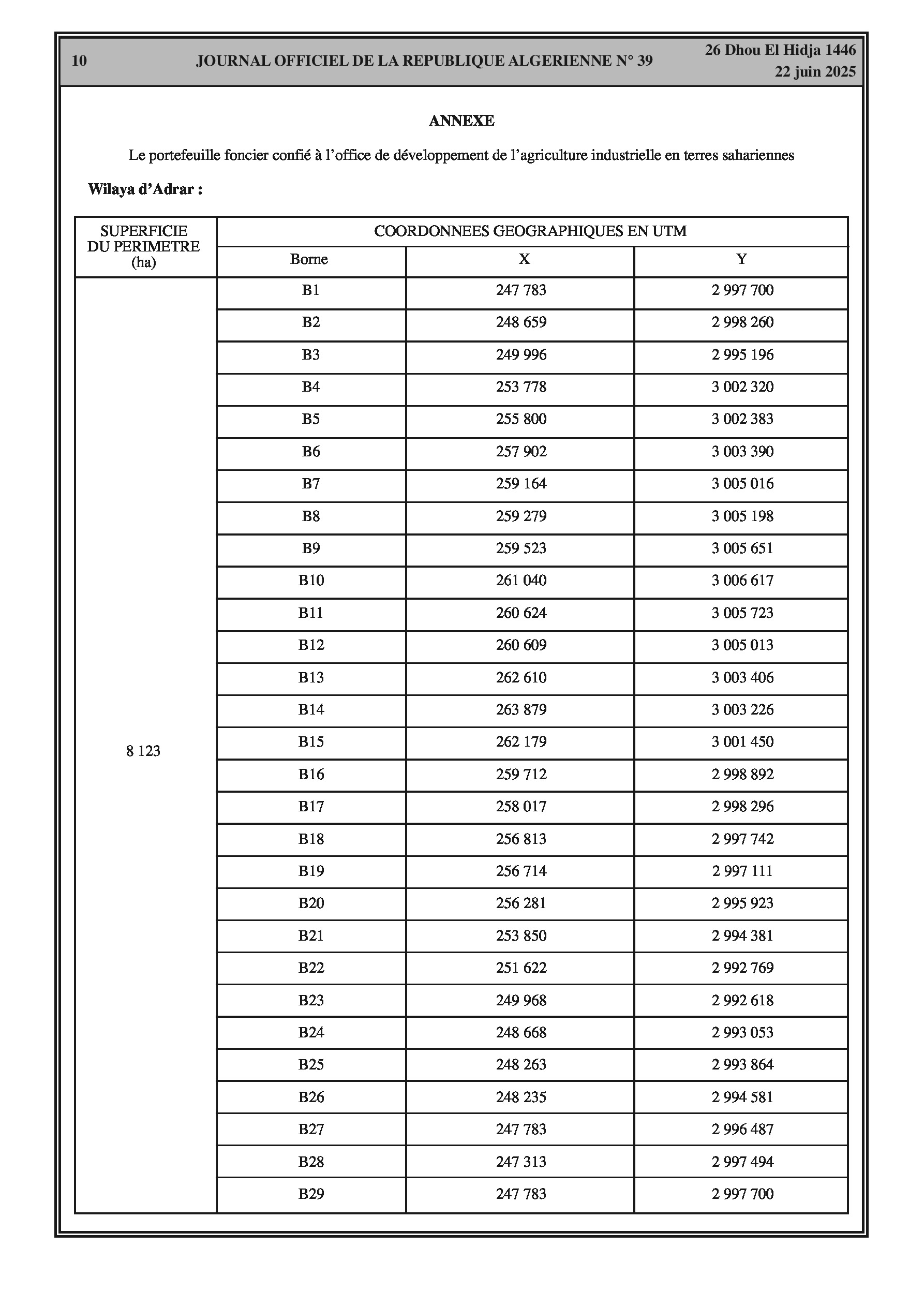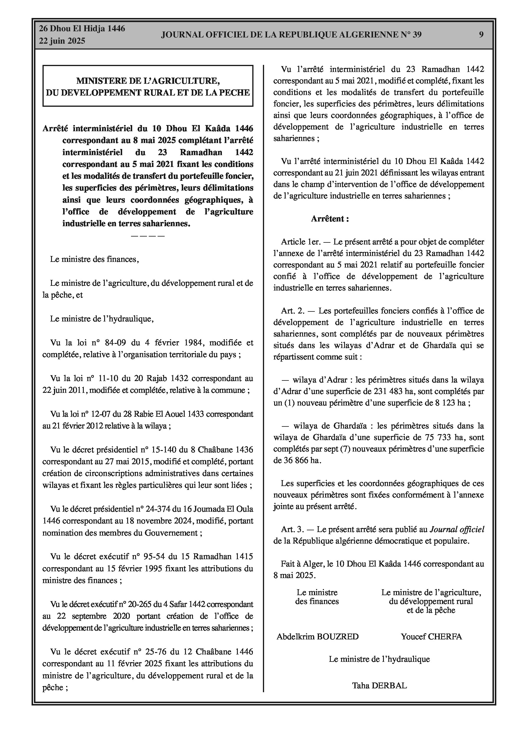 Arrêté interministériel complétant le portefeuille foncier de l'Office de développement de l'agriculture industrielle en terres sahariennes. Ajout d'un nouveau périmètre dans la wilaya d'Adrar (8.123 ha) et de sept (7) nouveaux périmètres dans la wilaya de Ghardaïa (total 36.866 ha). Coordonnées géographiques en annexe. Arrêté modifiant la désignation des membres du comité national de prévention et de lutte contre les zoonoses. Arrêté portant délégation de signature au sous-directeur du budget et de la comptabilité du ministère.