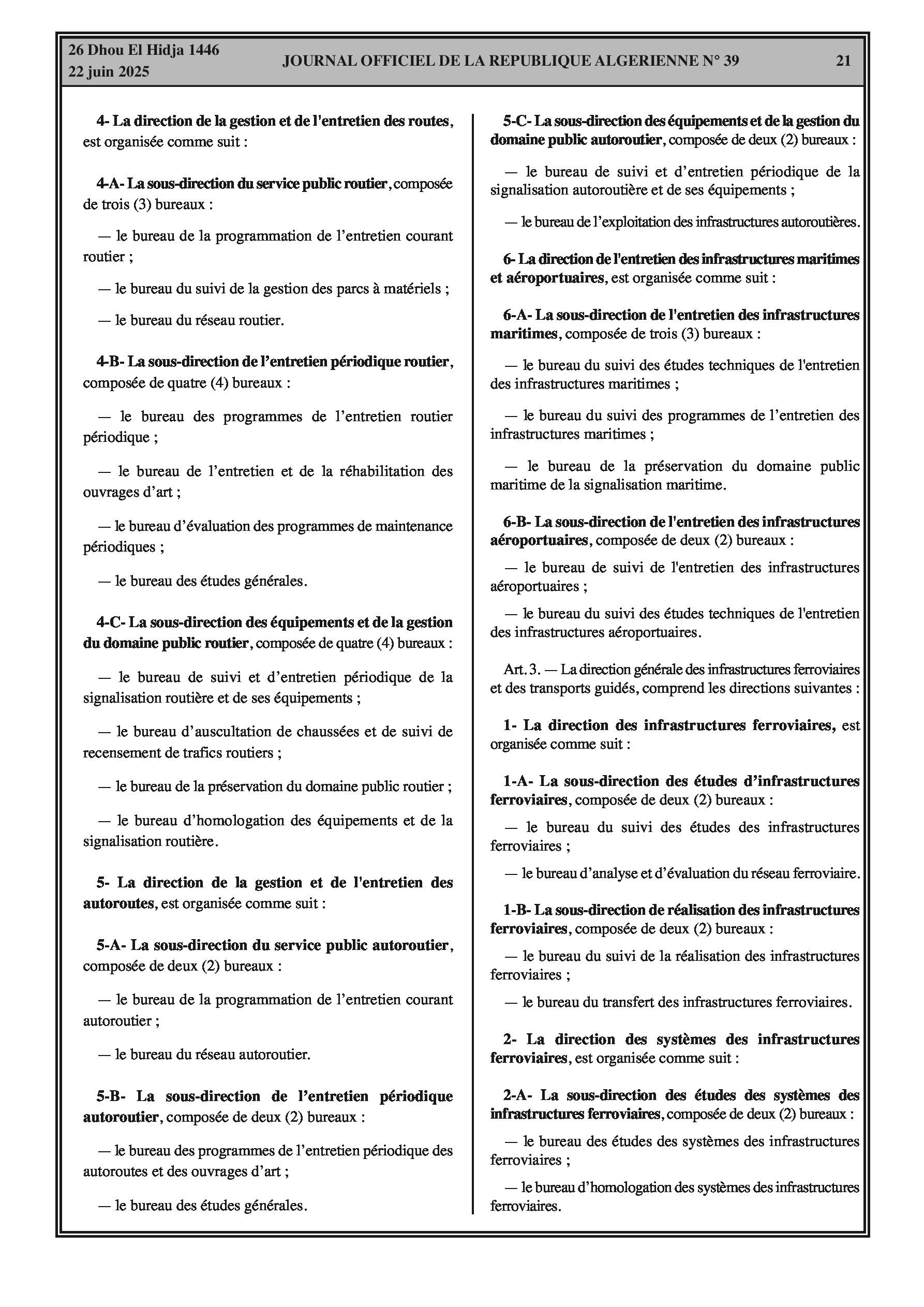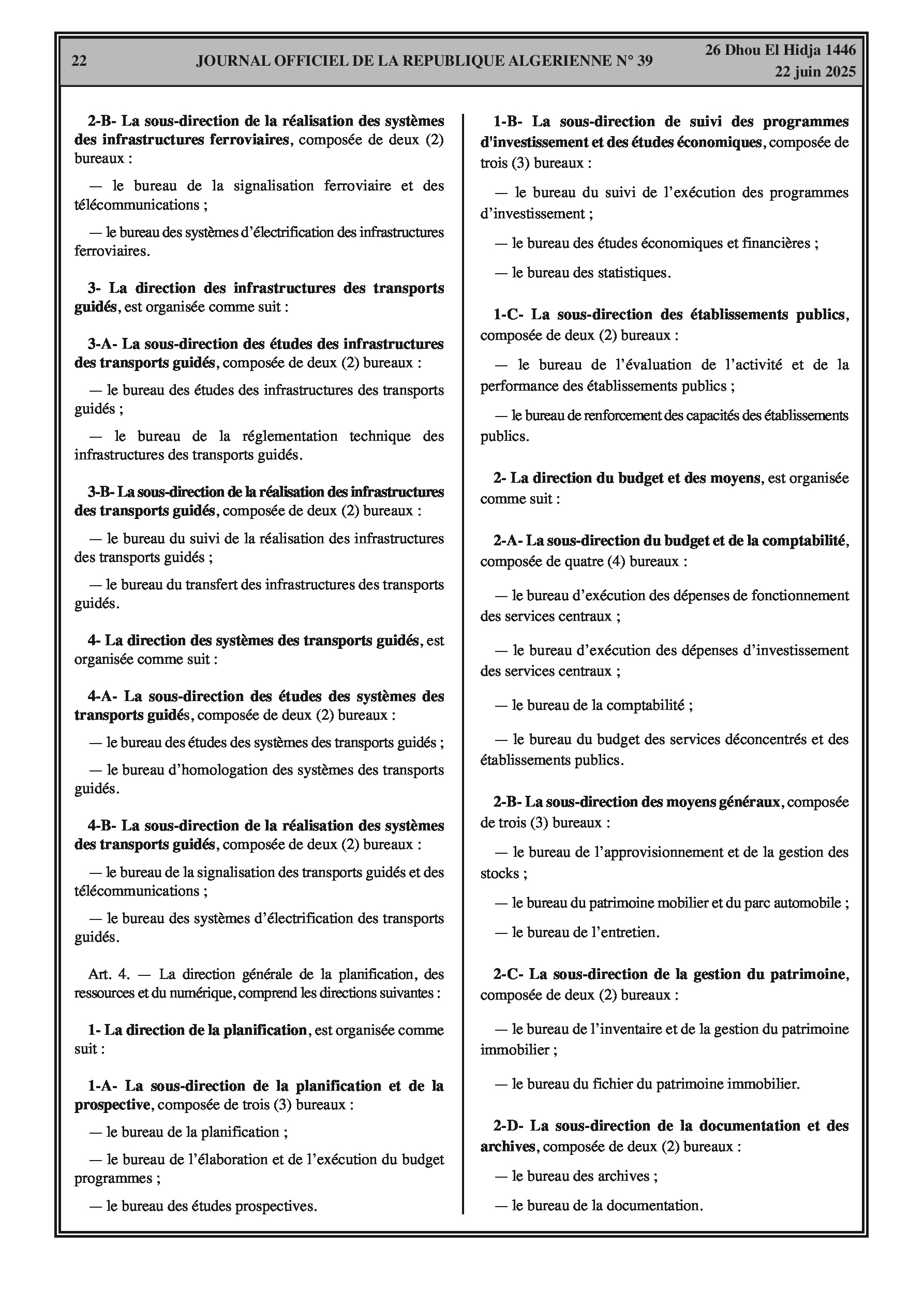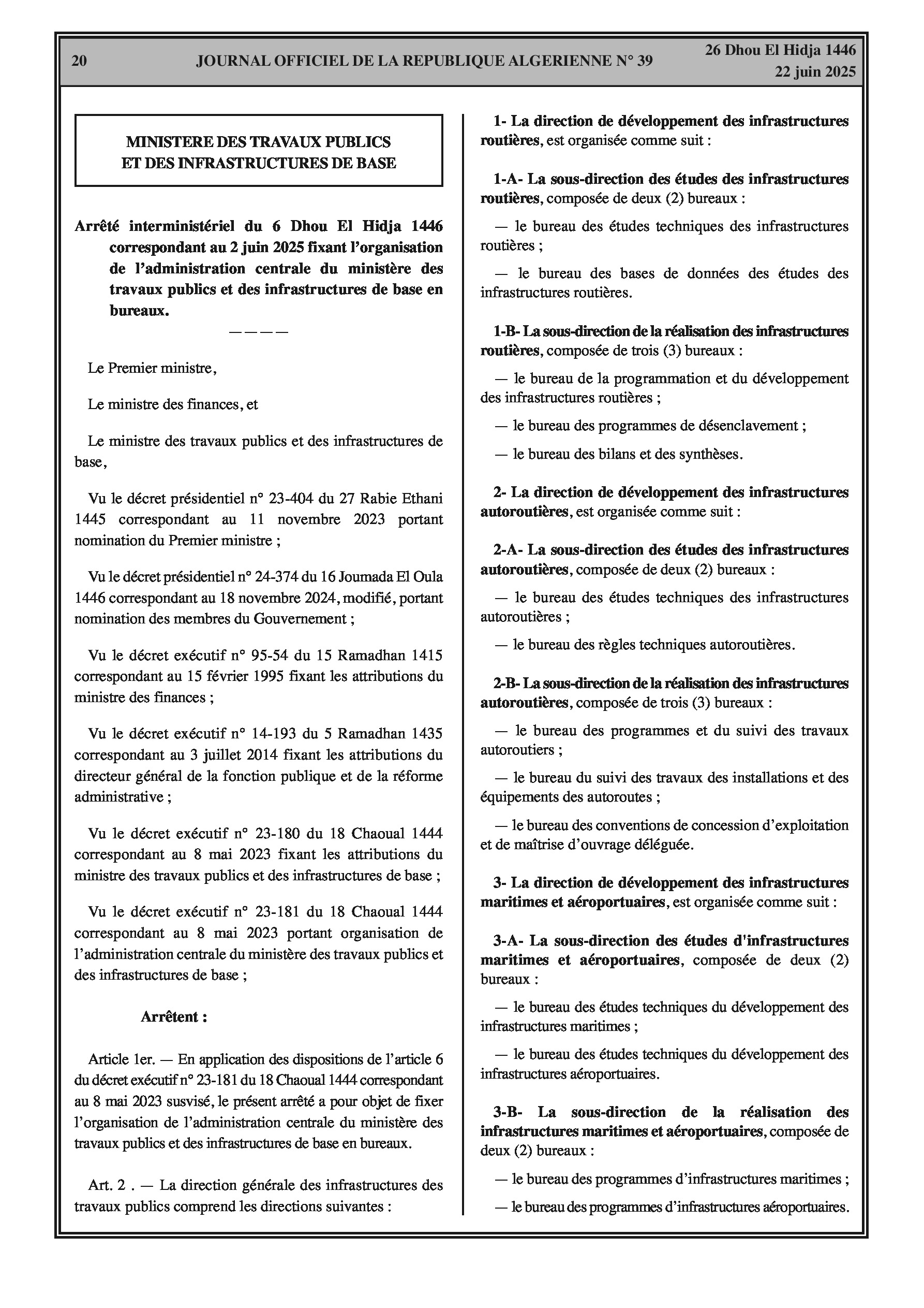 Fixation de l'organisation de l'administration centrale du ministère des travaux publics et des infrastructures de base en bureaux. L'organisation comprend les directions générales des infrastructures routières, autoroutières, maritimes et aéroportuaires, ferroviaires et des transports guidés, ainsi que la direction générale de la planification, des ressources et du numérique. Chaque direction générale est composée de sous-directions et de bureaux spécifiques.