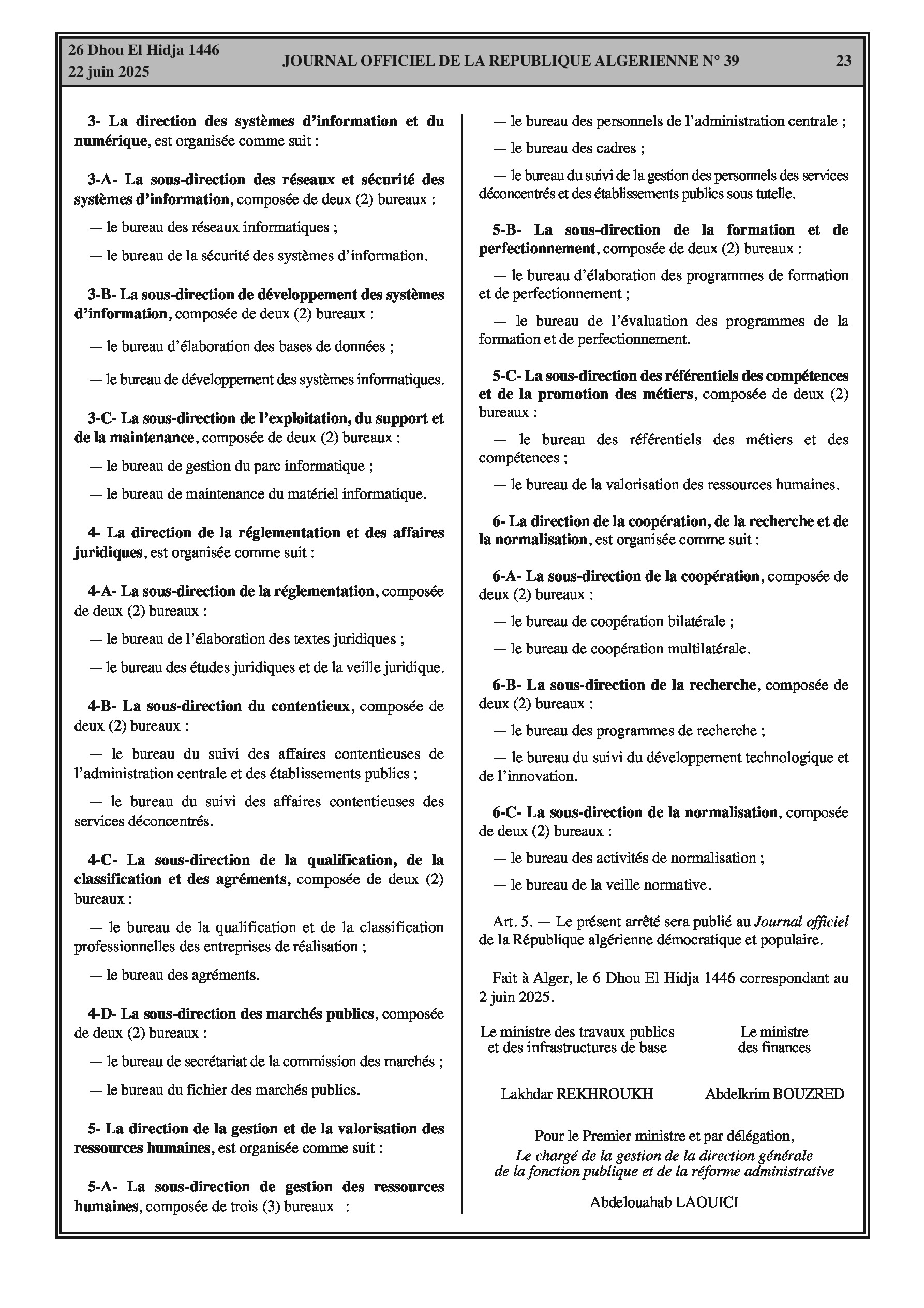 6. Ministère des Travaux Publics : Nouvelle organisation de l'administration centrale