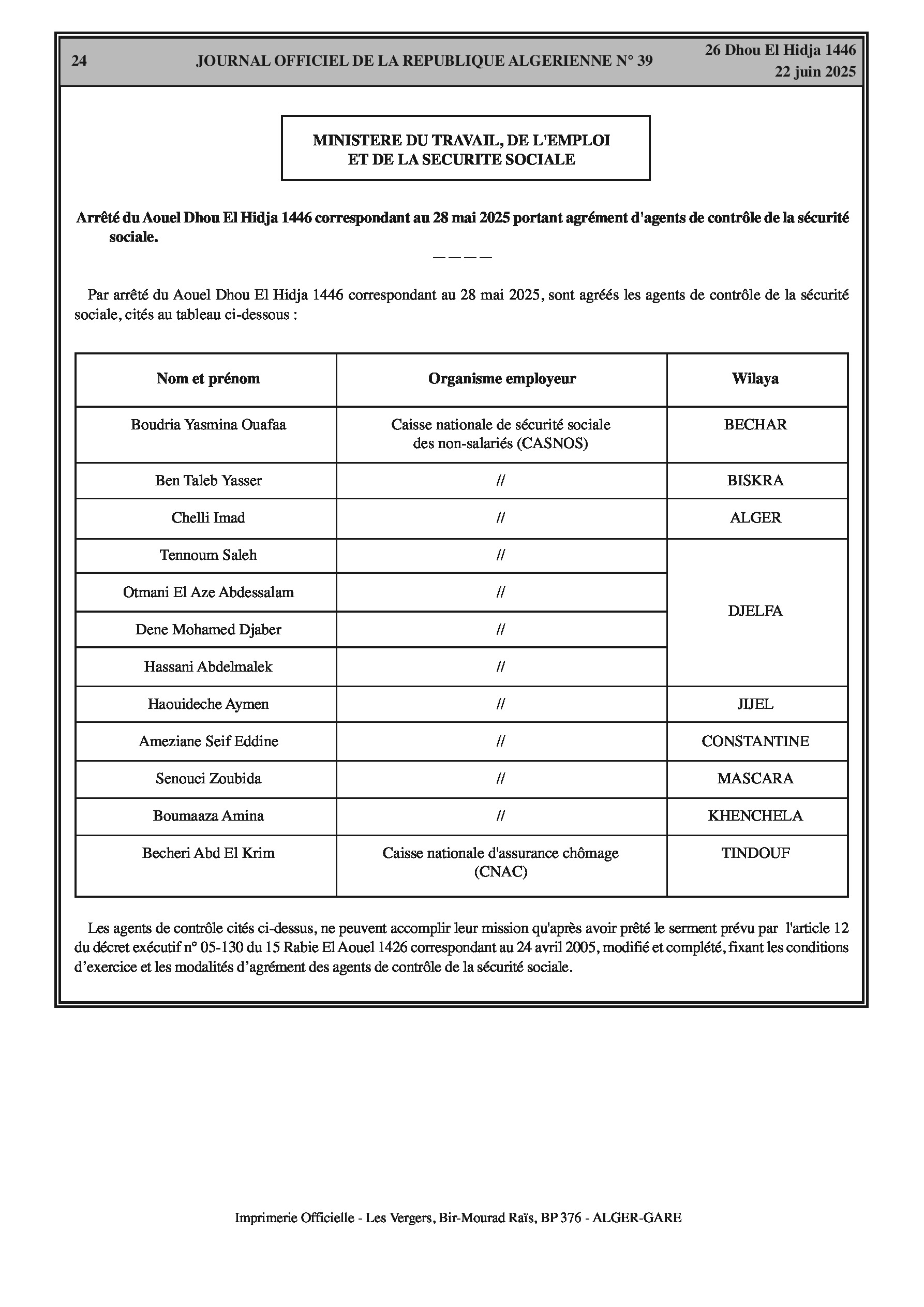 Agrément d'une liste d'agents de contrôle de la sécurité sociale pour la Caisse nationale de sécurité sociale des non-salariés (CASNOS) et la Caisse nationale d'assurance chômage (CNAC) dans plusieurs wilayas. Ils ne peuvent accomplir leur mission qu'après avoir prêté serment.