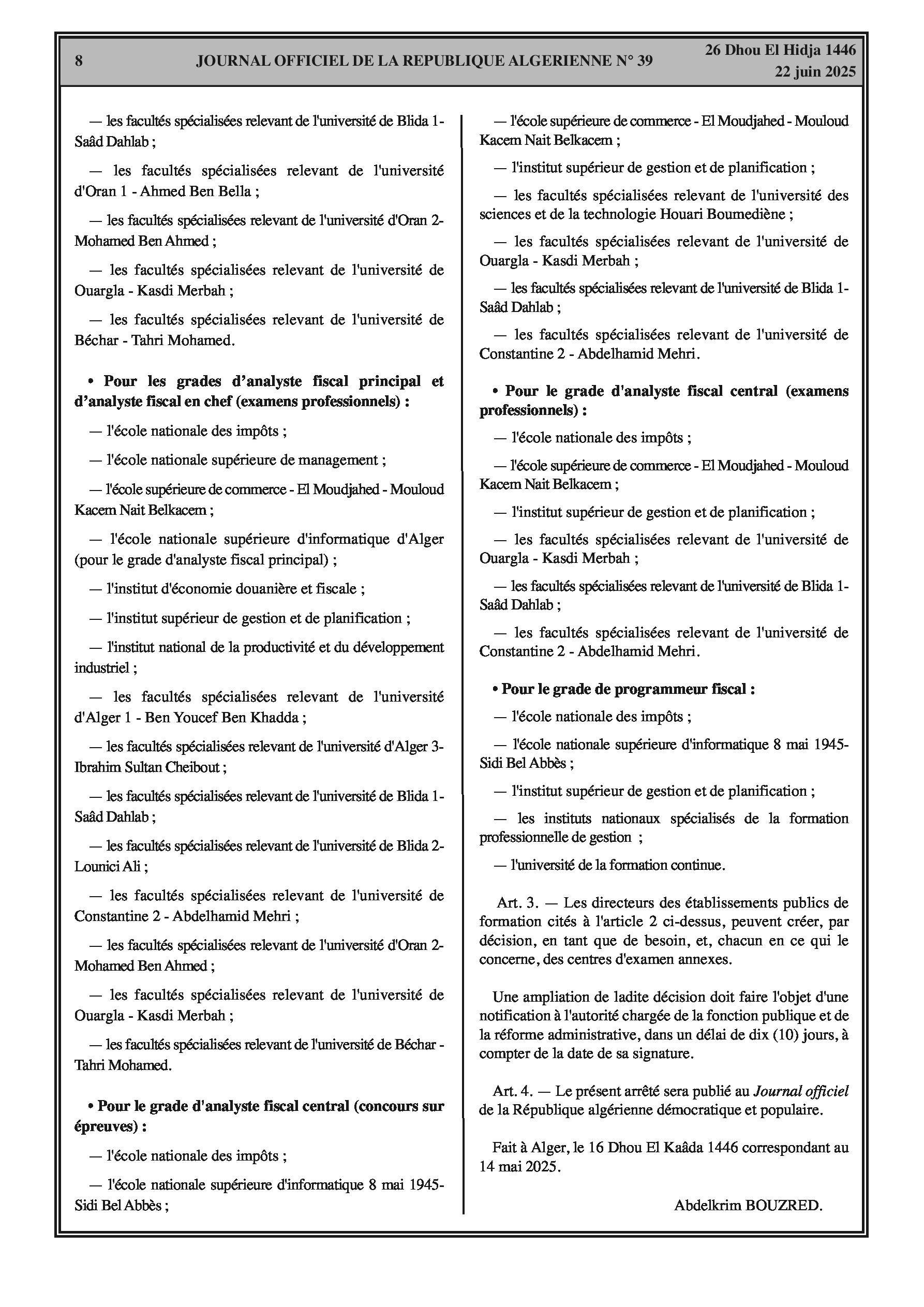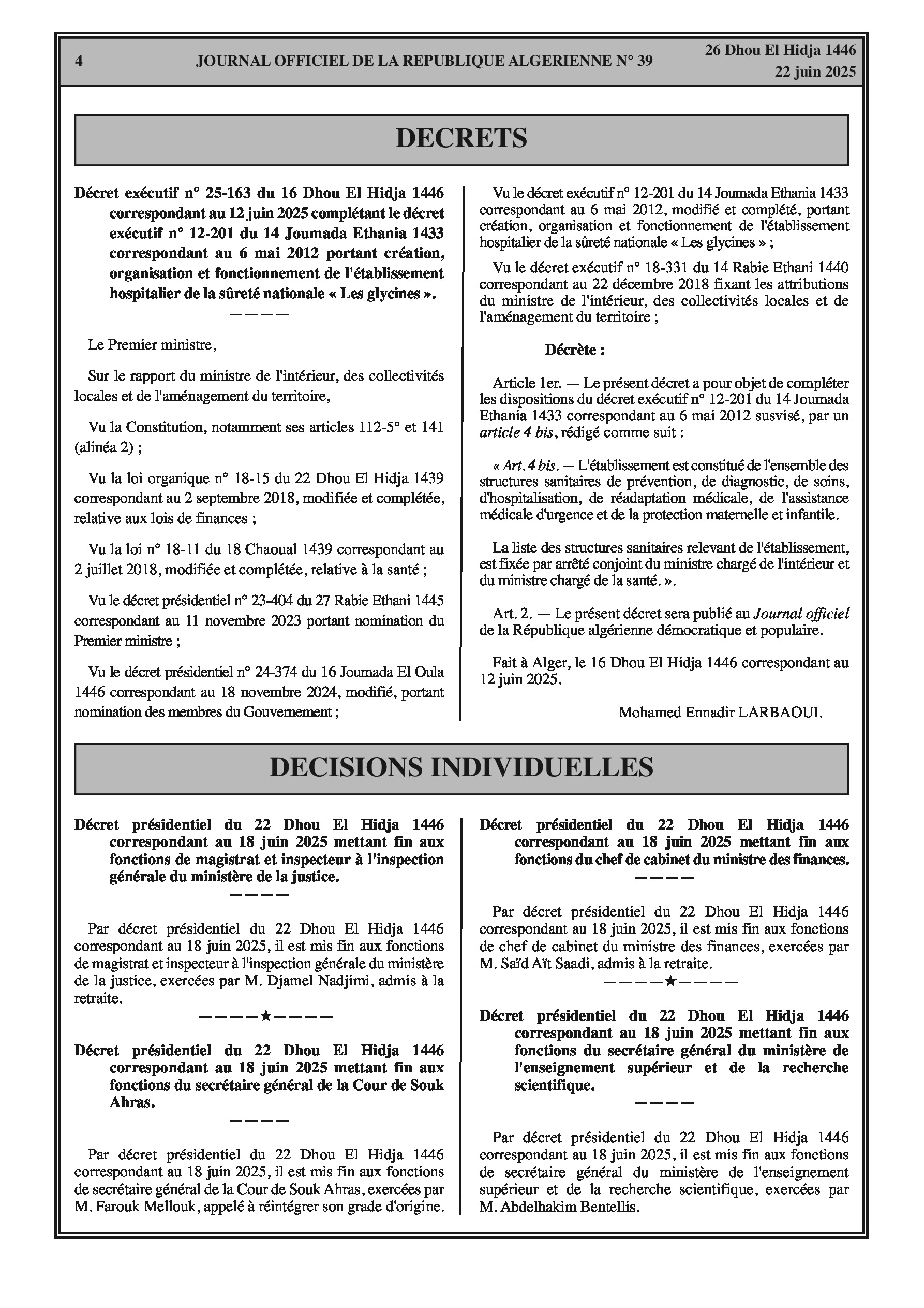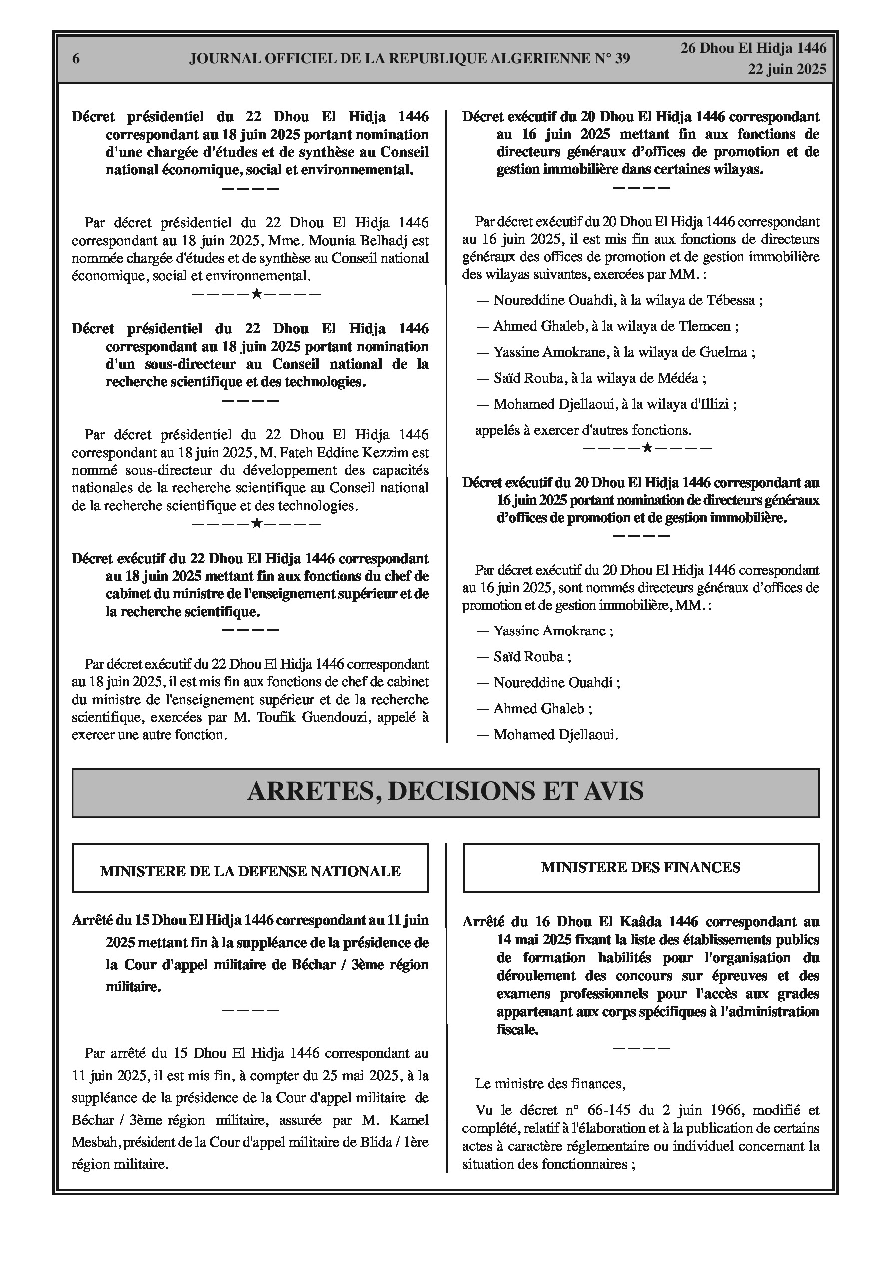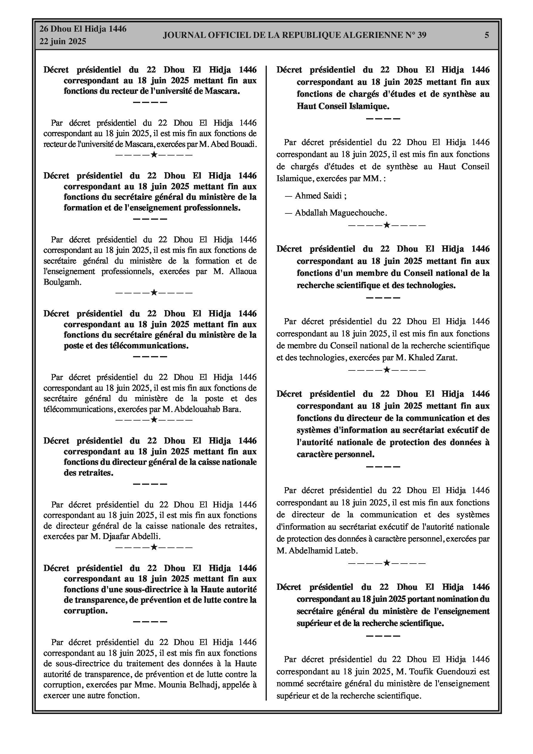 Fins de fonctions : Magistrat et inspecteur (Justice) ; Secrétaire général Cour de Souk Ahras ; Chef de cabinet (Finances) ; Secrétaire général (Enseignement Supérieur et Recherche Scientifique) ; Recteur Université de Mascara ; Secrétaire général (Formation et Enseignement Professionnels) ; Secrétaire général (Poste et Télécommunications) ; Directeur général Caisse Nationale des Retraites ; Sous-directrice (Haute Autorité de Transparence, Prévention et Lutte contre la Corruption) ; Chargés d'études et de synthèse (Haut Conseil Islamique) ; Membre (Conseil National Recherche Scientifique et Technologies) ; Directeur communication et systèmes d'information (Autorité Nationale Protection Données à Caractère Personnel) ; Chef de cabinet (Enseignement Supérieur et Recherche Scientifique) ; Directeurs généraux (Offices Promotion et Gestion Immobilière - plusieurs wilayas). Nominations : Secrétaire général (Enseignement Supérieur et Recherche Scientifique) ; Chargée d'études et de synthèse (Conseil National Économique, Social et Environnemental) ; Sous-directeur (Conseil National Recherche Scientifique et Technologies) ; Directeurs généraux (Offices Promotion et Gestion Immobilière).
