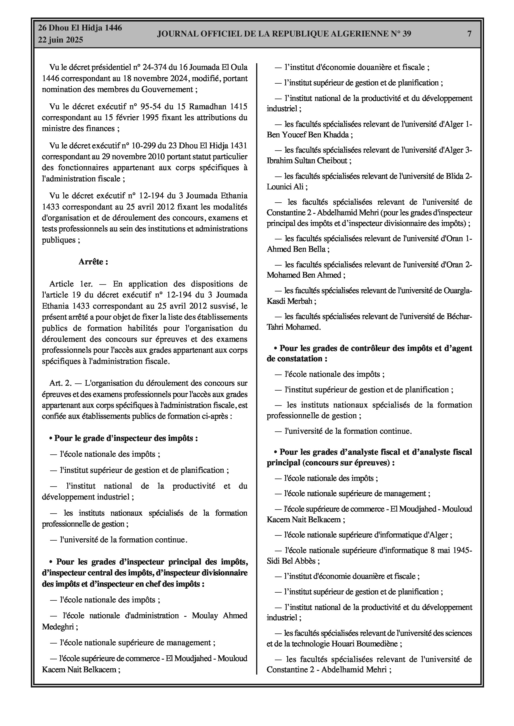 Fixation de la liste des établissements publics de formation habilités pour l'organisation des concours sur épreuves et des examens professionnels pour l'accès aux grades des corps spécifiques à l'administration fiscale. Comprend l'École Nationale des Impôts, divers instituts et écoles supérieures, et facultés spécialisées pour différents grades (inspecteur, inspecteur principal, inspecteur central, inspecteur divisionnaire, inspecteur en chef des impôts, contrôleur, agent de constatation, analyste fiscal, analyste fiscal principal, analyste fiscal central, programmeur fiscal). Possibilité de créer des centres d'examen annexes par décision des directeurs d'établissements.