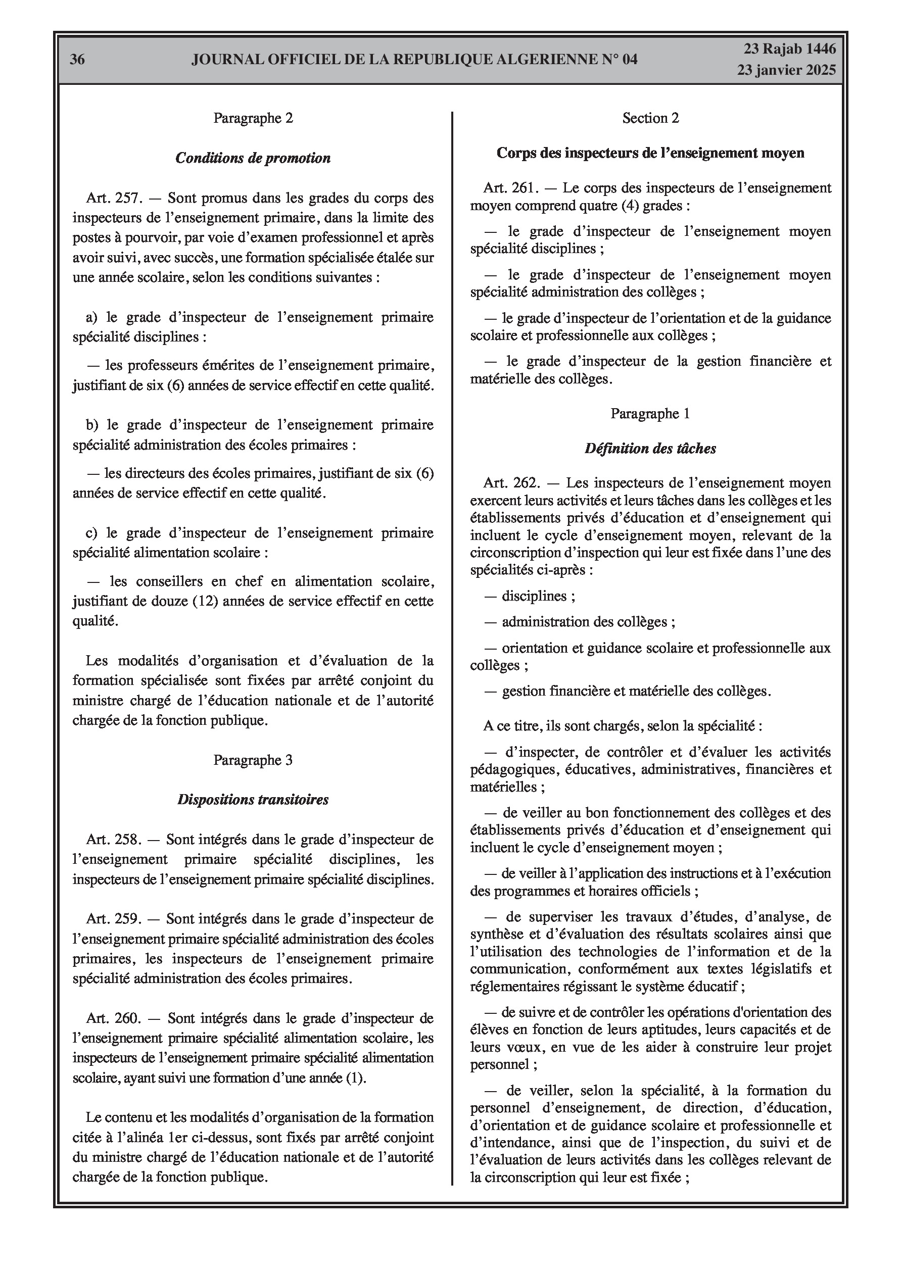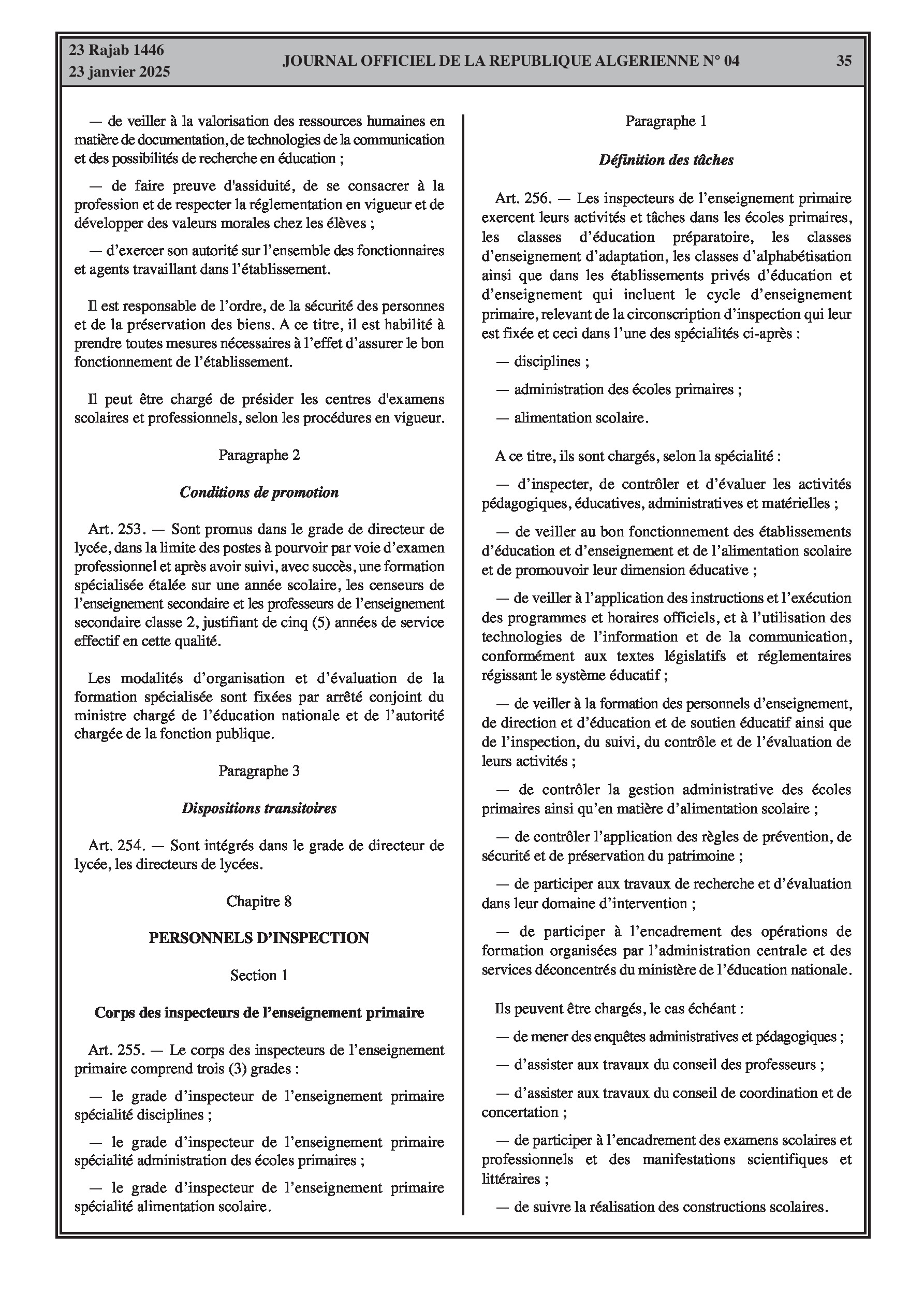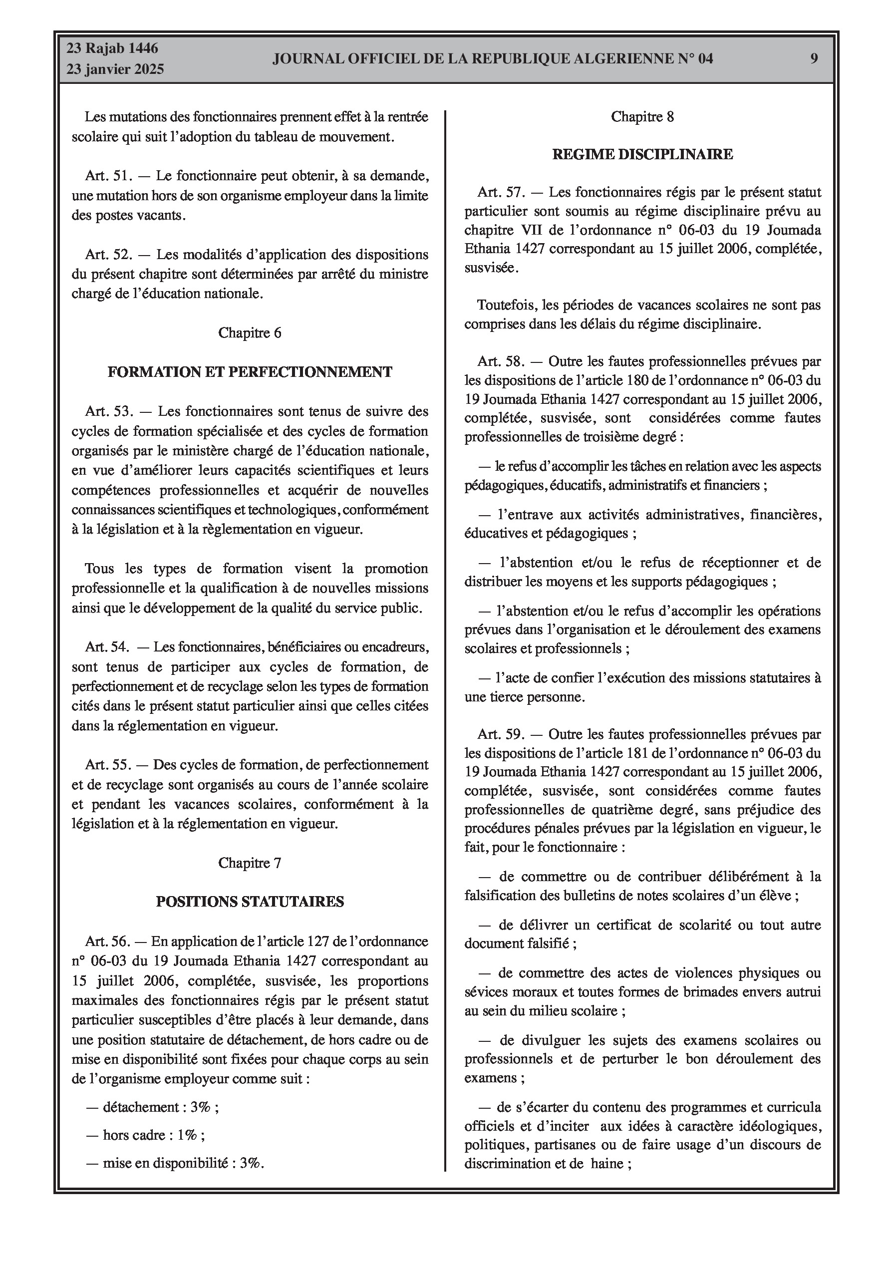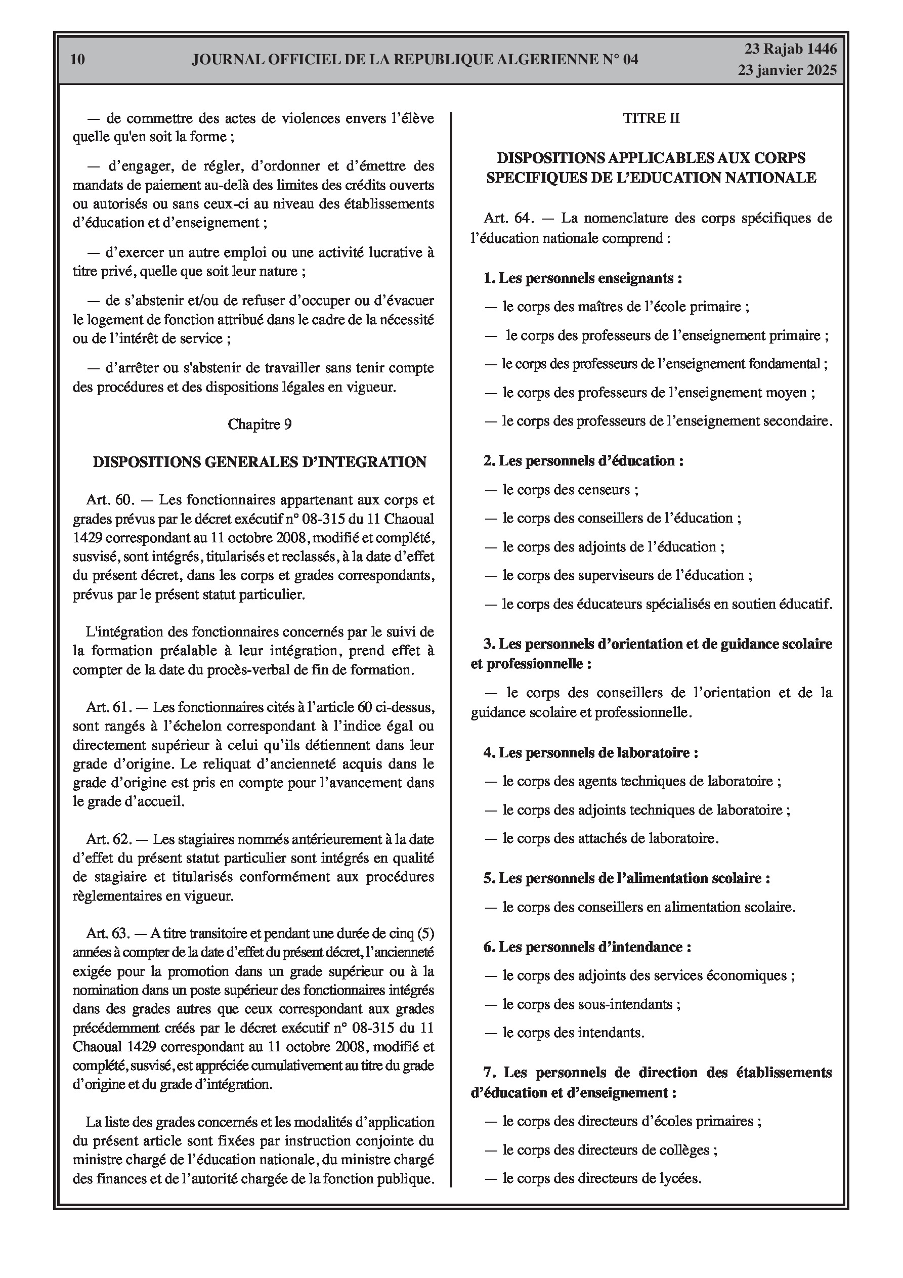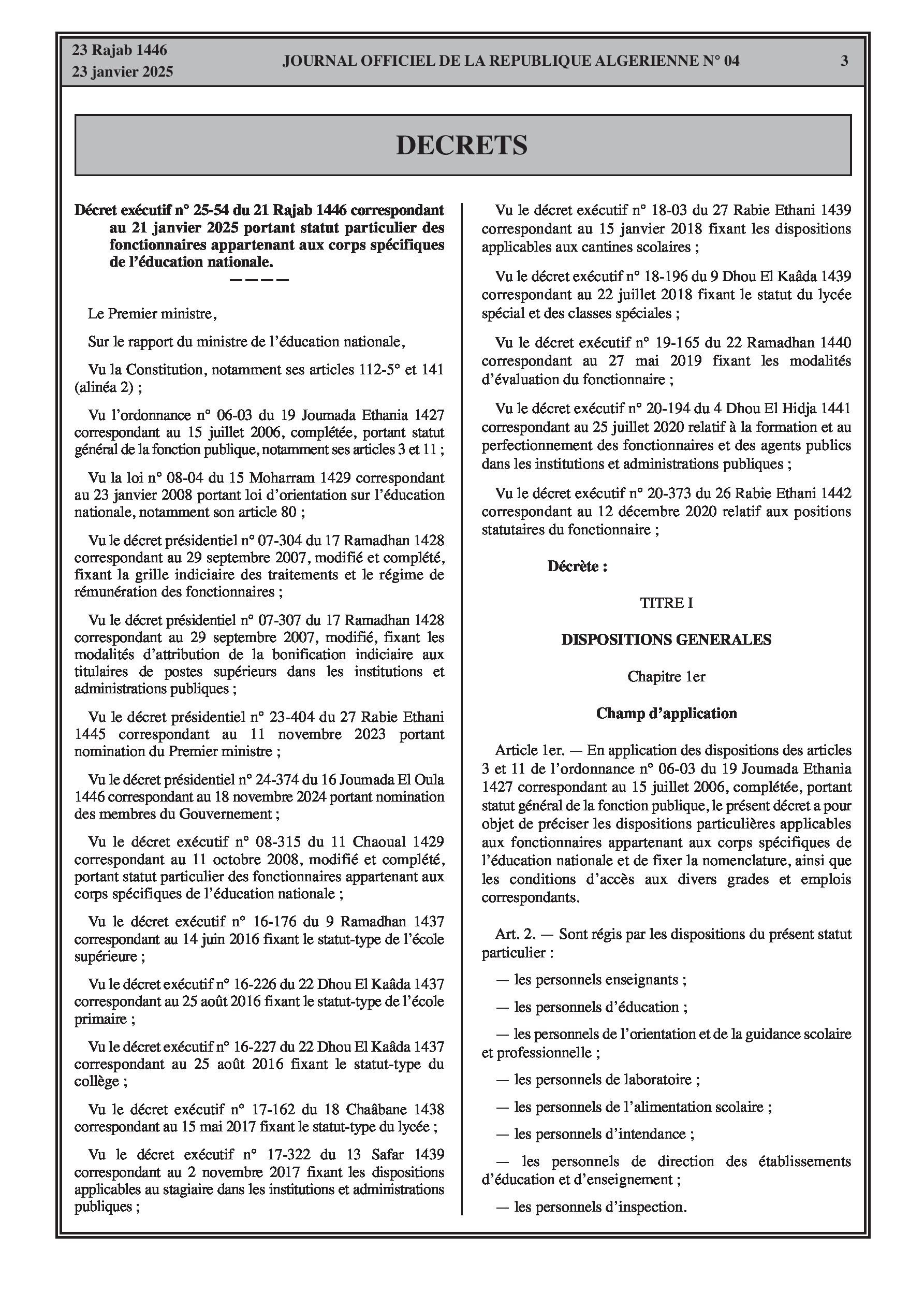 - Décret exécutif n° 25-54 : Définit le nouveau statut particulier applicable aux fonctionnaires des corps spécifiques de l'éducation nationale (enseignants, personnels d'éducation, d'orientation, de laboratoire, d'alimentation scolaire, d'intendance, de direction des établissements, et d'inspection). Détaille les droits et obligations, conditions de recrutement et de promotion, formation, évaluation, mobilité, régime disciplinaire, et procédures d'intégration des personnels actuels. Comprend également la classification de tous les grades et la bonification indiciaire des postes supérieurs (Pages 3-43).
