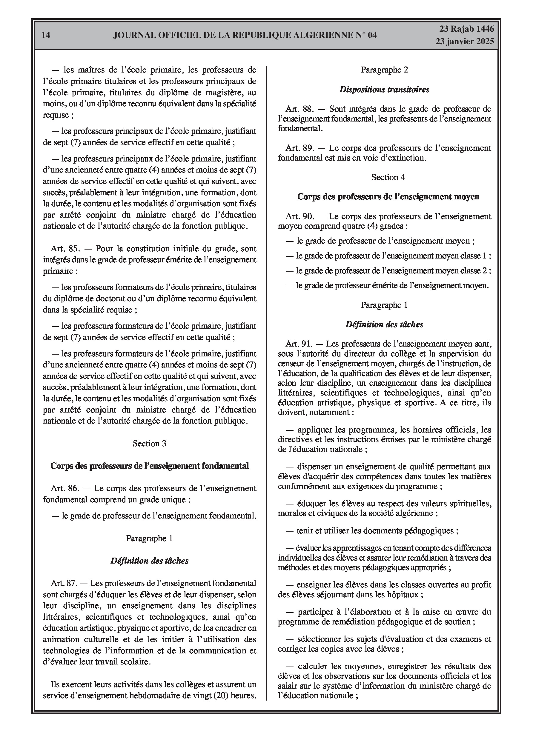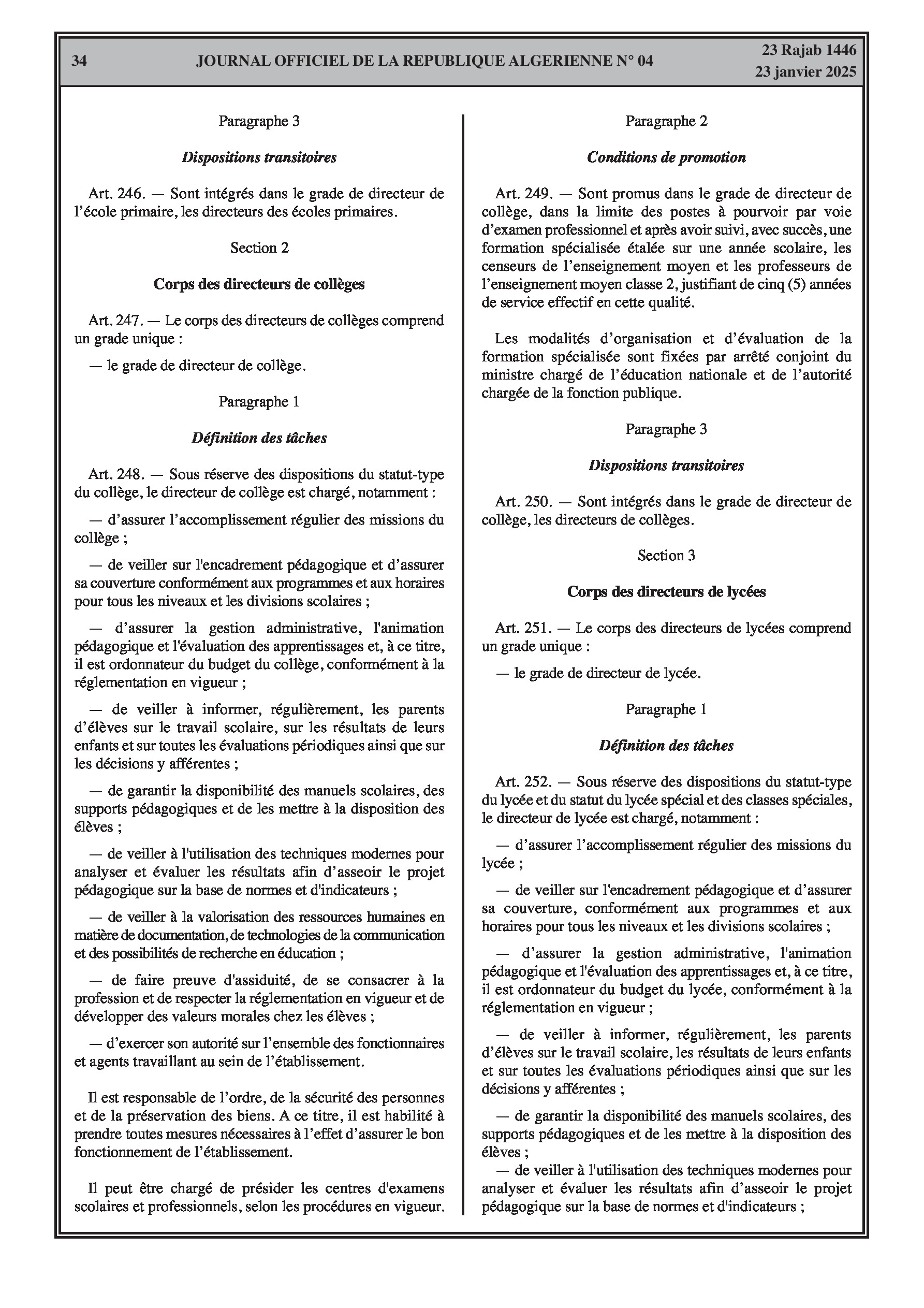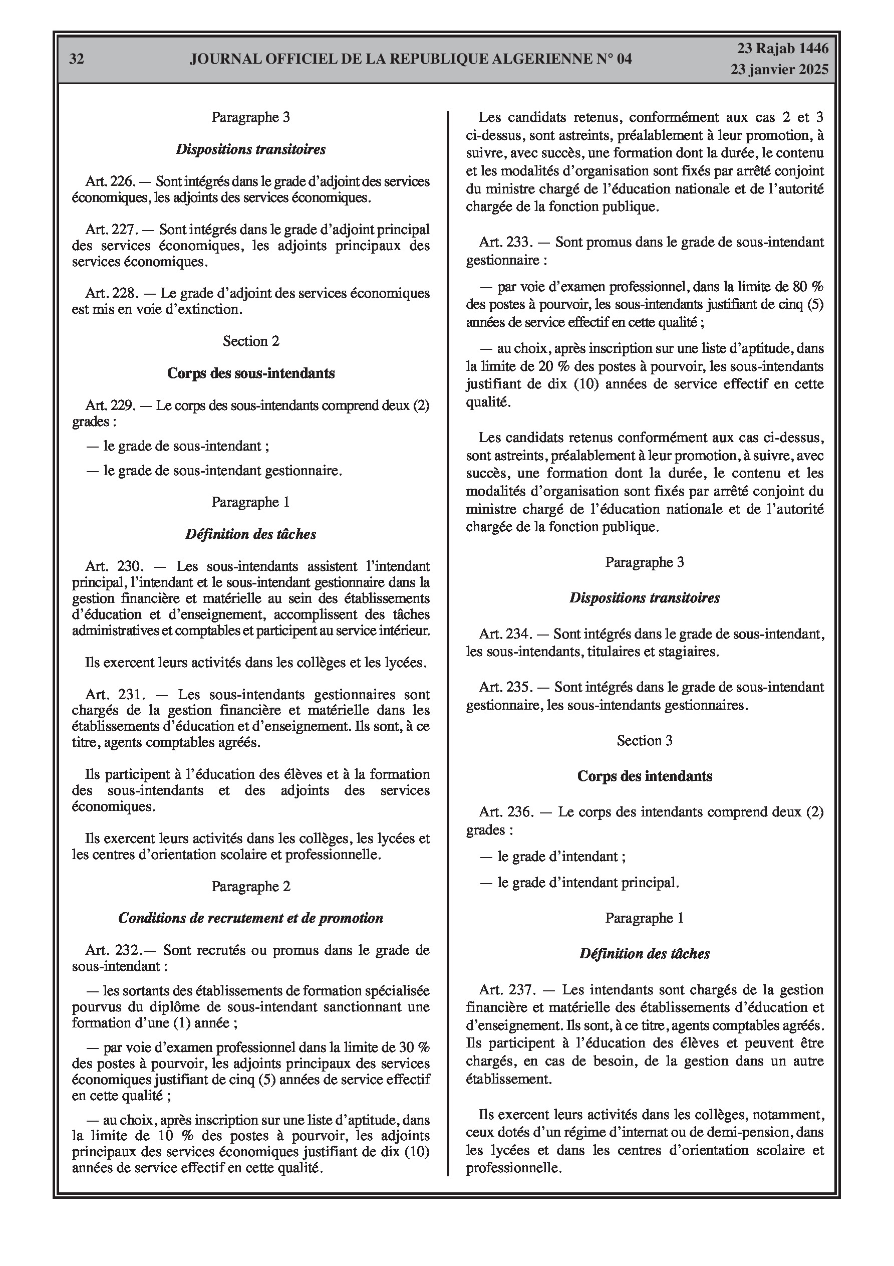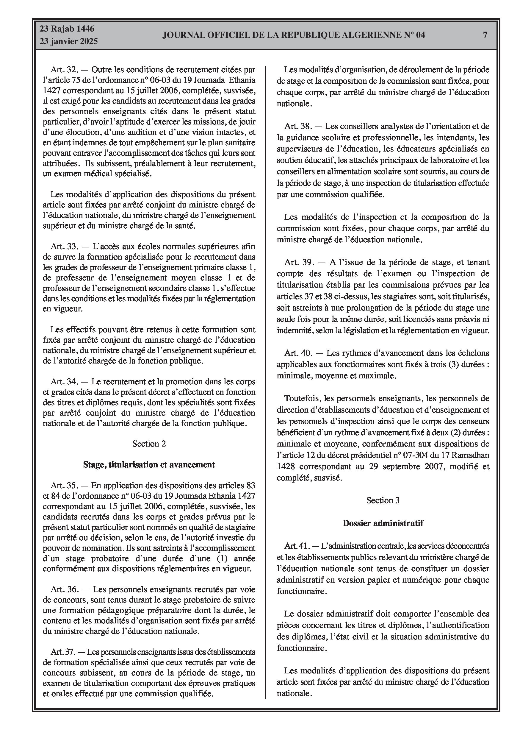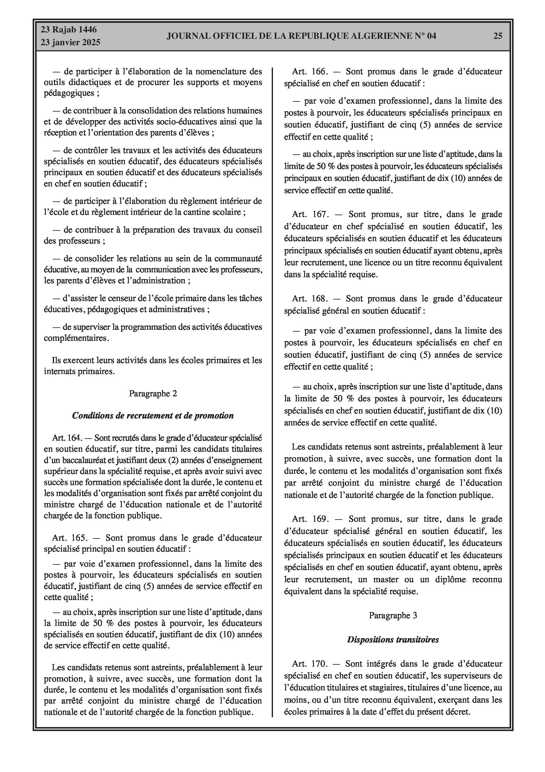 - Décret exécutif n° 25-54 : Définit le nouveau statut particulier applicable aux fonctionnaires des corps spécifiques de l'éducation nationale (enseignants, personnels d'éducation, d'orientation, de laboratoire, d'alimentation scolaire, d'intendance, de direction des établissements, et d'inspection). Détaille les droits et obligations, conditions de recrutement et de promotion, formation, évaluation, mobilité, régime disciplinaire, et procédures d'intégration des personnels actuels. Comprend également la classification de tous les grades et la bonification indiciaire des postes supérieurs (Pages 3-43).