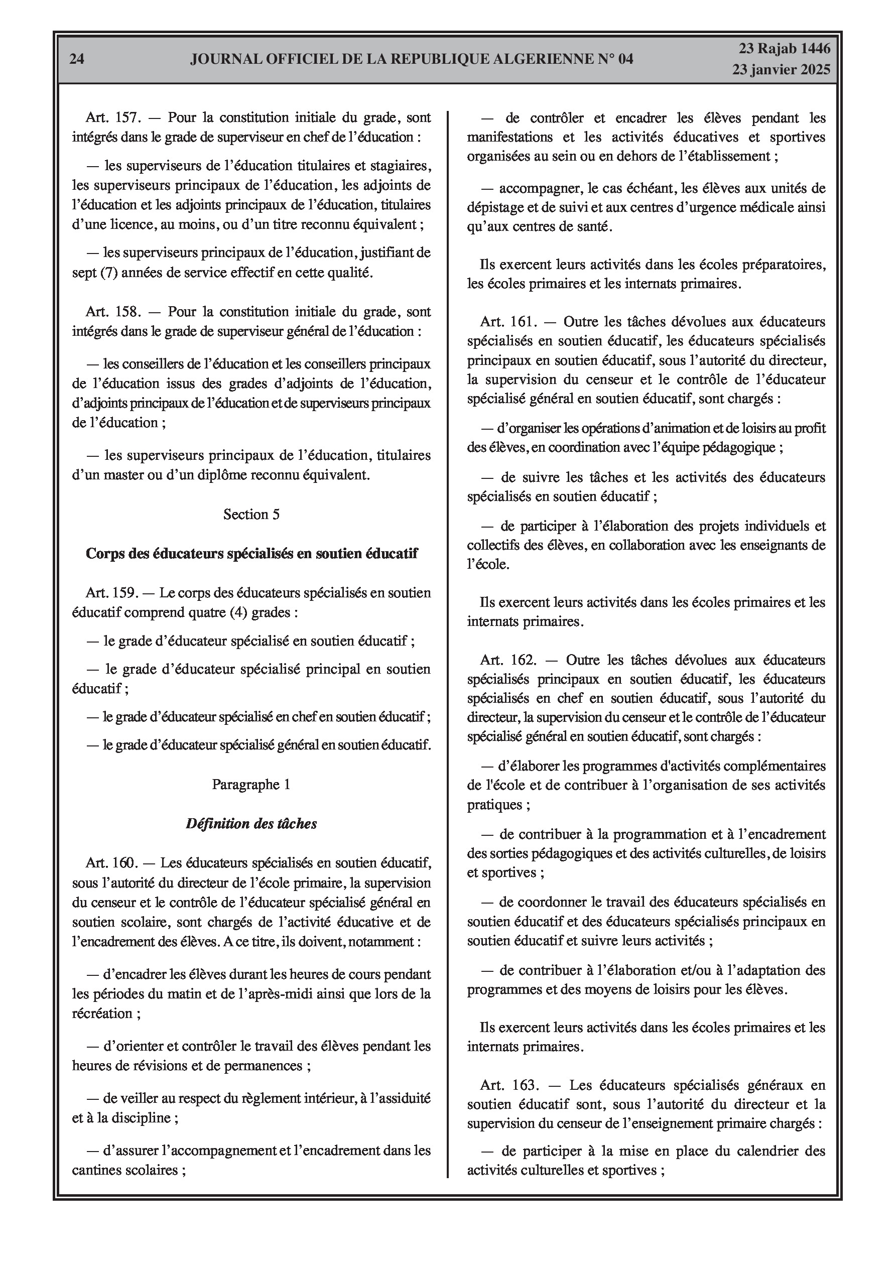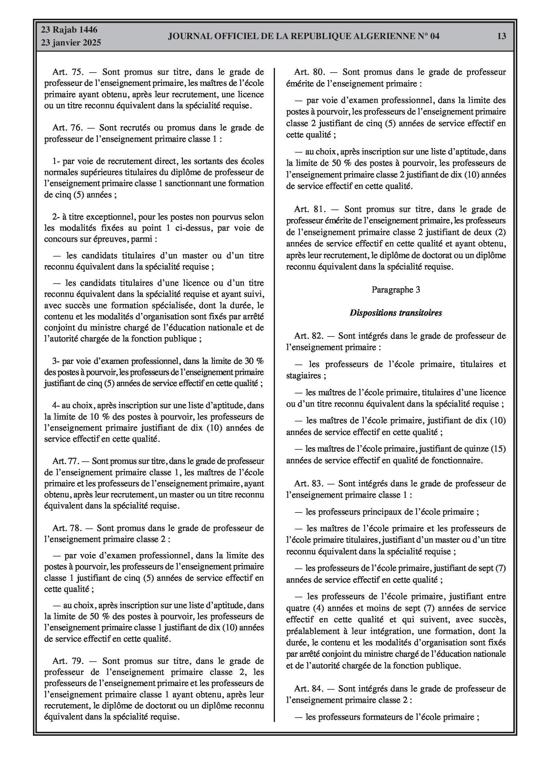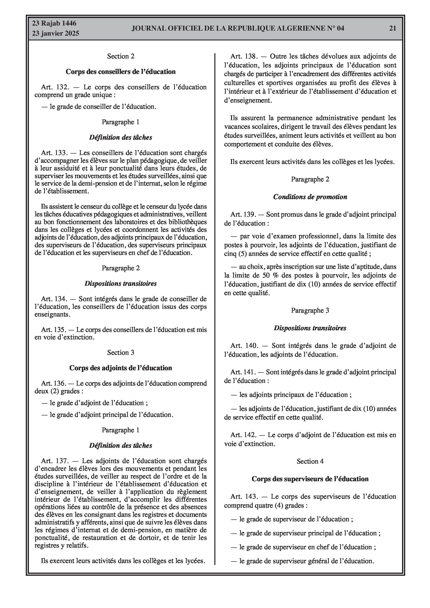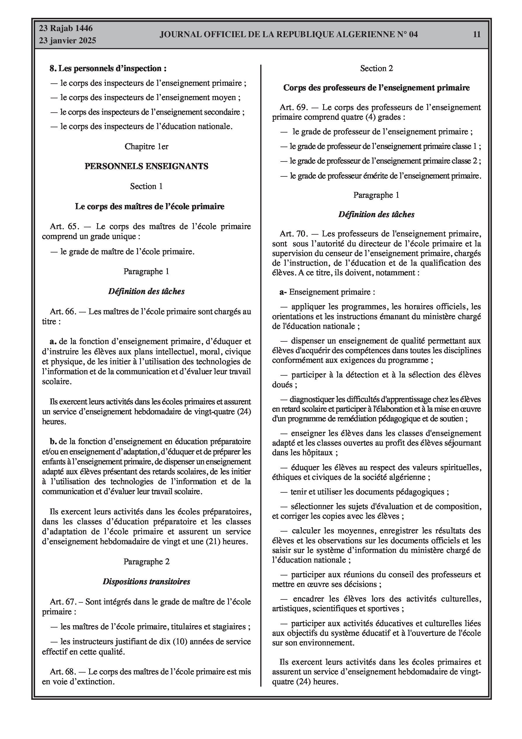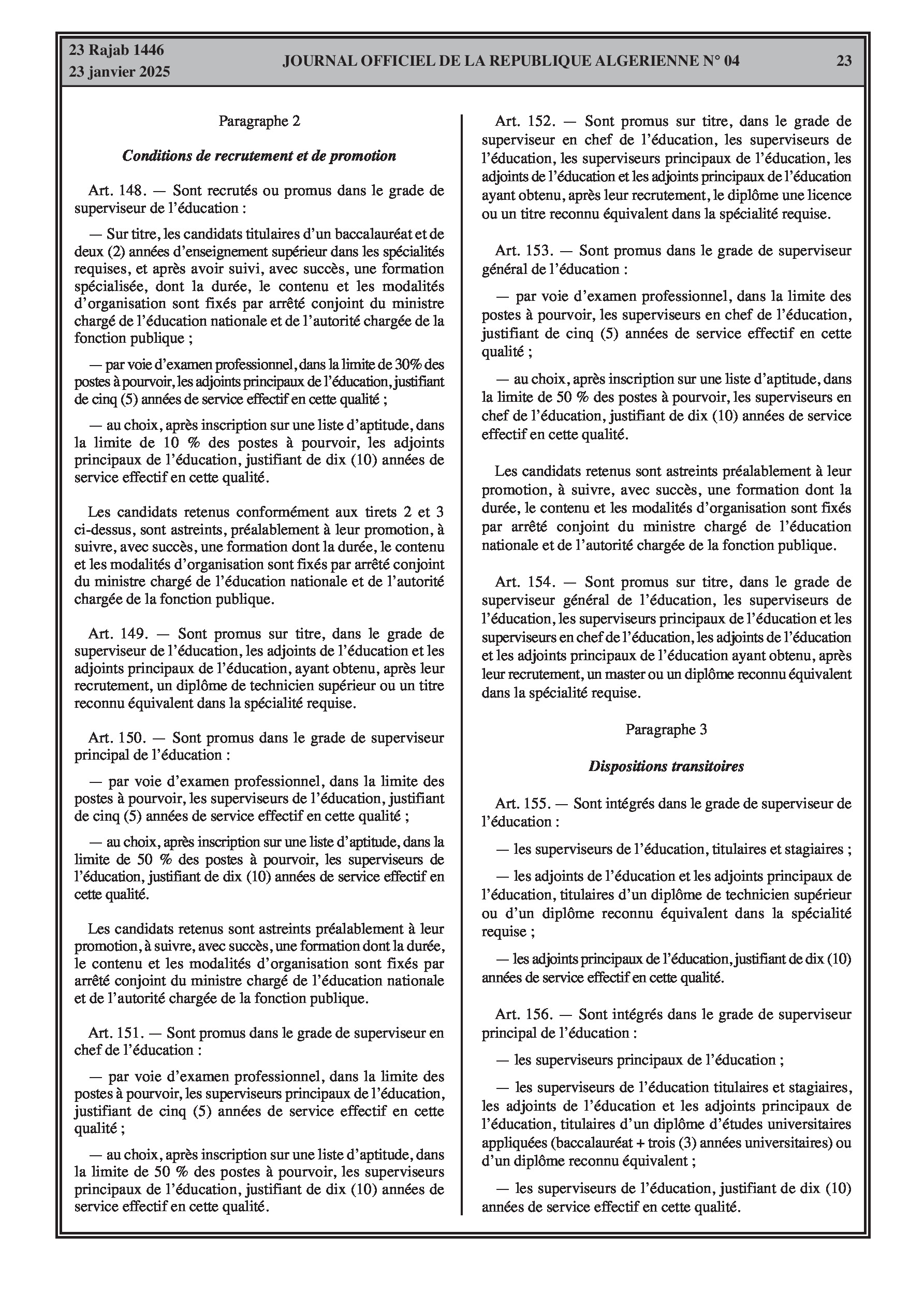 - Décret exécutif n° 25-54 : Définit le nouveau statut particulier applicable aux fonctionnaires des corps spécifiques de l'éducation nationale (enseignants, personnels d'éducation, d'orientation, de laboratoire, d'alimentation scolaire, d'intendance, de direction des établissements, et d'inspection). Détaille les droits et obligations, conditions de recrutement et de promotion, formation, évaluation, mobilité, régime disciplinaire, et procédures d'intégration des personnels actuels. Comprend également la classification de tous les grades et la bonification indiciaire des postes supérieurs (Pages 3-43).