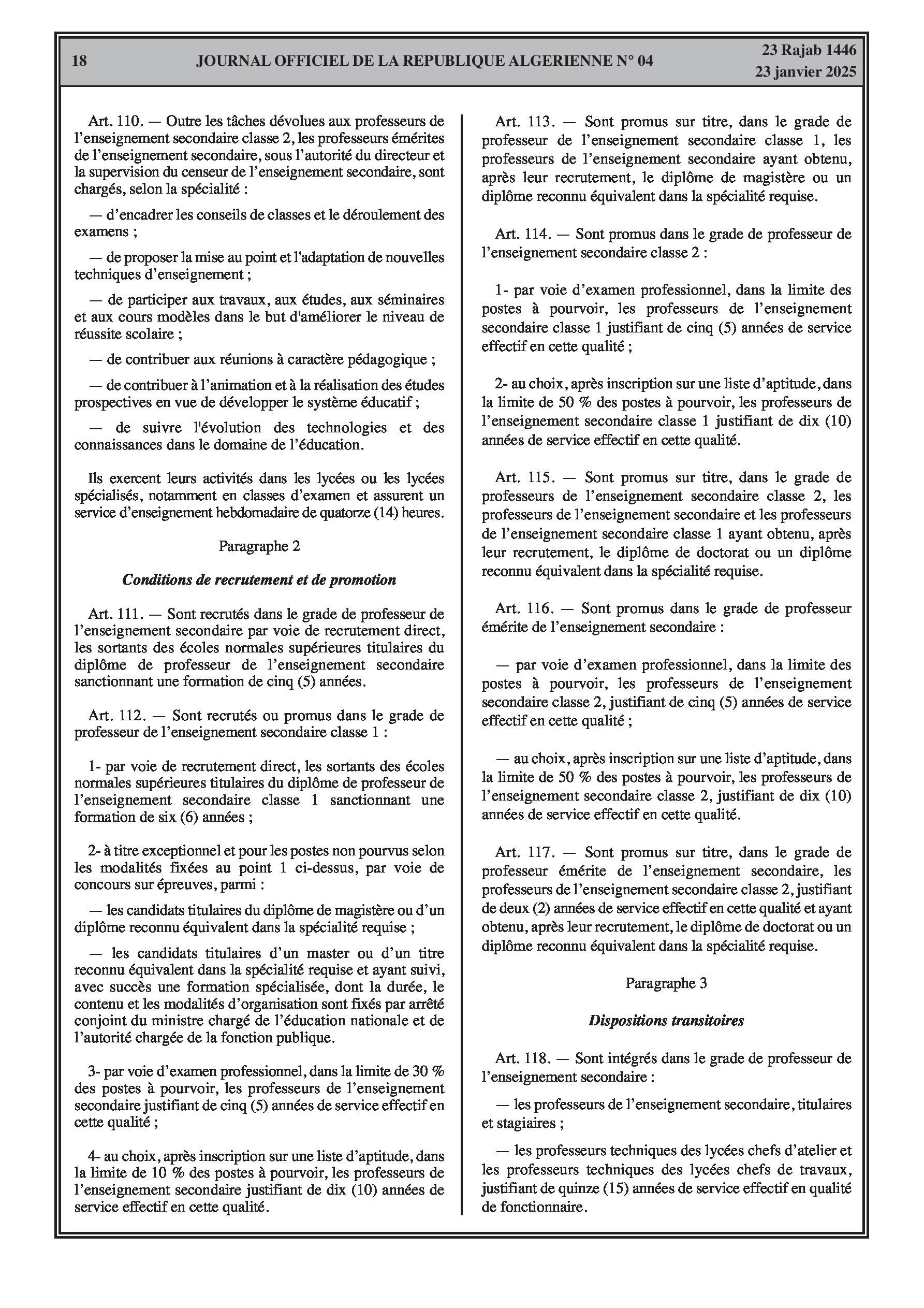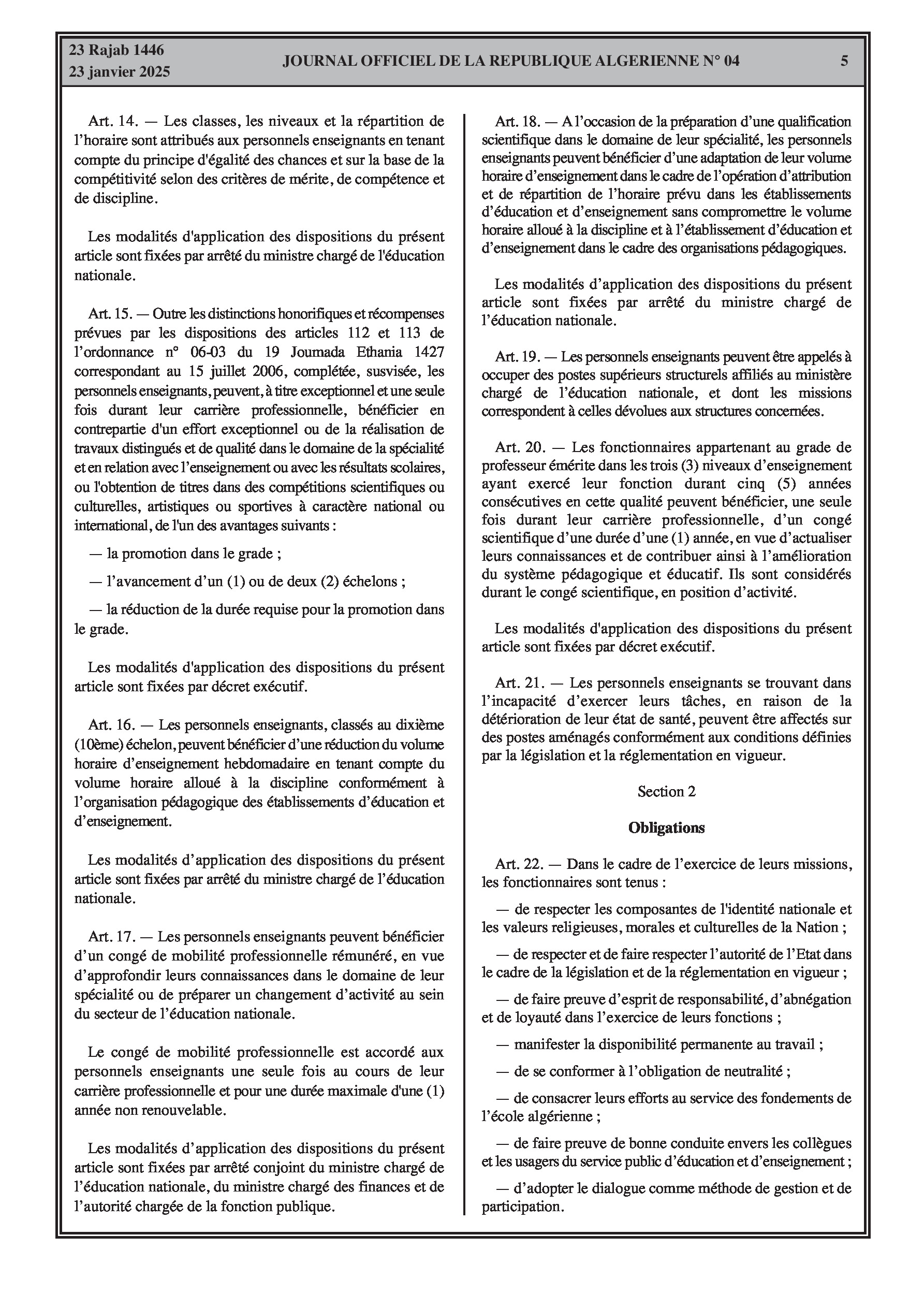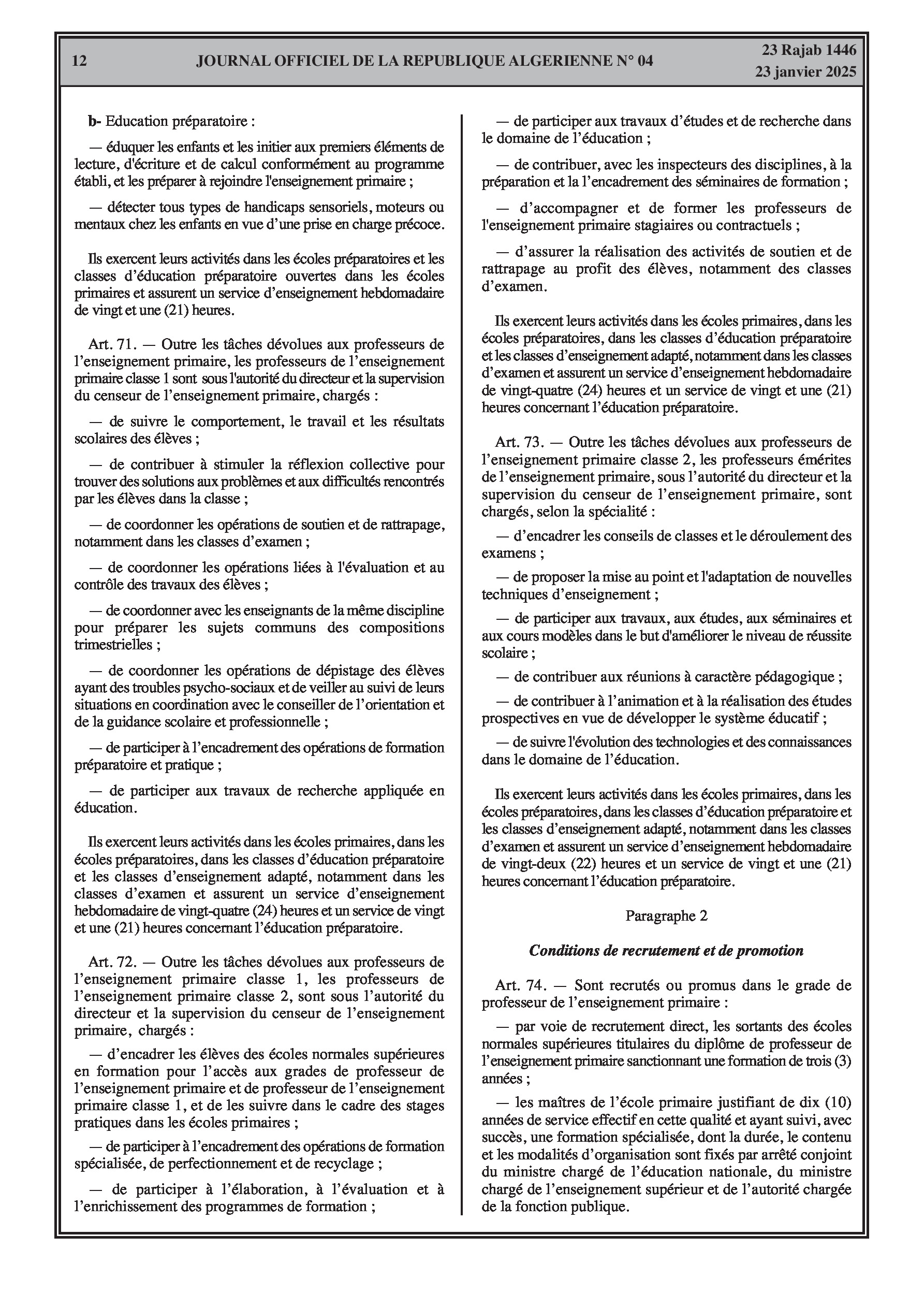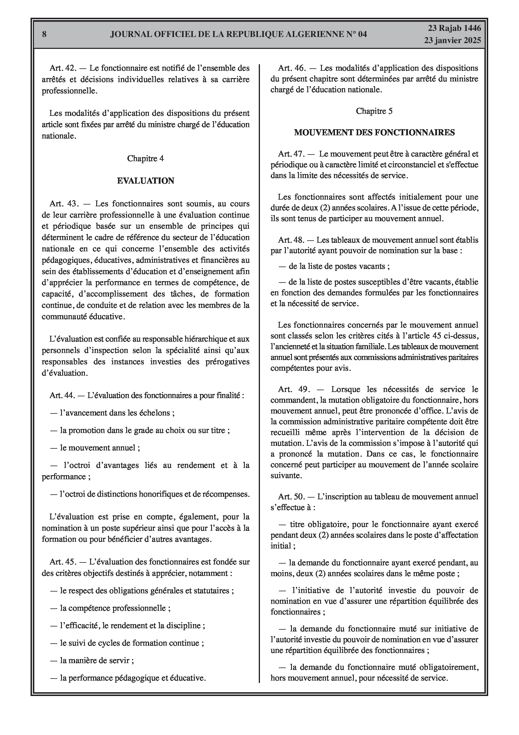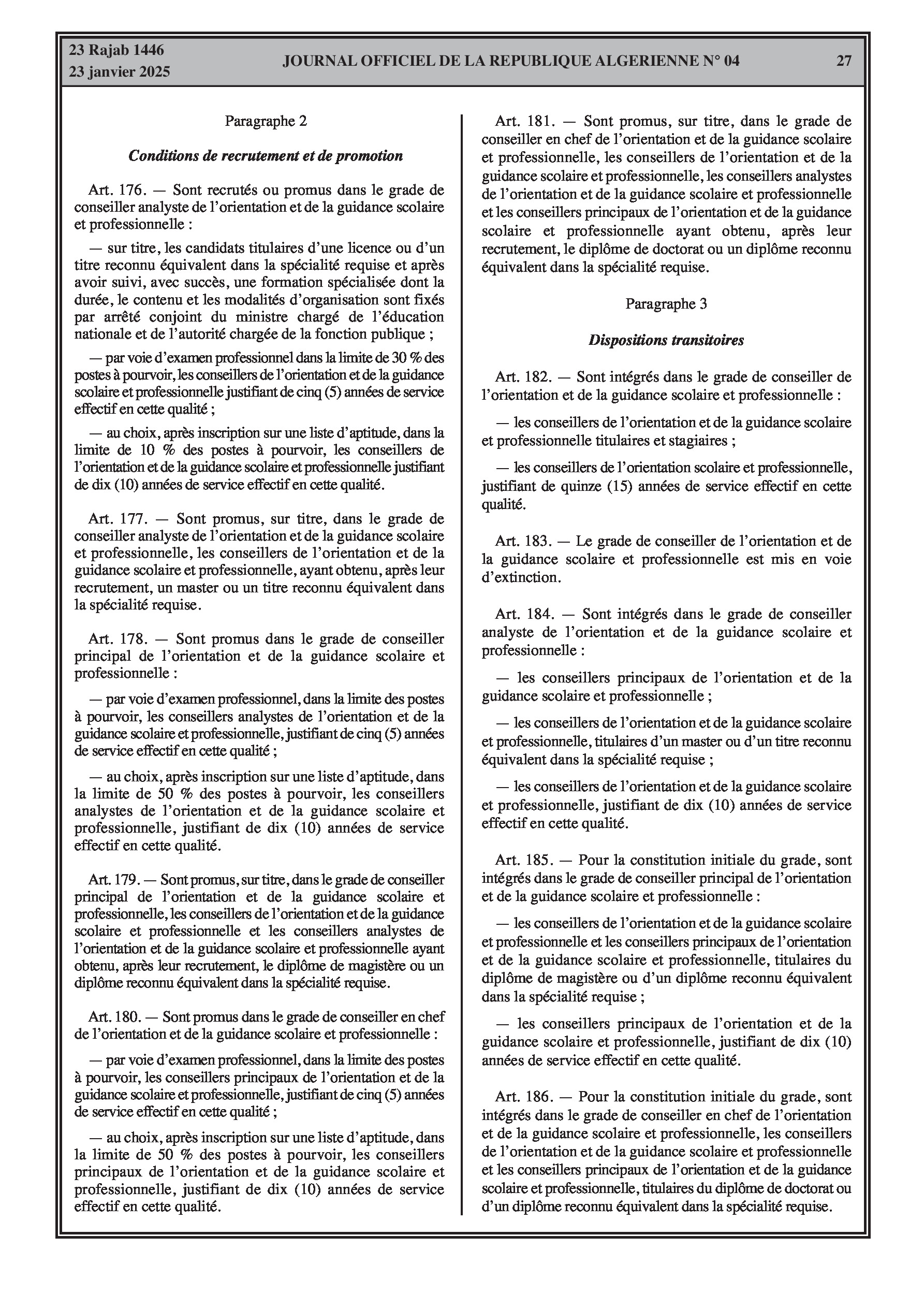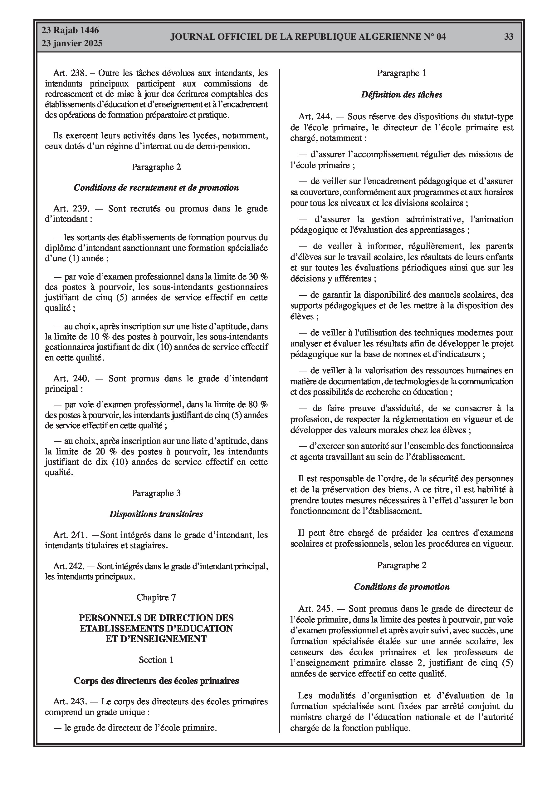 - Décret exécutif n° 25-54 : Définit le nouveau statut particulier applicable aux fonctionnaires des corps spécifiques de l'éducation nationale (enseignants, personnels d'éducation, d'orientation, de laboratoire, d'alimentation scolaire, d'intendance, de direction des établissements, et d'inspection). Détaille les droits et obligations, conditions de recrutement et de promotion, formation, évaluation, mobilité, régime disciplinaire, et procédures d'intégration des personnels actuels. Comprend également la classification de tous les grades et la bonification indiciaire des postes supérieurs (Pages 3-43).