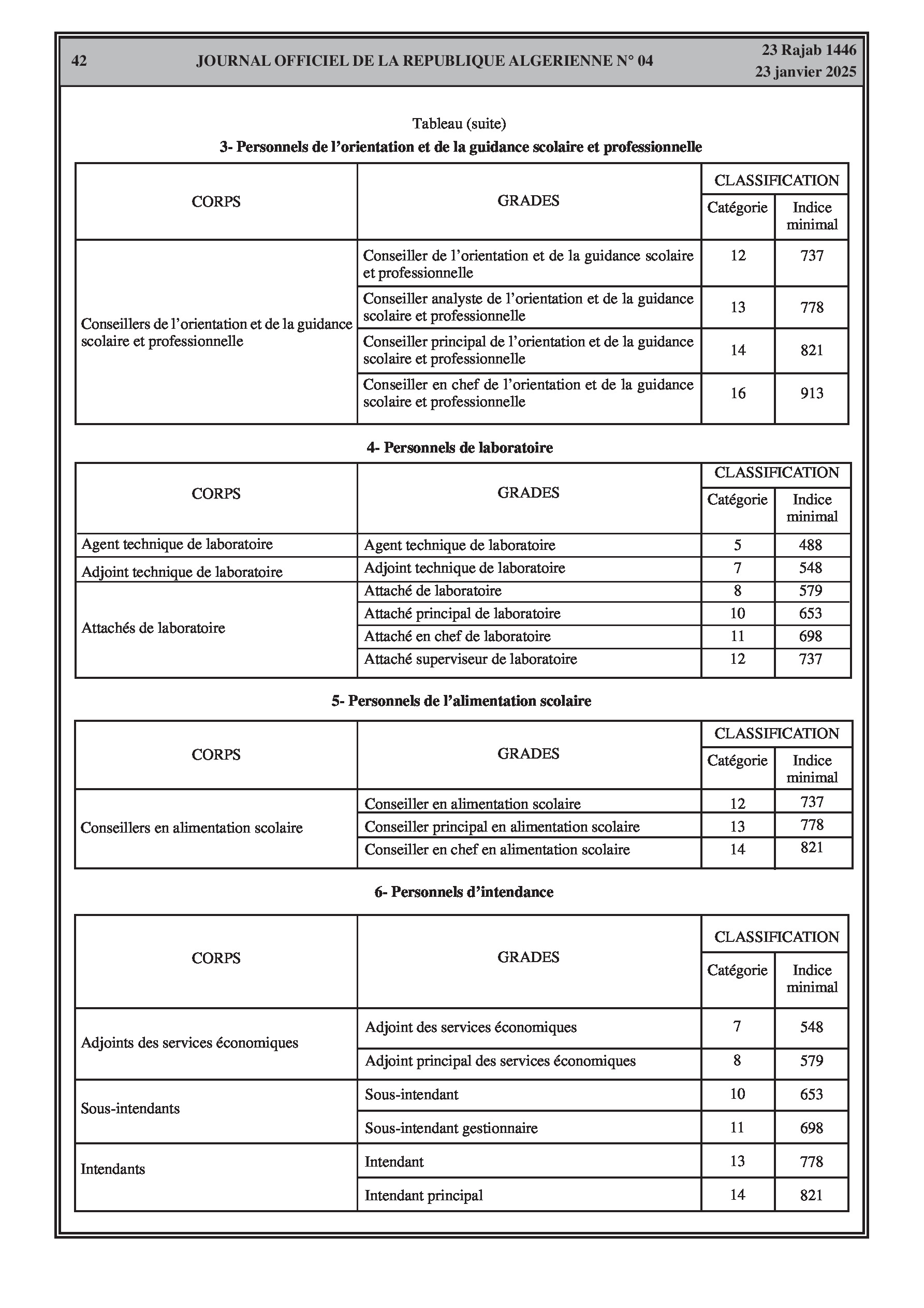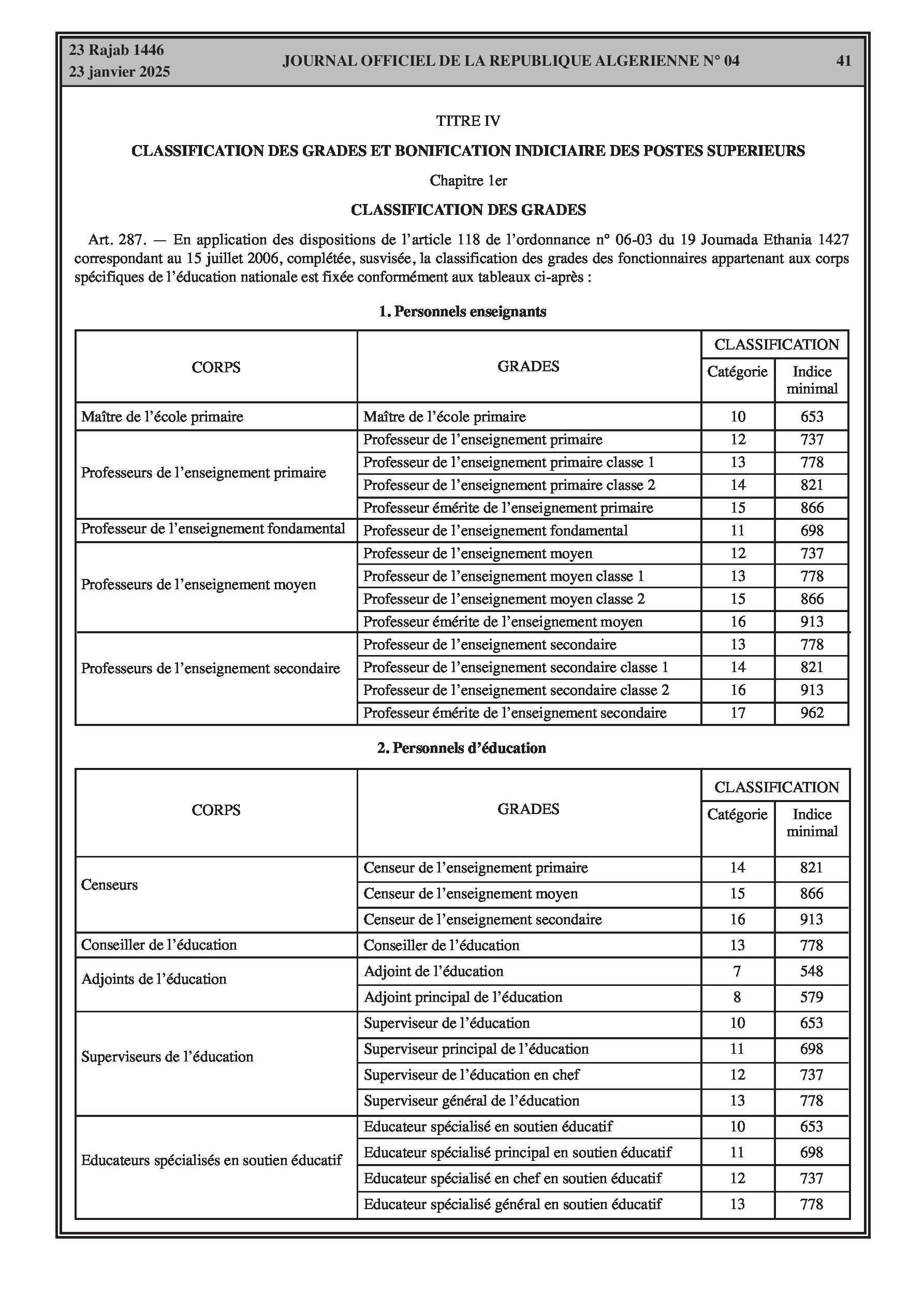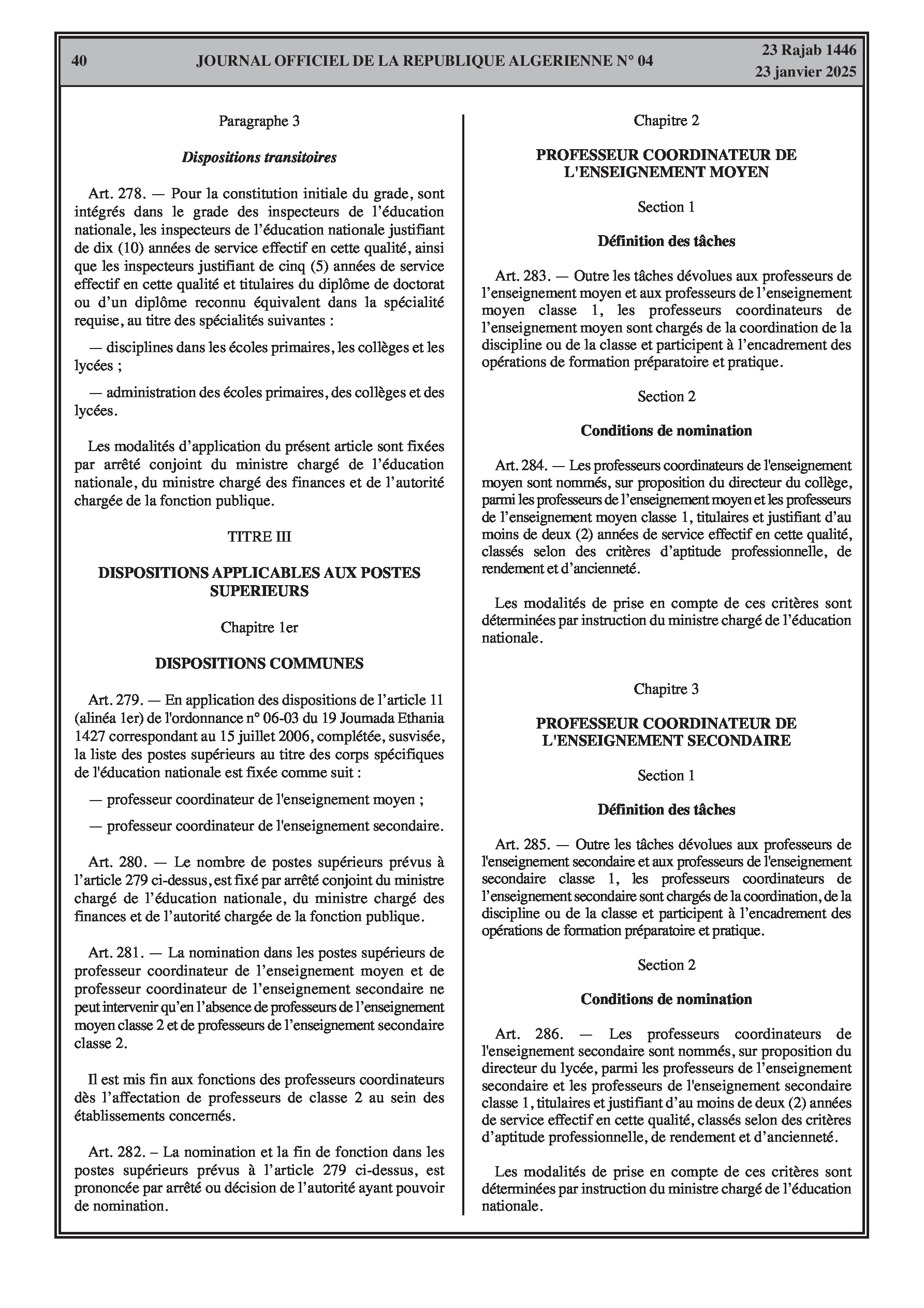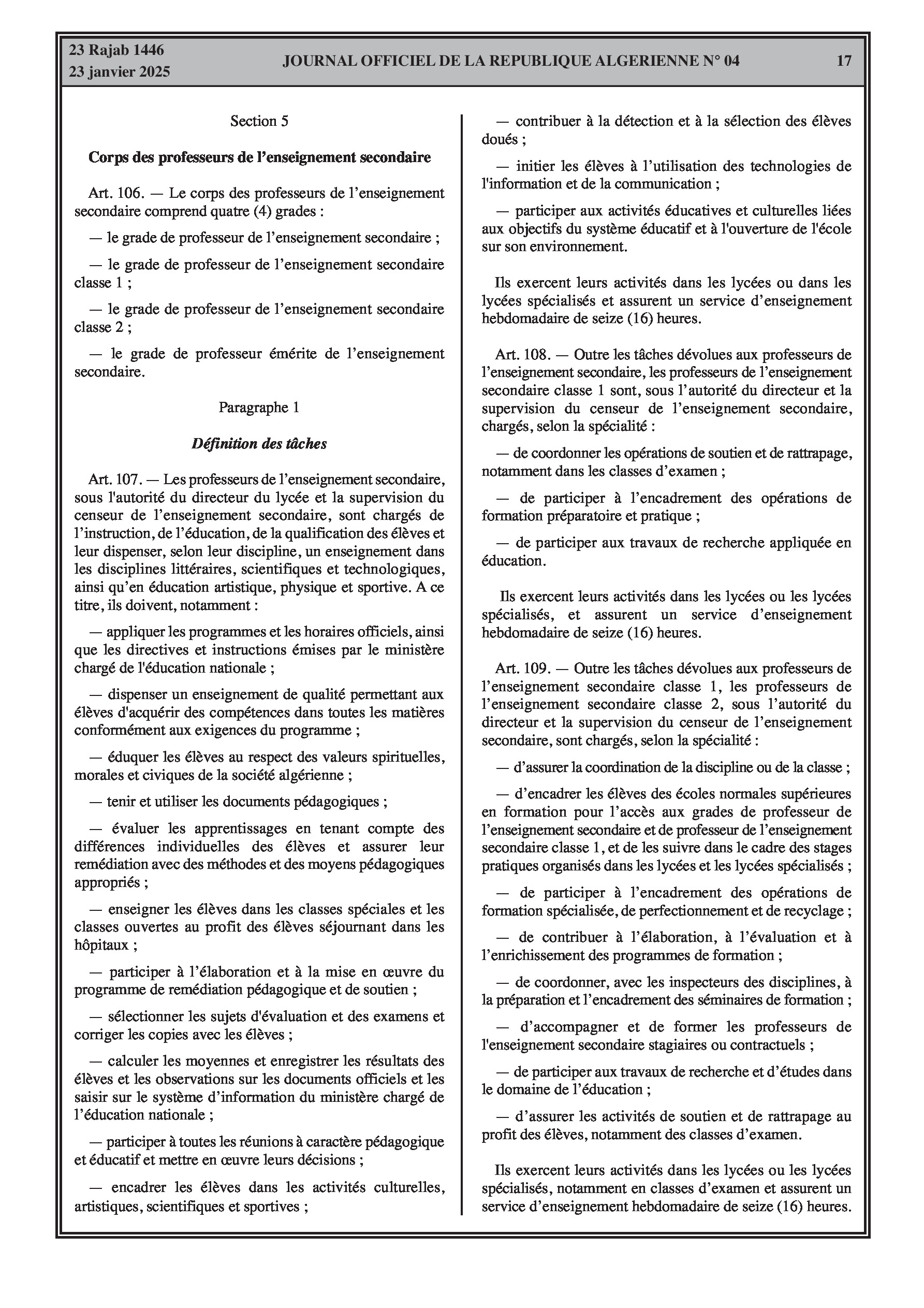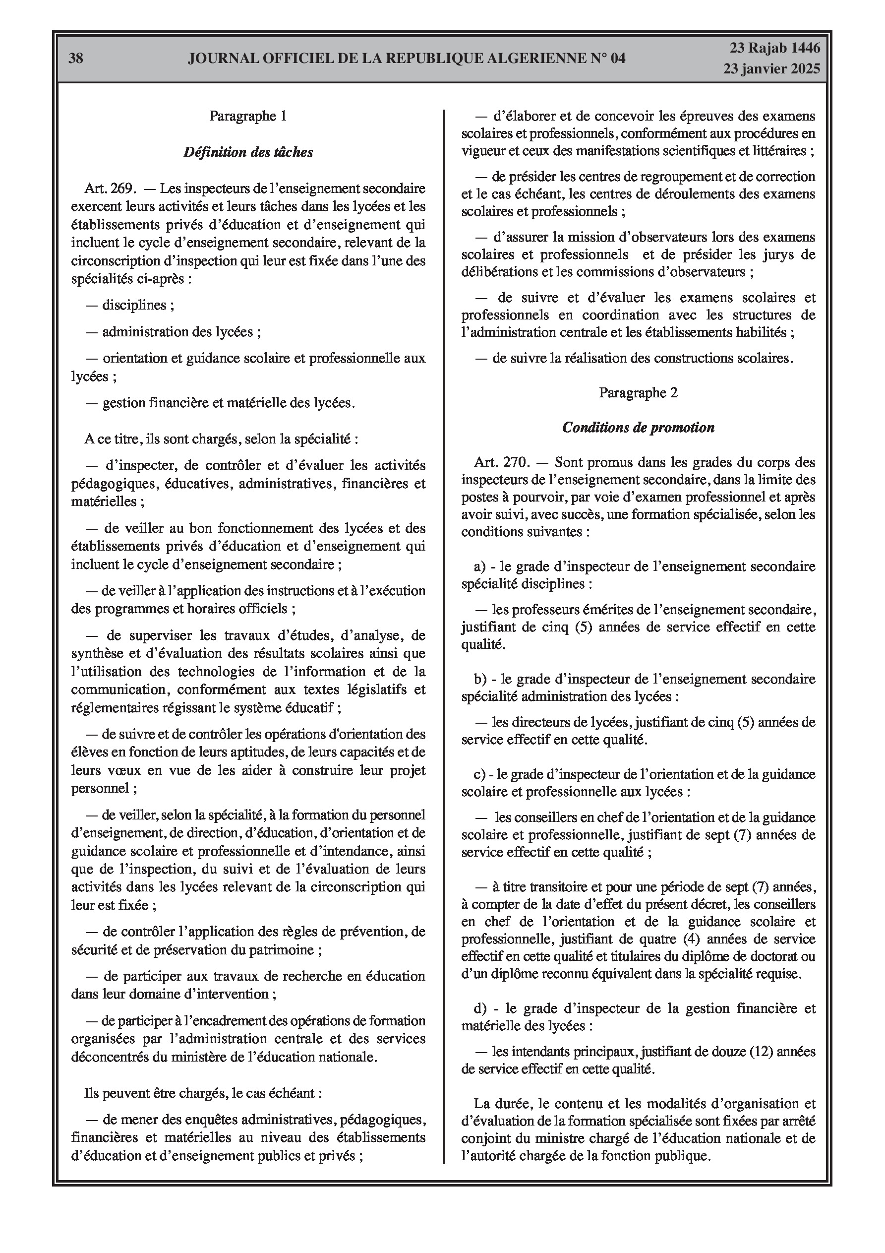 - Décret exécutif n° 25-54 : Définit le nouveau statut particulier applicable aux fonctionnaires des corps spécifiques de l'éducation nationale (enseignants, personnels d'éducation, d'orientation, de laboratoire, d'alimentation scolaire, d'intendance, de direction des établissements, et d'inspection). Détaille les droits et obligations, conditions de recrutement et de promotion, formation, évaluation, mobilité, régime disciplinaire, et procédures d'intégration des personnels actuels. Comprend également la classification de tous les grades et la bonification indiciaire des postes supérieurs (Pages 3-43).