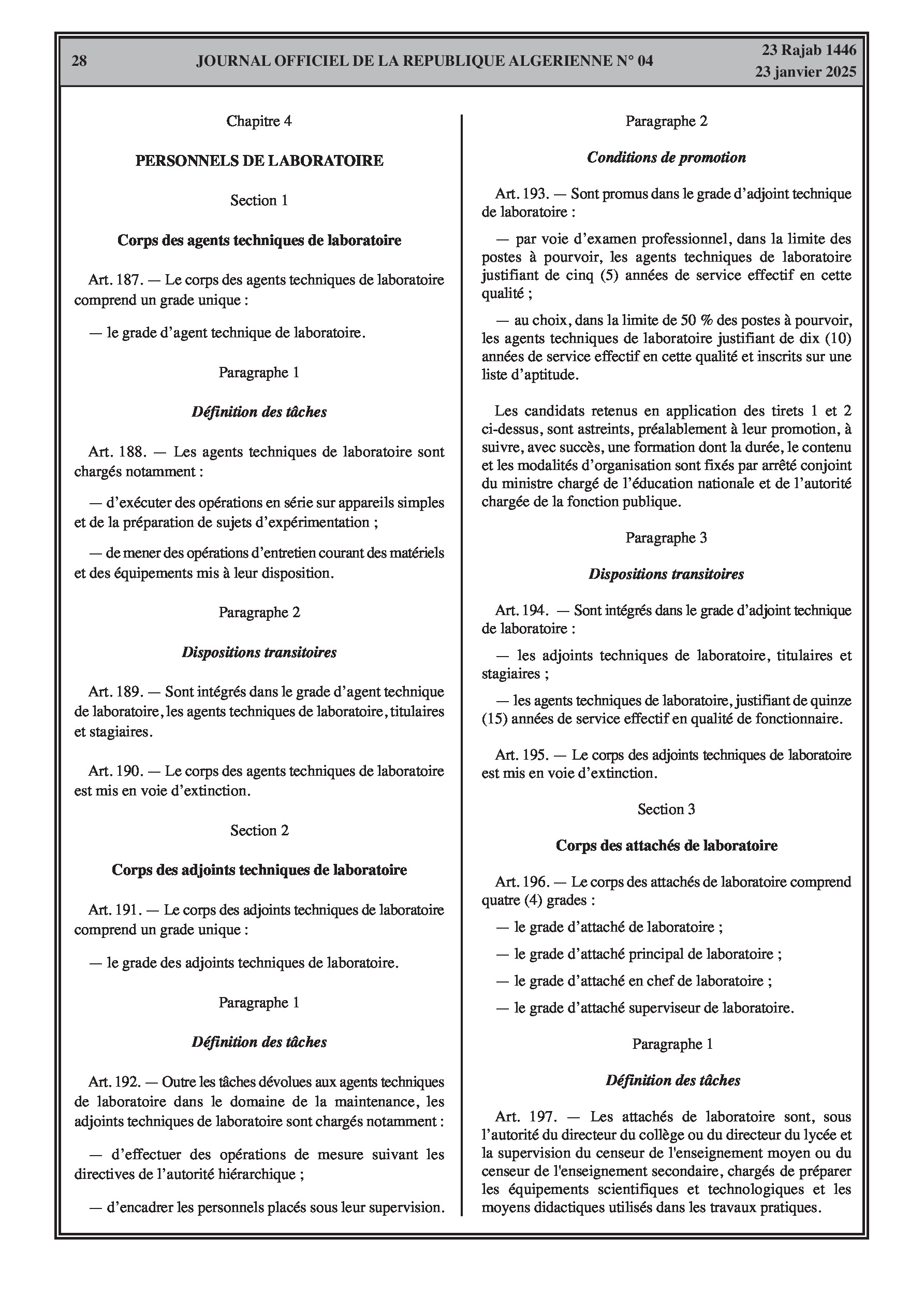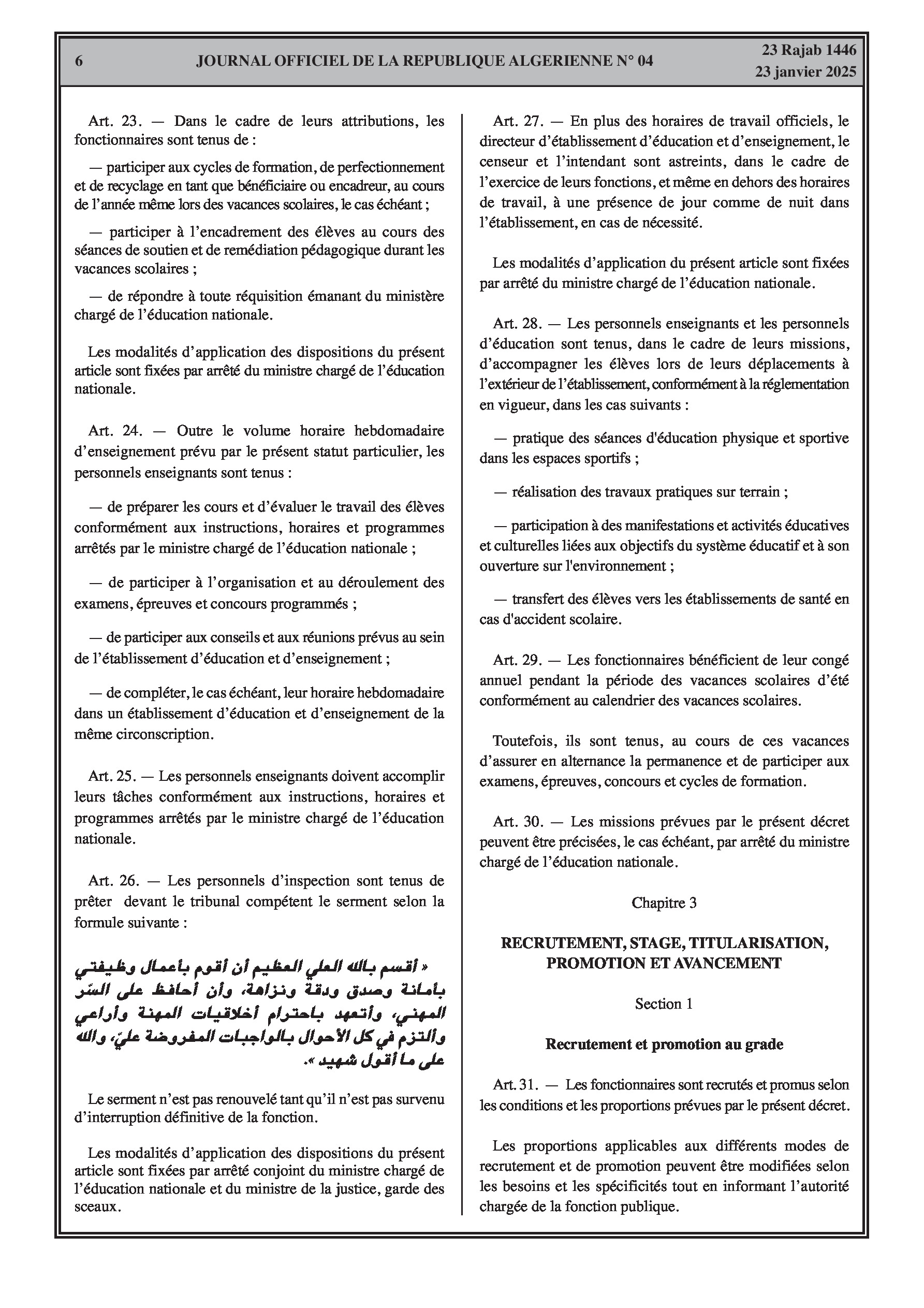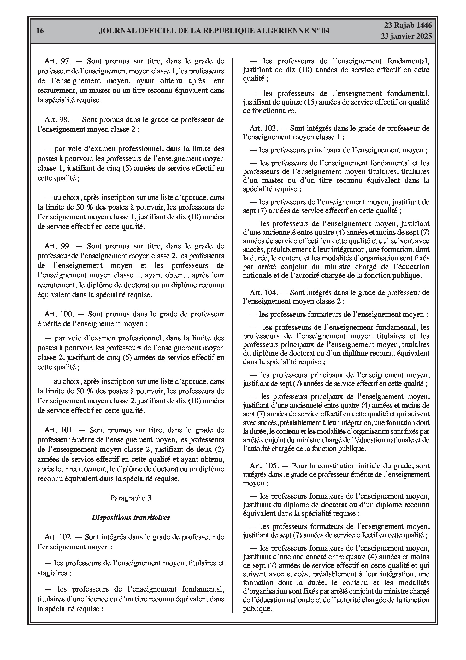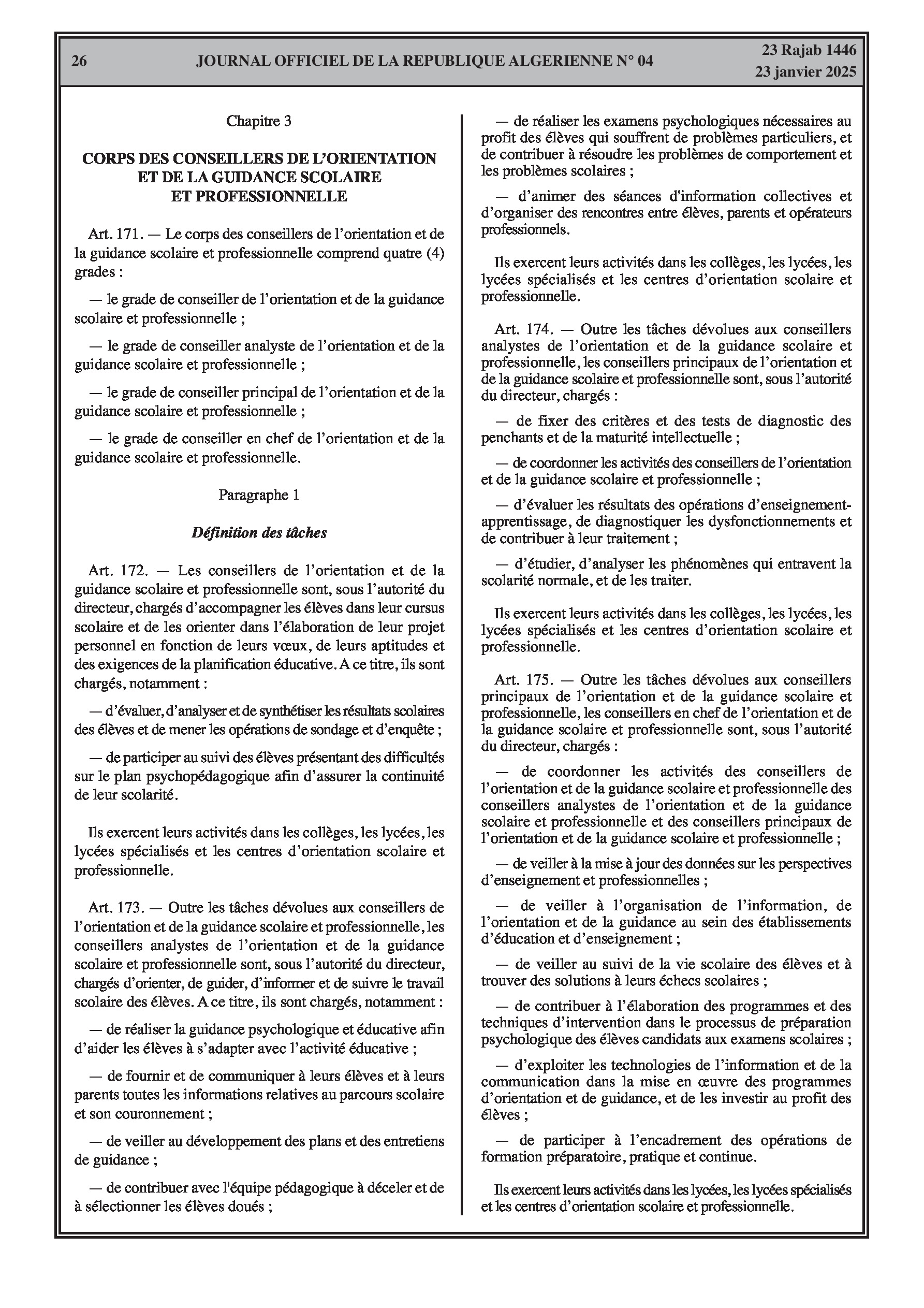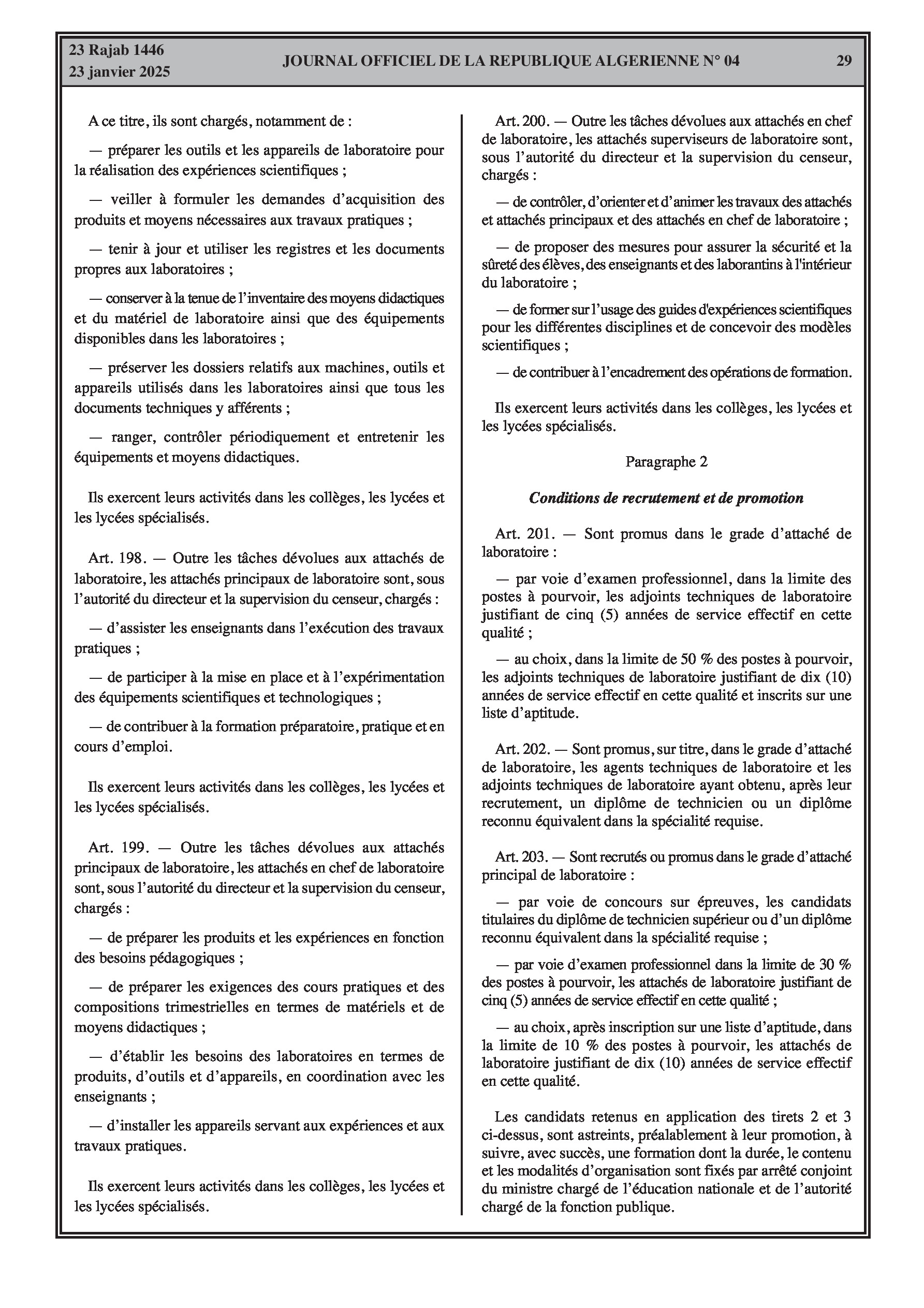 - Décret exécutif n° 25-54 : Définit le nouveau statut particulier applicable aux fonctionnaires des corps spécifiques de l'éducation nationale (enseignants, personnels d'éducation, d'orientation, de laboratoire, d'alimentation scolaire, d'intendance, de direction des établissements, et d'inspection). Détaille les droits et obligations, conditions de recrutement et de promotion, formation, évaluation, mobilité, régime disciplinaire, et procédures d'intégration des personnels actuels. Comprend également la classification de tous les grades et la bonification indiciaire des postes supérieurs (Pages 3-43).