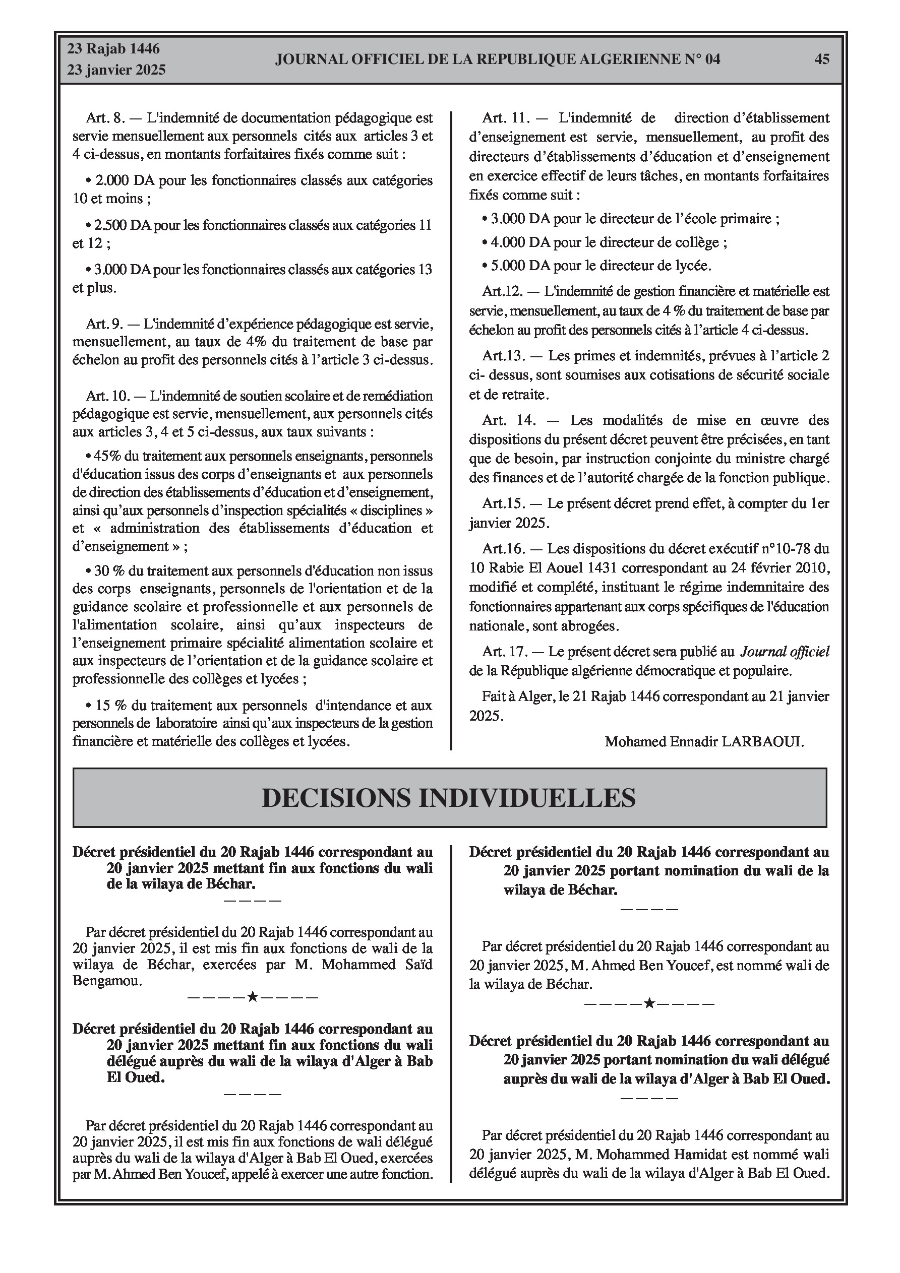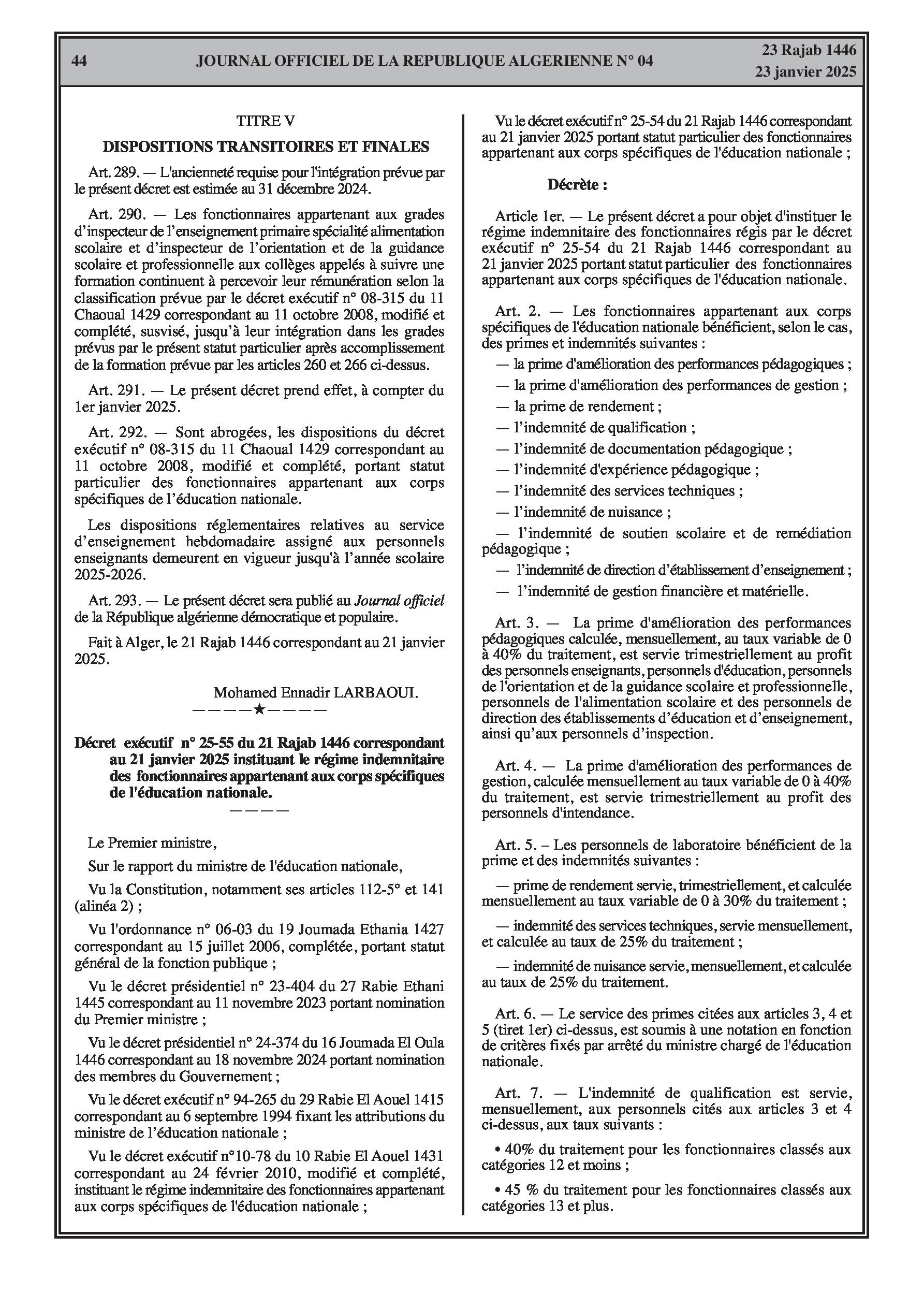 - Décret exécutif n° 25-55 : Institue un nouveau régime indemnitaire pour les fonctionnaires de l'éducation nationale, incluant des primes d'amélioration des performances pédagogiques et de gestion, une prime de rendement, des indemnités de qualification, de documentation pédagogique, d'expérience pédagogique, ainsi que des indemnités pour services techniques, nuisance, soutien scolaire, direction d'établissement, et gestion financière et matérielle (Pages 44-45).