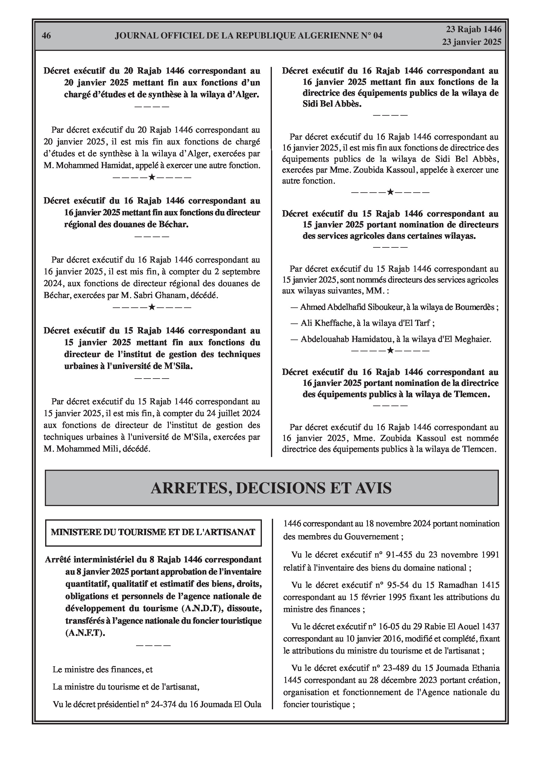 - Ministère du Tourisme et de l'Artisanat : Arrêté interministériel du 8 janvier 2025 portant approbation de l'inventaire quantitatif, qualitatif et estimatif des biens, droits, obligations et personnels de l'Agence Nationale de Développement du Tourisme (A.N.D.T), dissoute, transférés à l'Agence Nationale du Foncier Touristique (A.N.F.T).