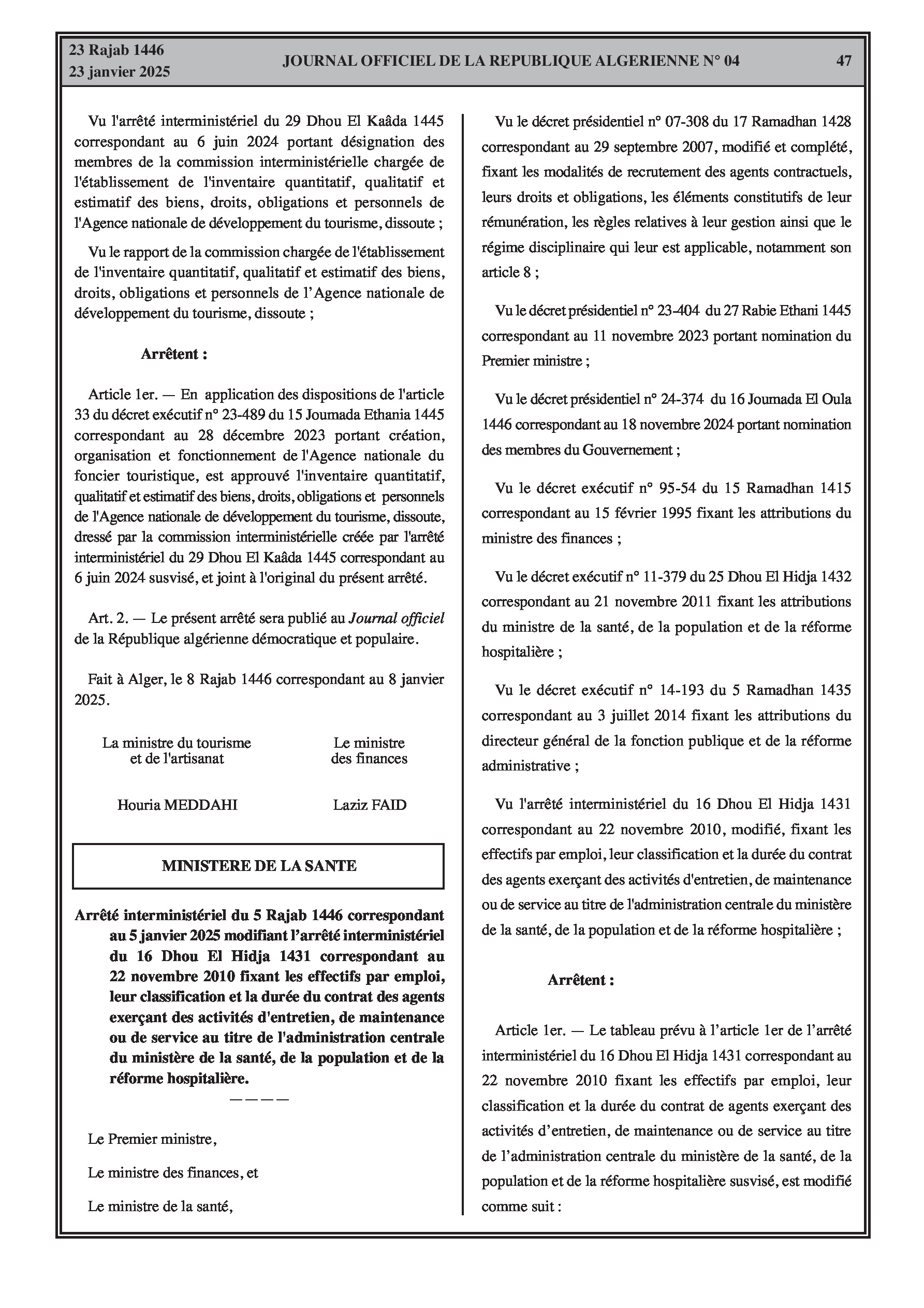 Arrêtés interministériels : le premier concerne l'approbation du transfert des biens de l'Agence de Développement du Tourisme à l'Agence du Foncier Touristique, et le second modifie les effectifs et la classification des agents d'entretien et de service au ministère de la Santé.