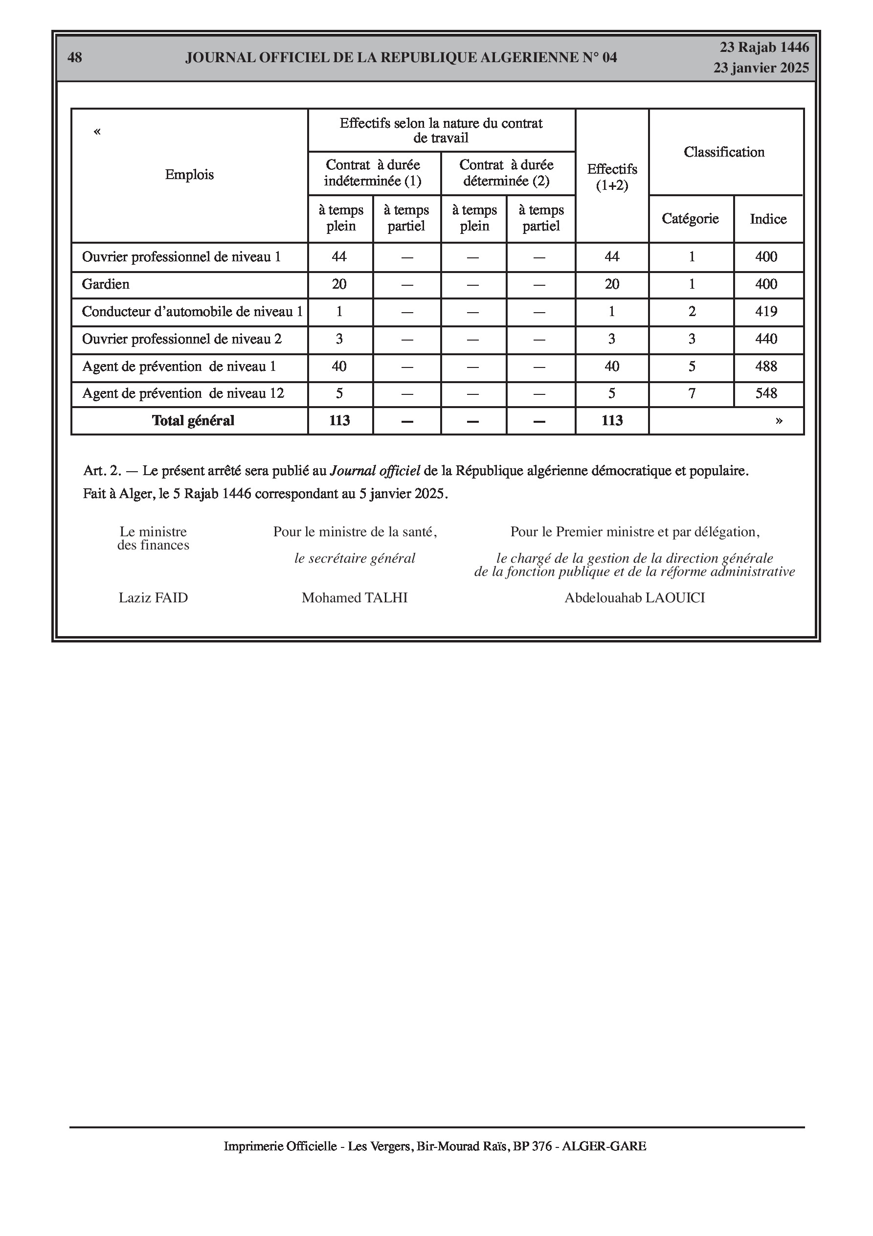 - Ministère de la Santé : Arrêté interministériel du 5 janvier 2025 modifiant l'arrêté du 22 novembre 2010 fixant les effectifs par emploi, leur classification et la durée du contrat des agents contractuels exerçant des activités d'entretien, de maintenance ou de service au titre de l'administration centrale du ministère de la Santé, de la Population et de la Réforme hospitalière.