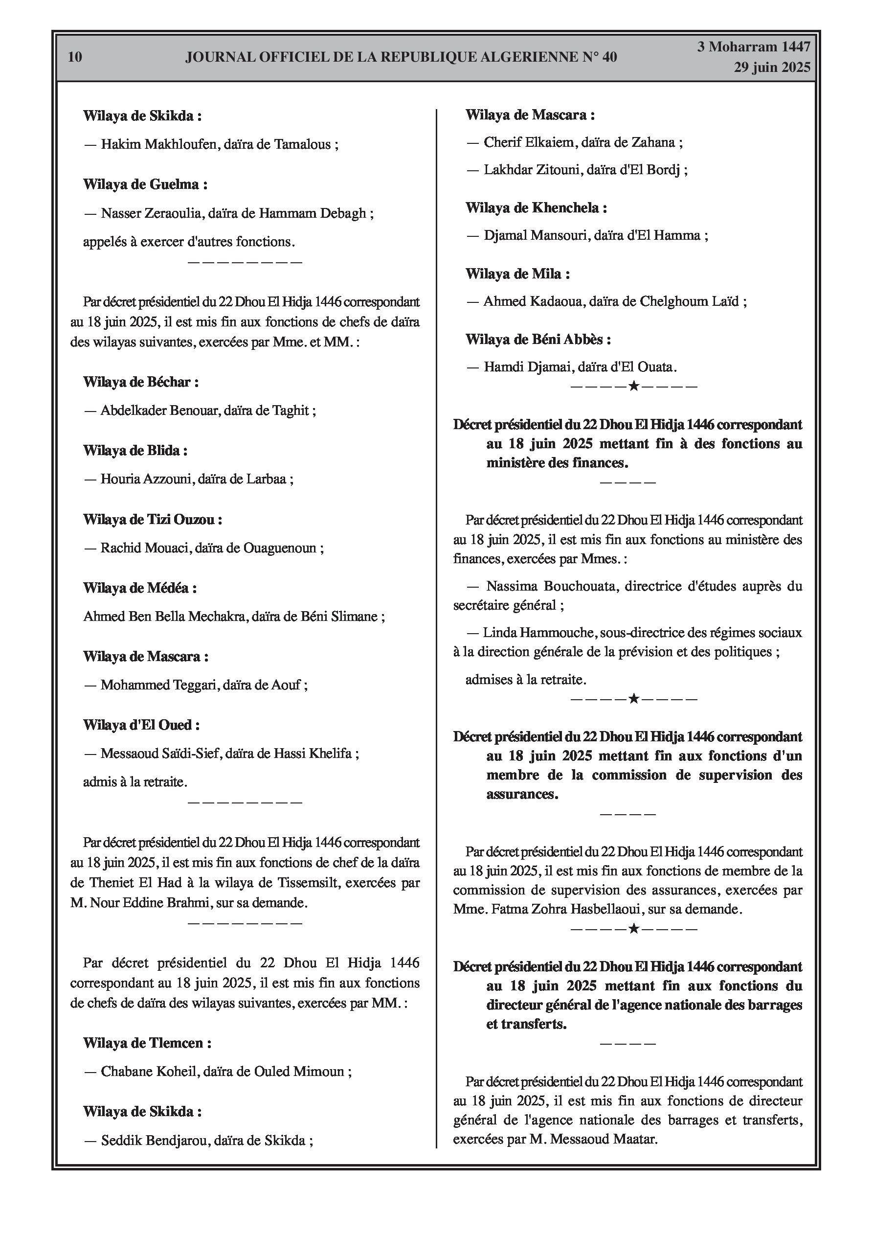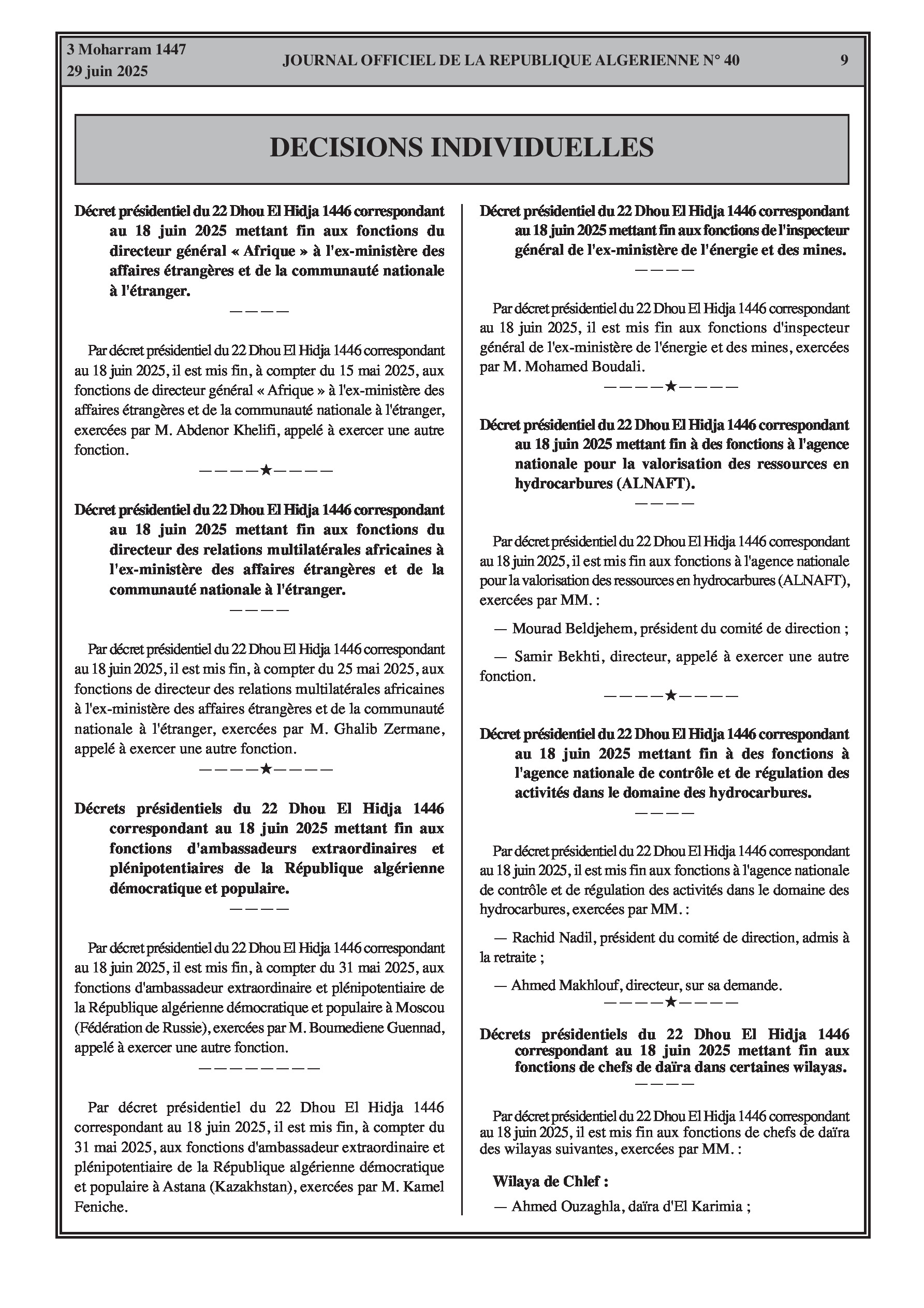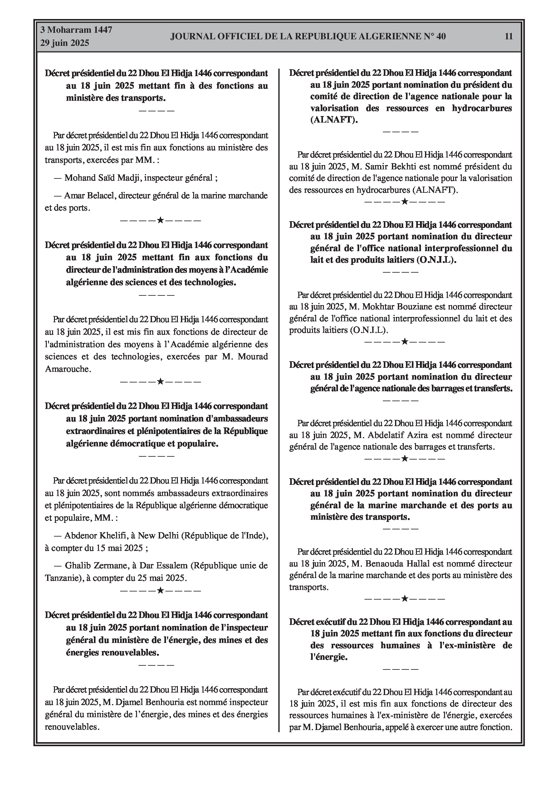 Des fins de fonctions et nominations ont touché les secteurs des Affaires étrangères (ambassadeurs, directeurs), de l'Énergie et des Mines (ALNAFT, Inspecteur général), des Transports (Directeur général de la marine marchande et des ports), des Ressources en eau (Agence nationale des barrages et transferts), et d'autres administrations.