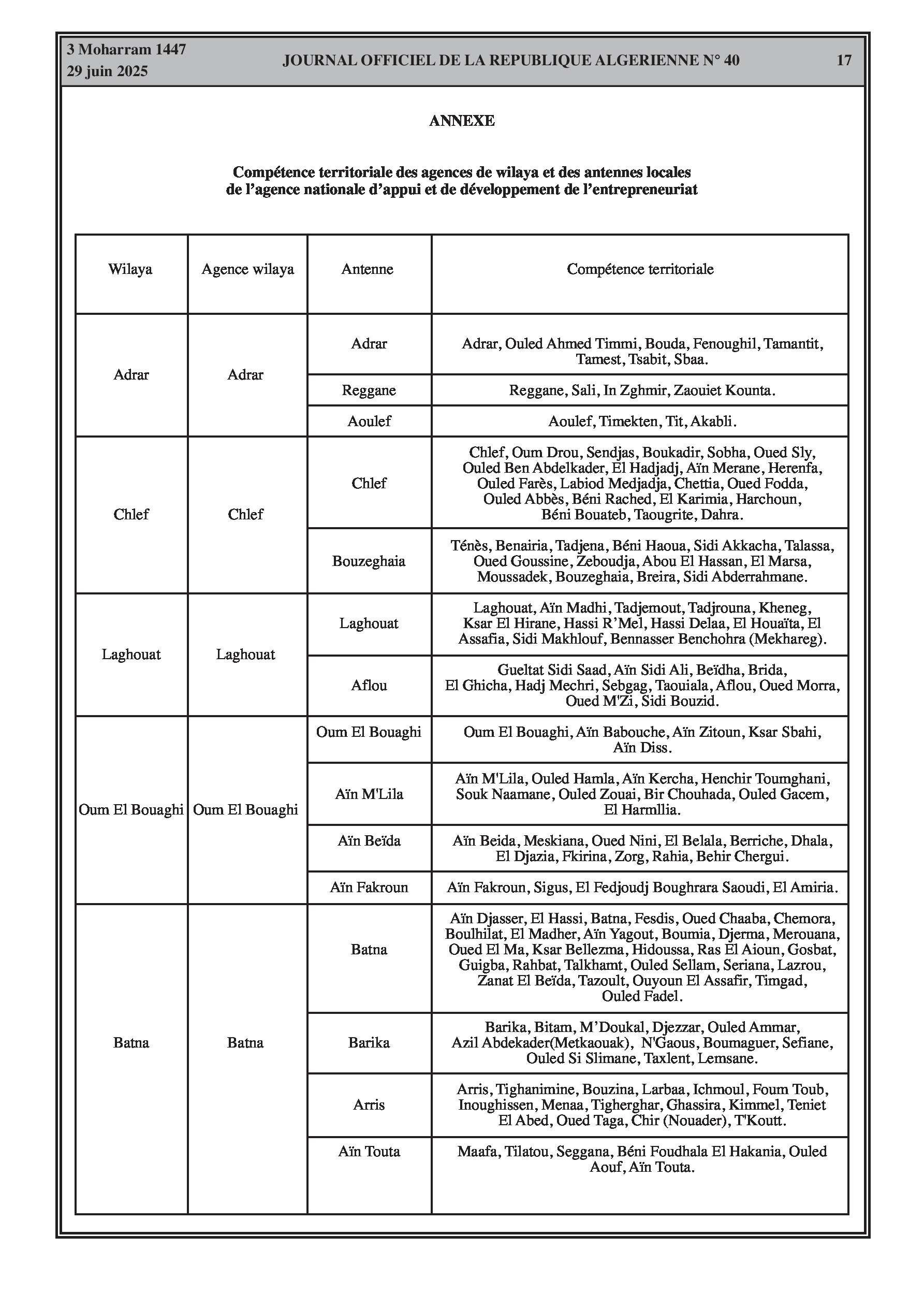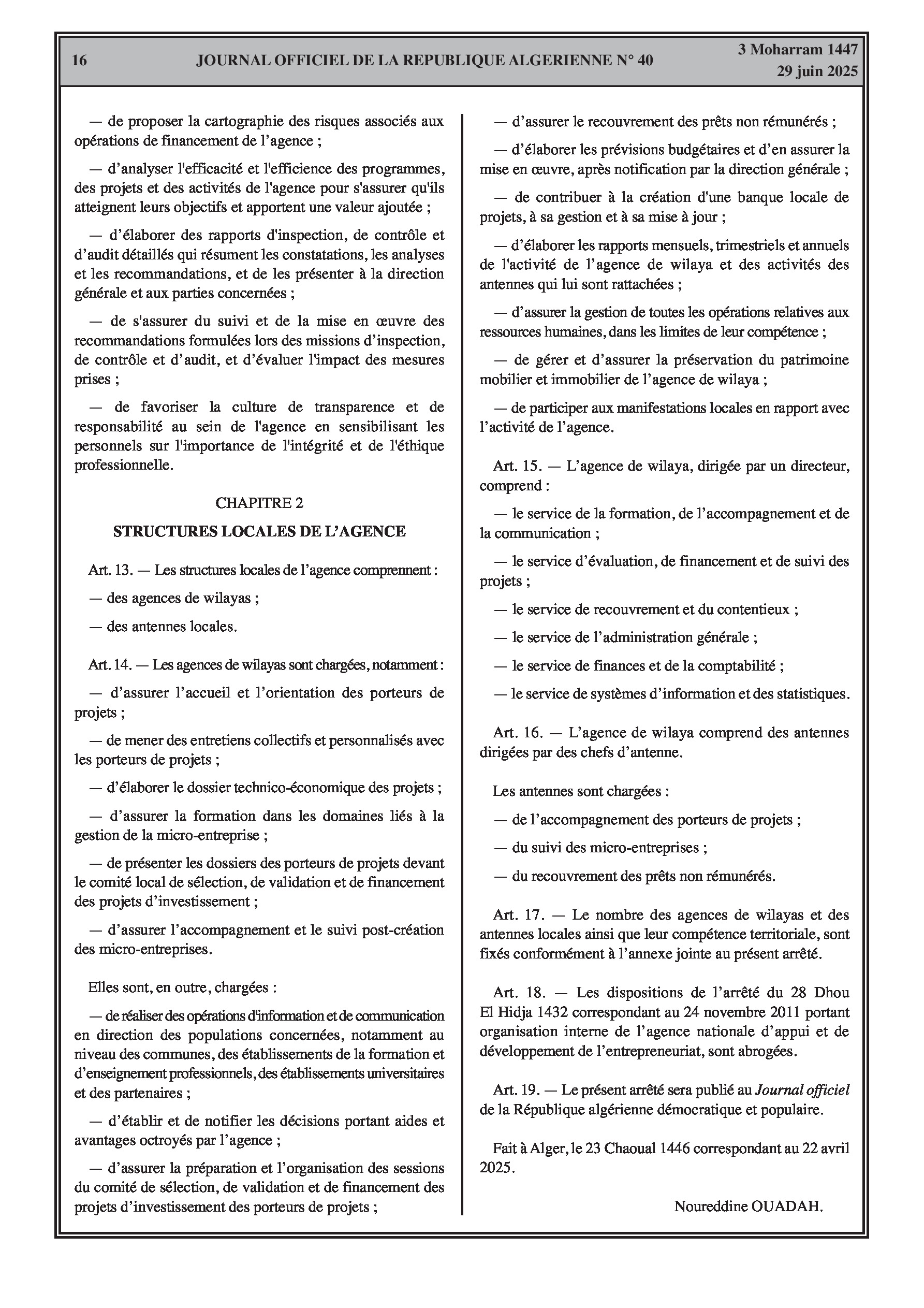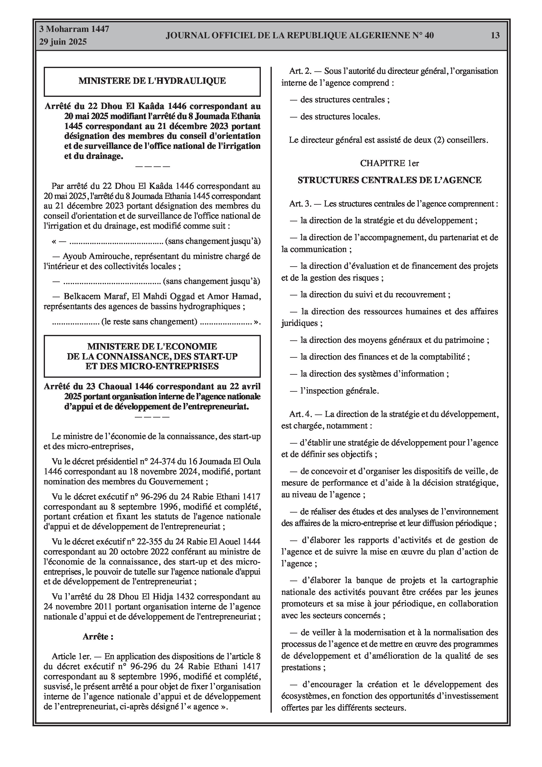 L'arrêté définit l'organisation interne de l'Agence nationale d'appui et de développement de l'entrepreneuriat, détaillant ses structures centrales et locales ainsi que ses missions. Les listes des membres des conseils d'administration de l'Institut algérien de la normalisation (IANOR) et de l'Office national de l'irrigation et du drainage ont été modifiées, ainsi que le conseil scientifique du Centre de recherche en astronomie, astrophysique et géophysique (CRAAG).