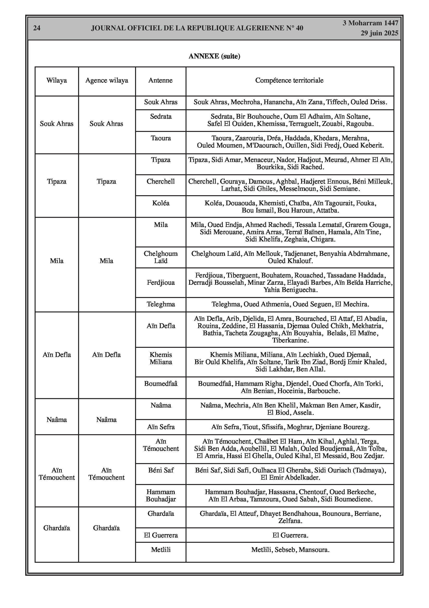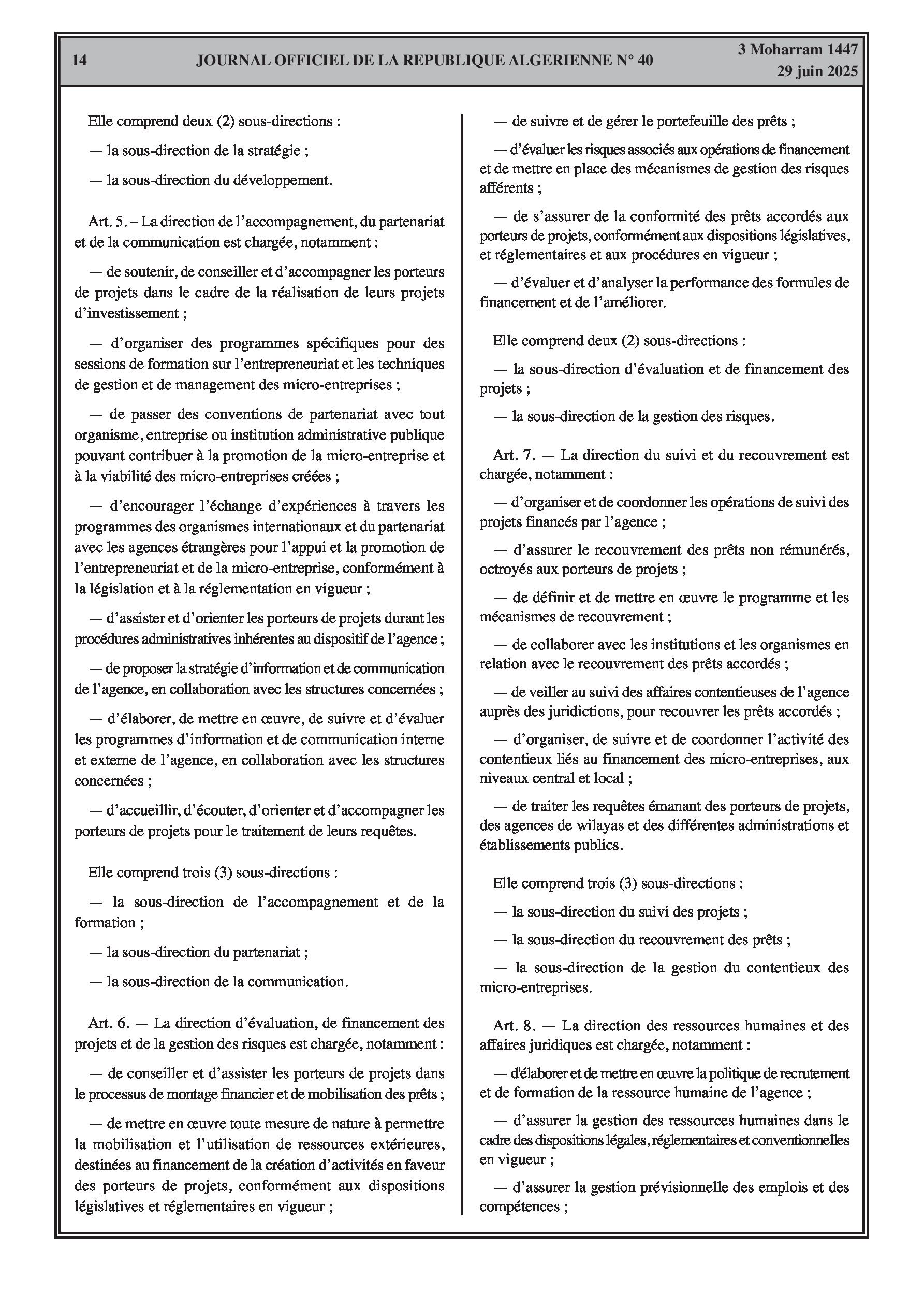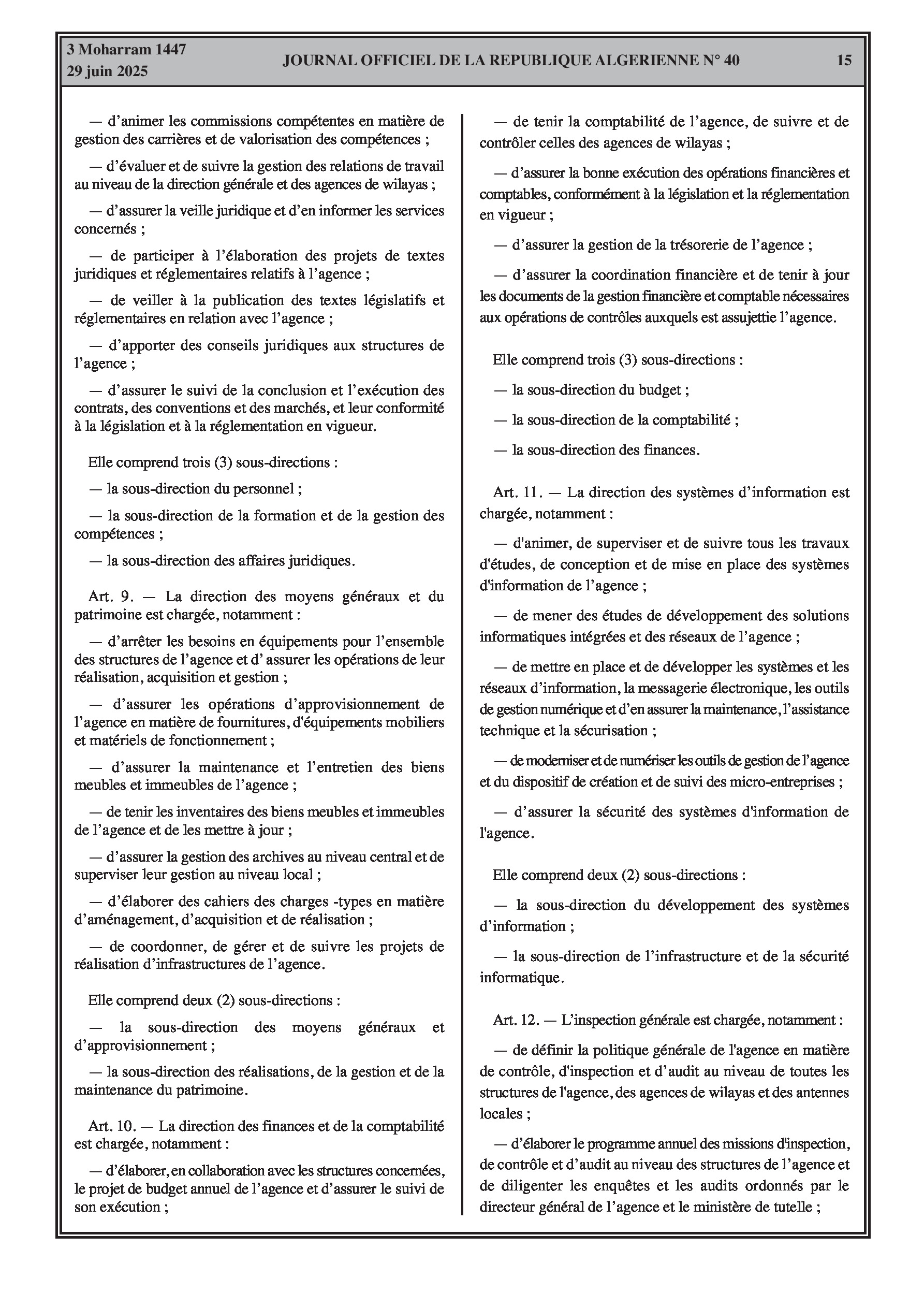 L'arrêté définit l'organisation interne de l'Agence nationale d'appui et de développement de l'entrepreneuriat, détaillant ses structures centrales et locales ainsi que ses missions. Les listes des membres des conseils d'administration de l'Institut algérien de la normalisation (IANOR) et de l'Office national de l'irrigation et du drainage ont été modifiées, ainsi que le conseil scientifique du Centre de recherche en astronomie, astrophysique et géophysique (CRAAG).