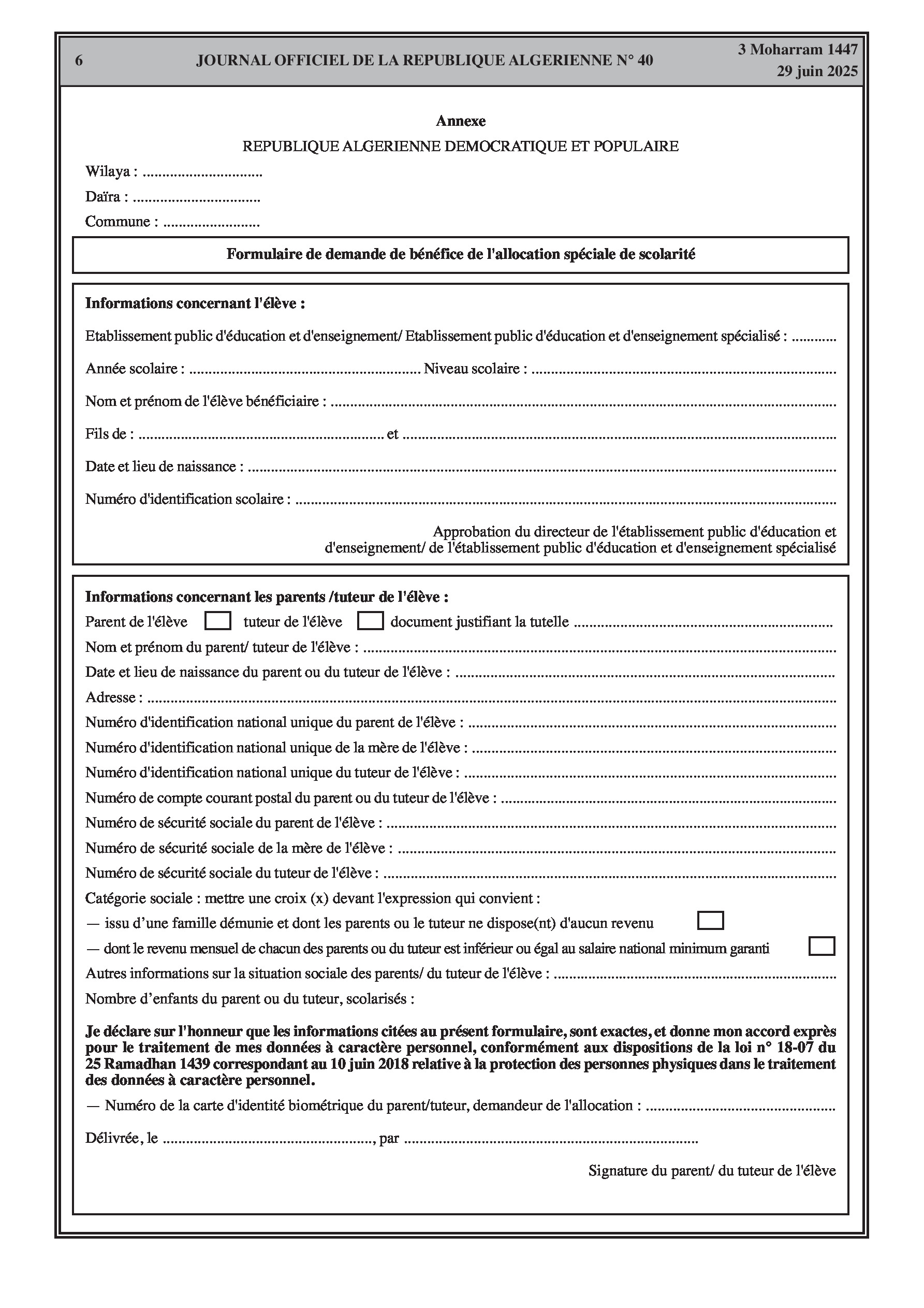 Un décret exécutif fixe les conditions et modalités de l'allocation spéciale de scolarité, visant à soutenir les familles démunies à chaque rentrée scolaire.