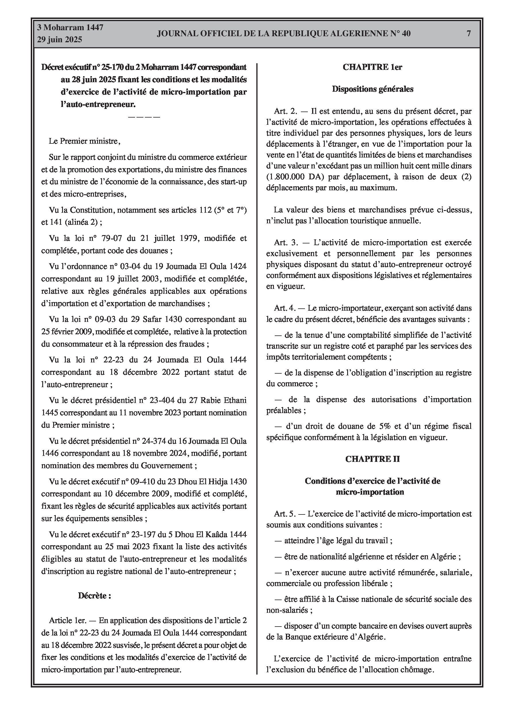 Les auto-entrepreneurs peuvent importer des marchandises d'une valeur n'excédant pas 1,8 million de DA par voyage (deux voyages par mois maximum). Les marchandises sont soumises à un droit de douane de 5%. Le micro-importateur doit détenir une carte d'auto-entrepreneur et un compte bancaire en devises. La déclaration des marchandises se fait via une plateforme numérique.