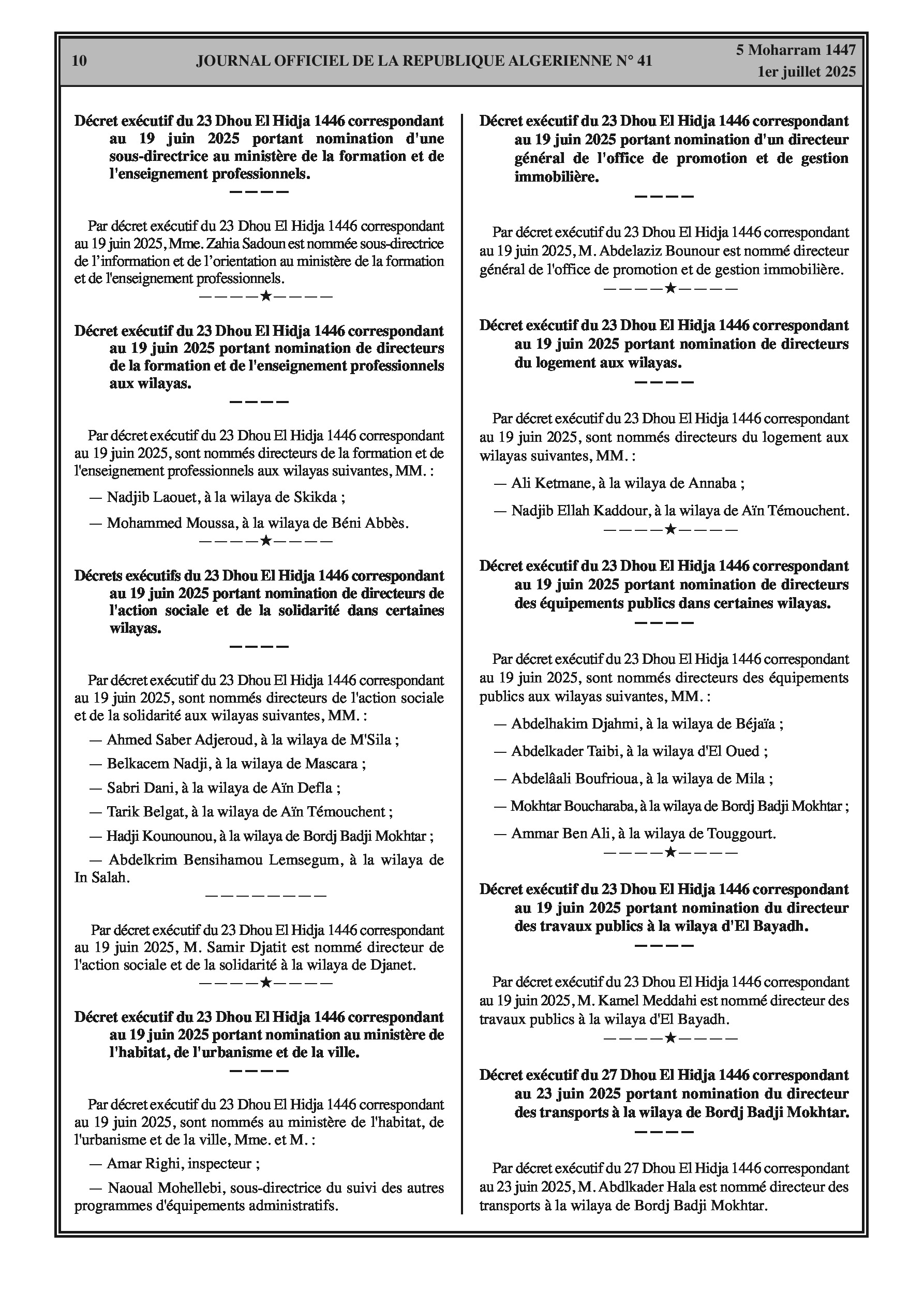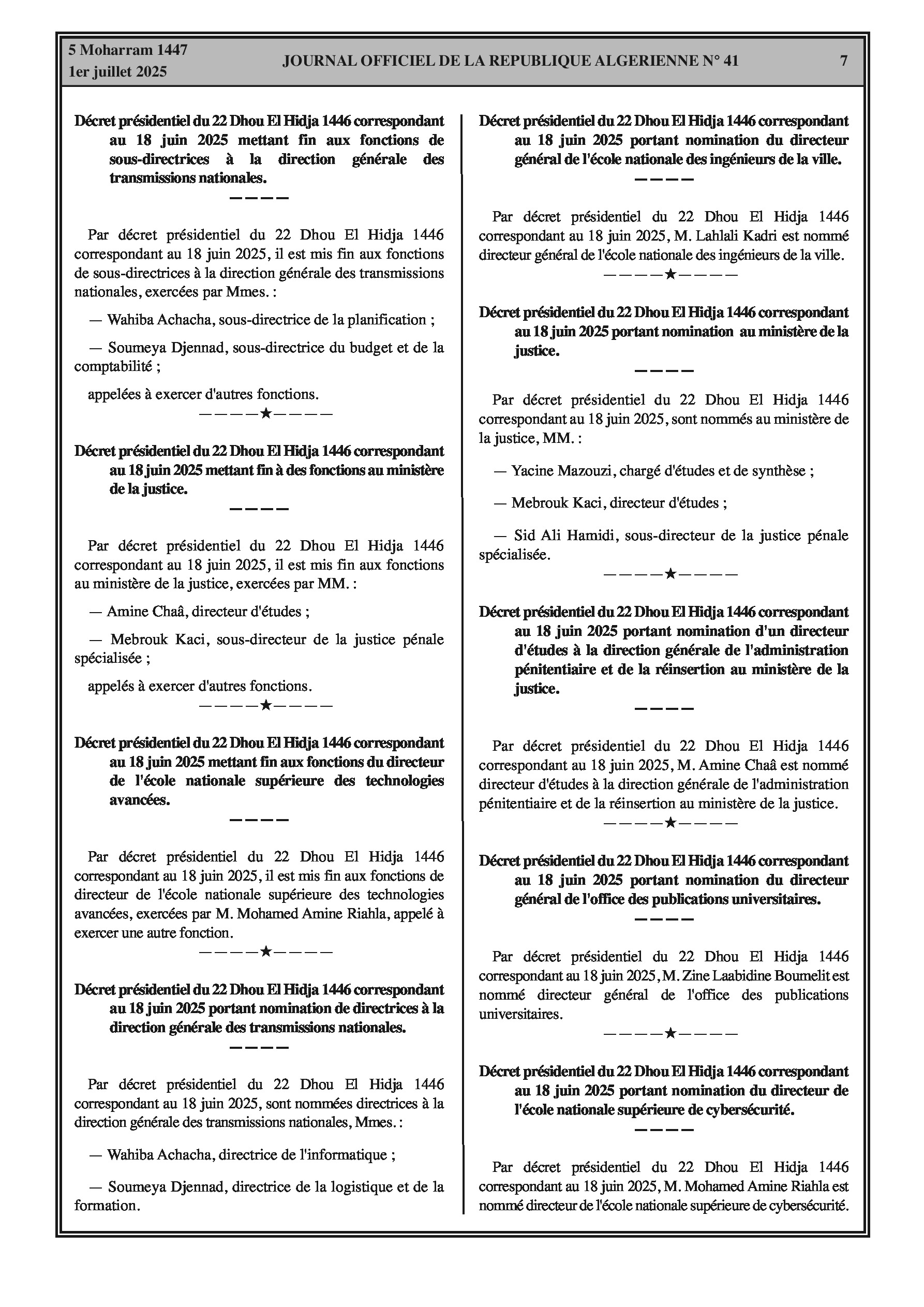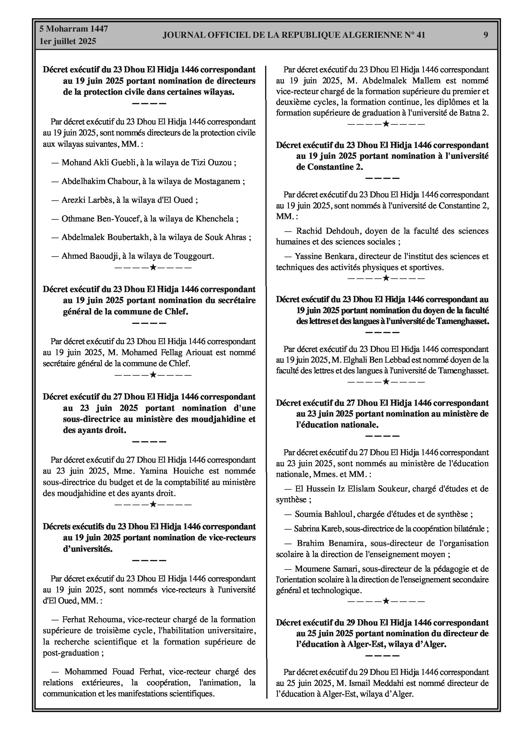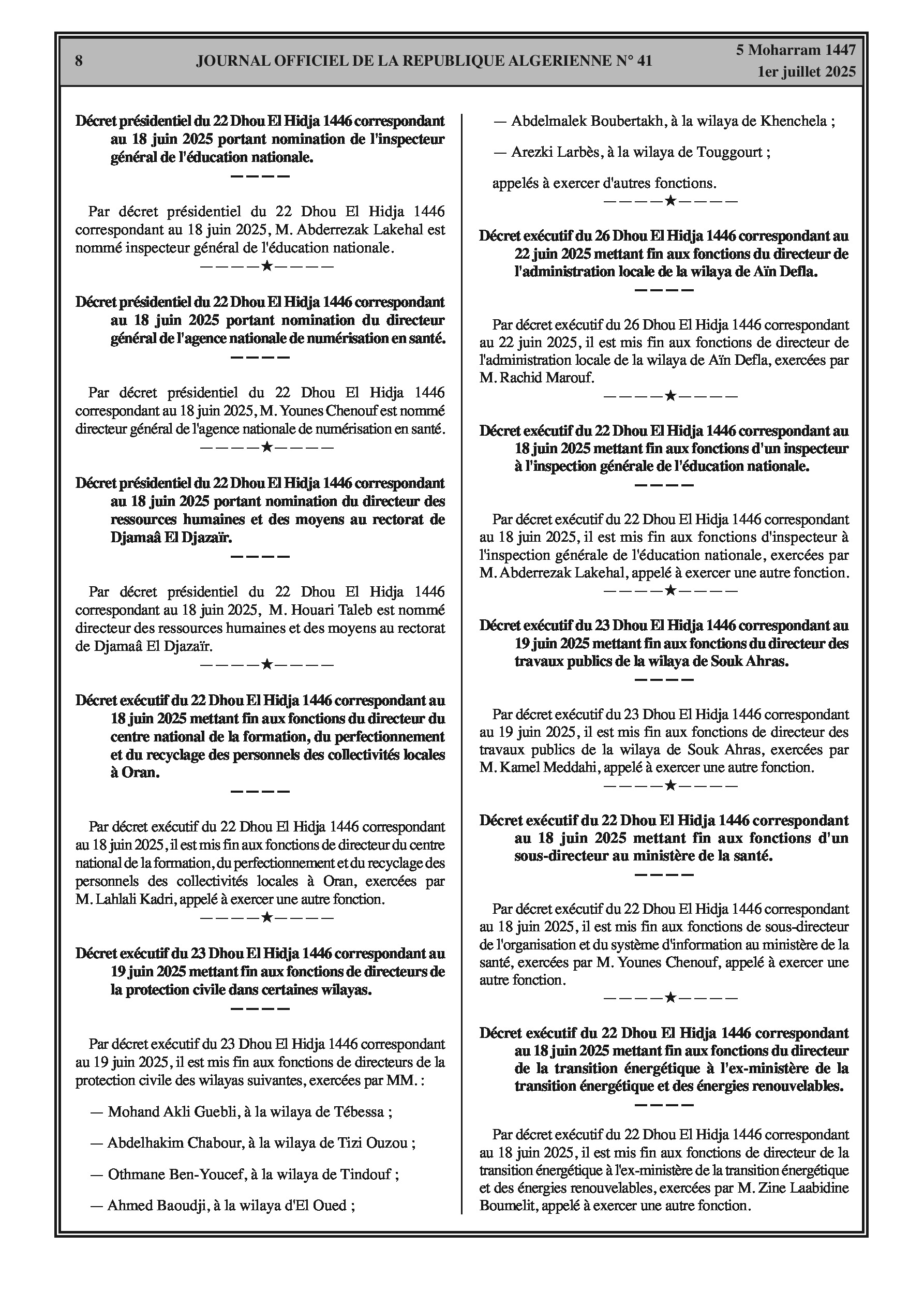 Une série de décrets officialise des changements de direction pour des directeurs, inspecteurs et autres hauts fonctionnaires dans les ministères de l'Intérieur, de la Justice, de l'Éducation, de la Santé et de la Protection civile, ainsi que dans des agences nationales et des universités.