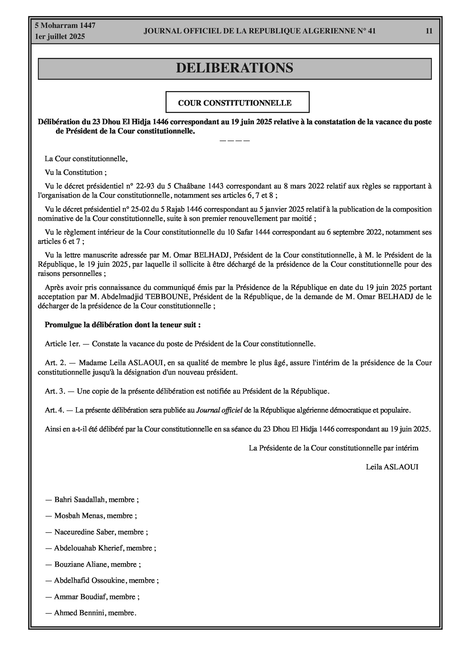 La Cour a officiellement constaté la vacance du poste de Président suite à la démission de M. Omar Belhadj. En sa qualité de membre la plus âgée, Mme Leila Aslaoui assure l'intérim de la présidence jusqu'à la désignation d'un nouveau président.