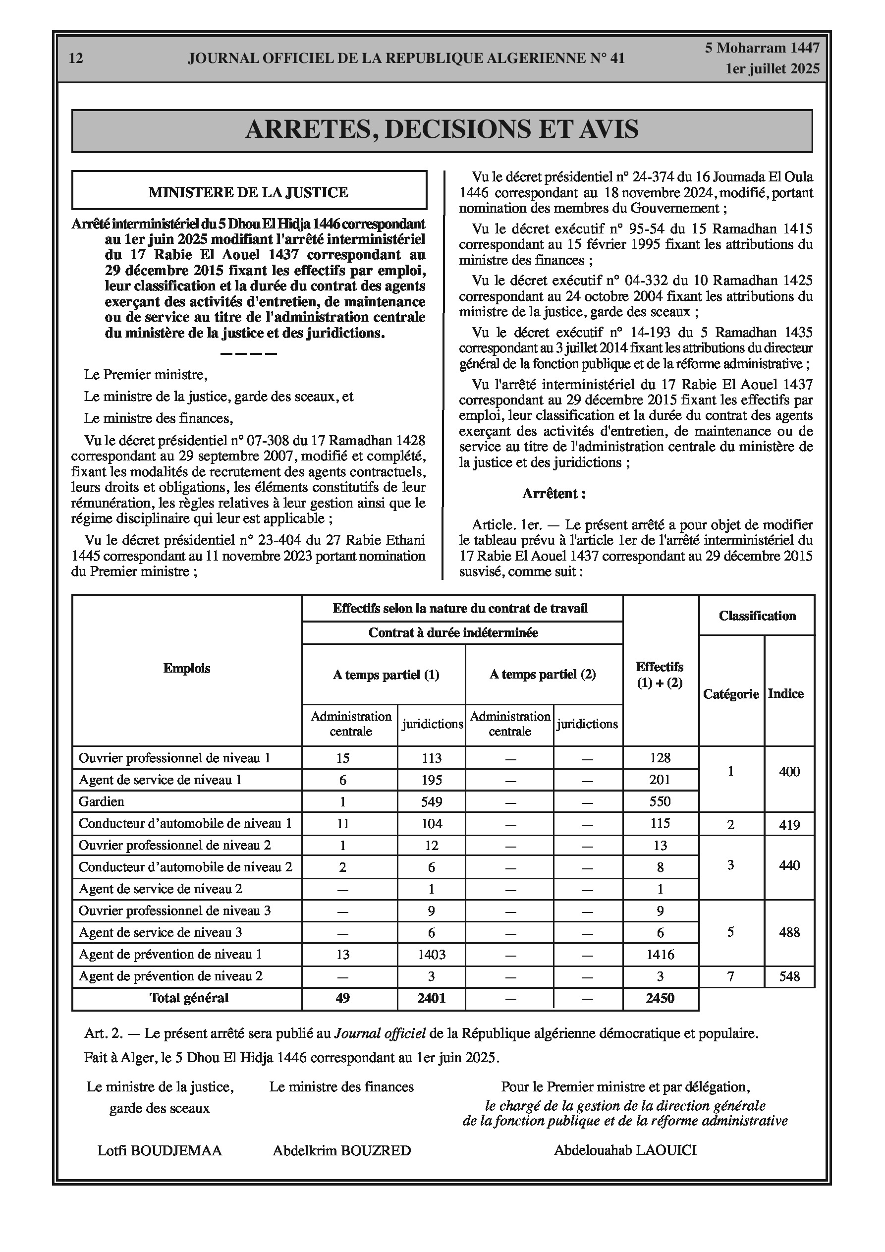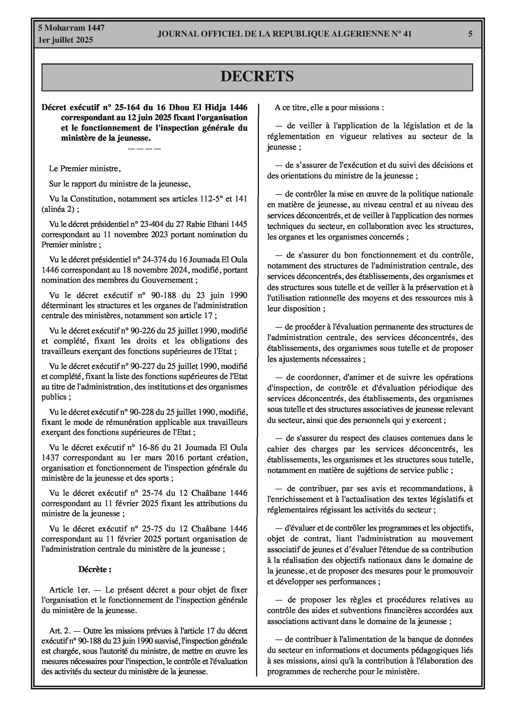 Un décret exécutif définit l'organisation et les missions de l'Inspection générale du ministère de la Jeunesse. Parallèlement, un arrêté interministériel met à jour les effectifs et la classification des agents contractuels de service et de maintenance au ministère de la Justice.
