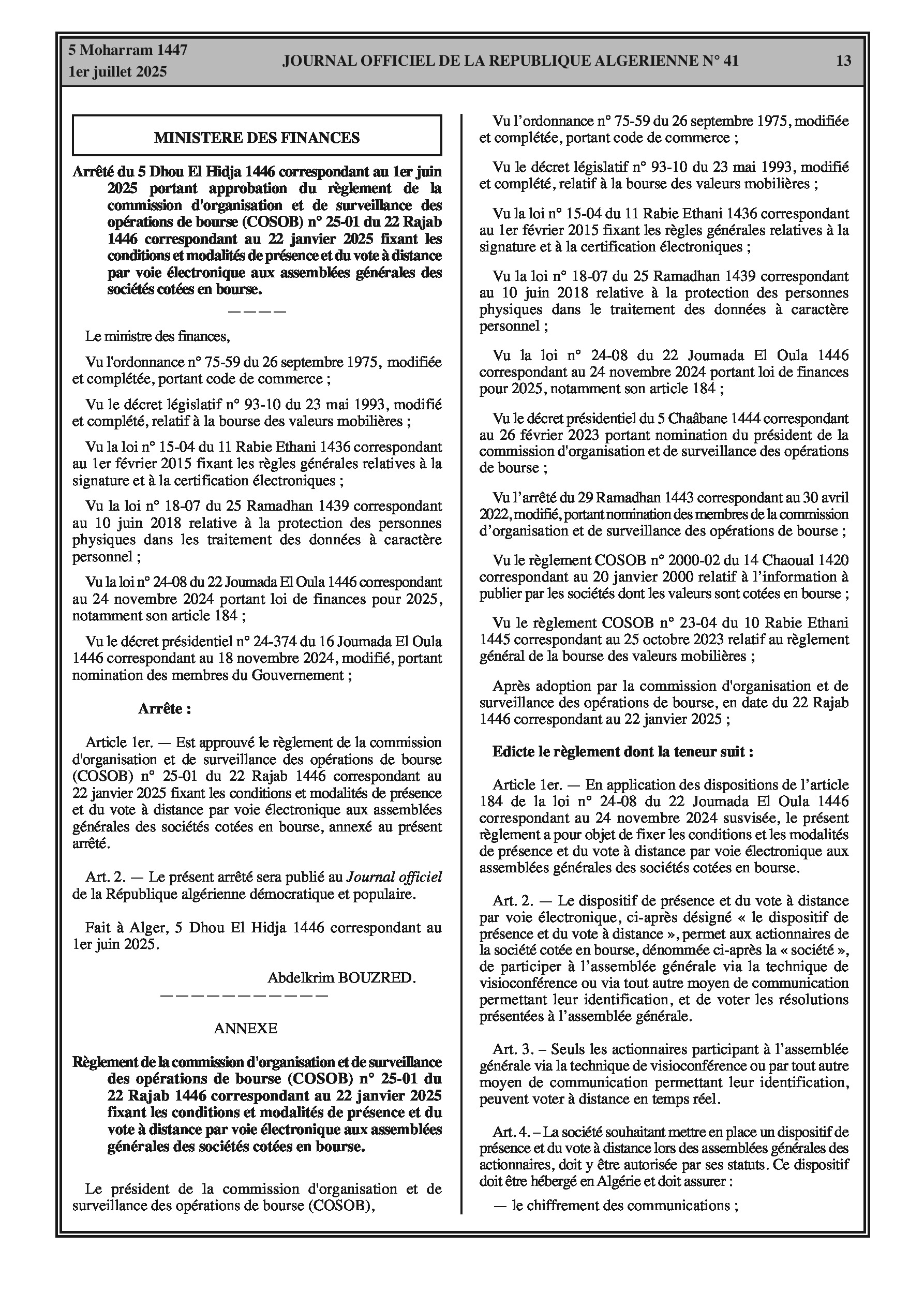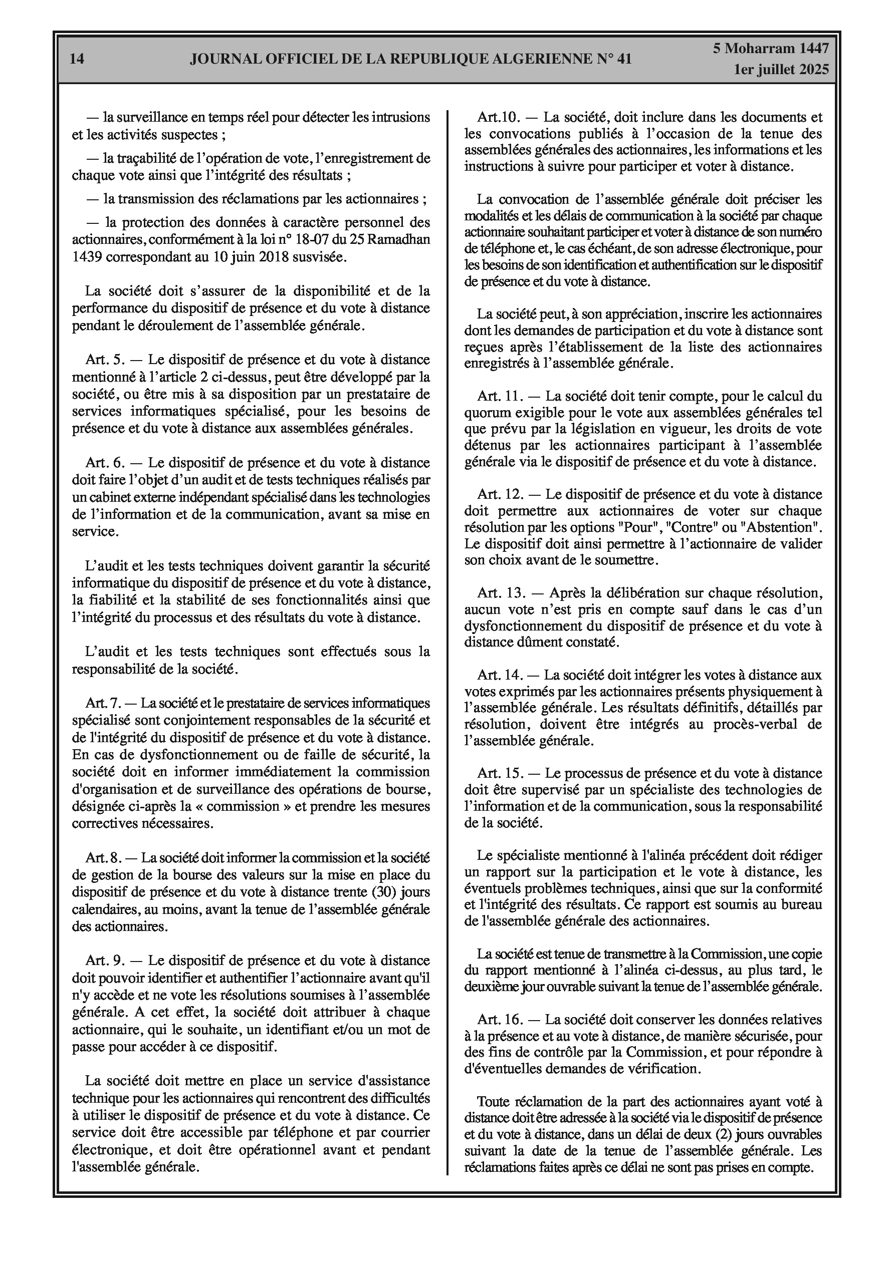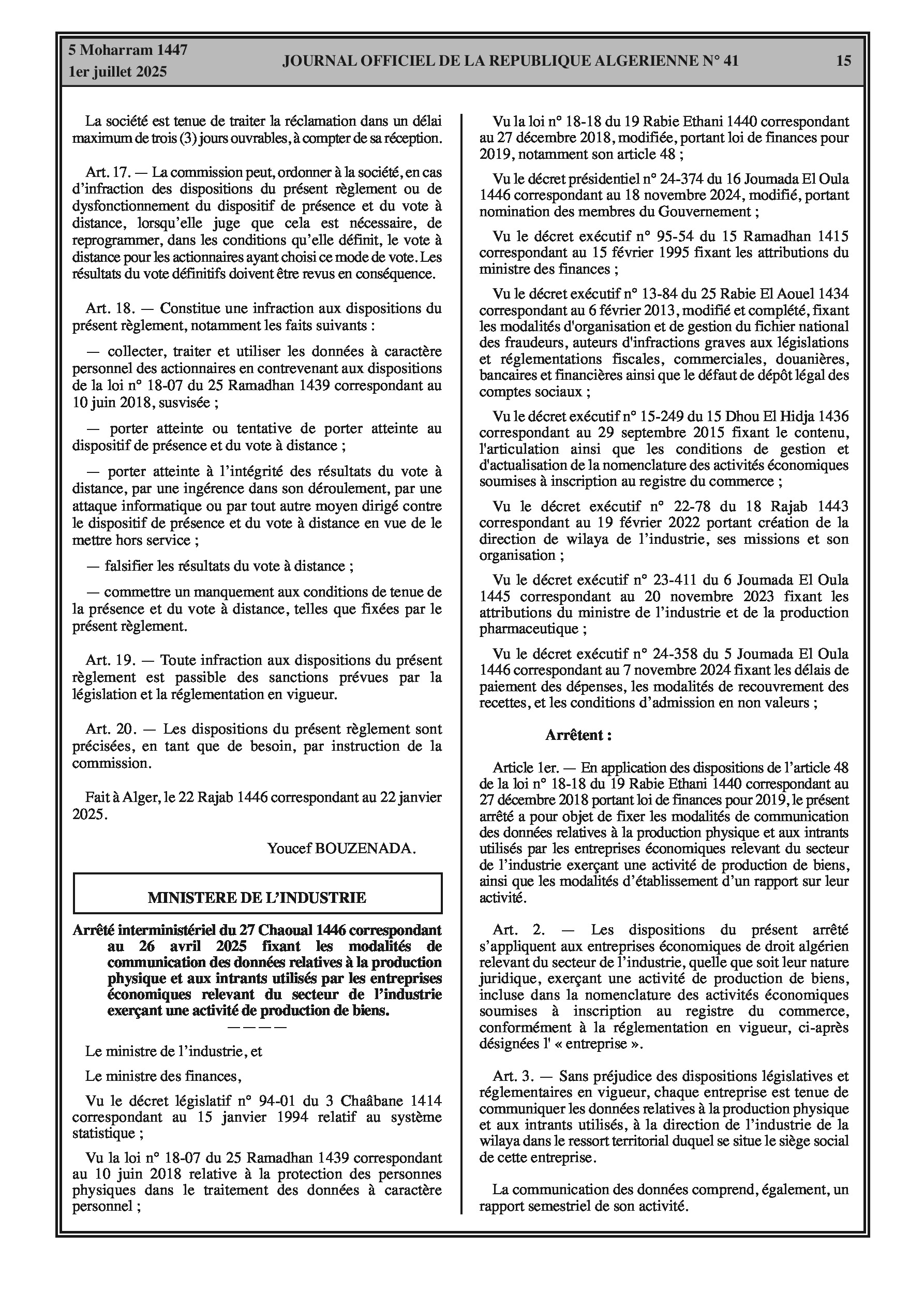 Le secteur financier voit l'approbation du vote électronique pour les assemblées générales des sociétés cotées. Les entreprises industrielles sont désormais tenues de déclarer les données de production et d'intrants via une nouvelle plateforme numérique. La liste des activités éligibles au statut d'auto-entrepreneur est officiellement mise à jour.