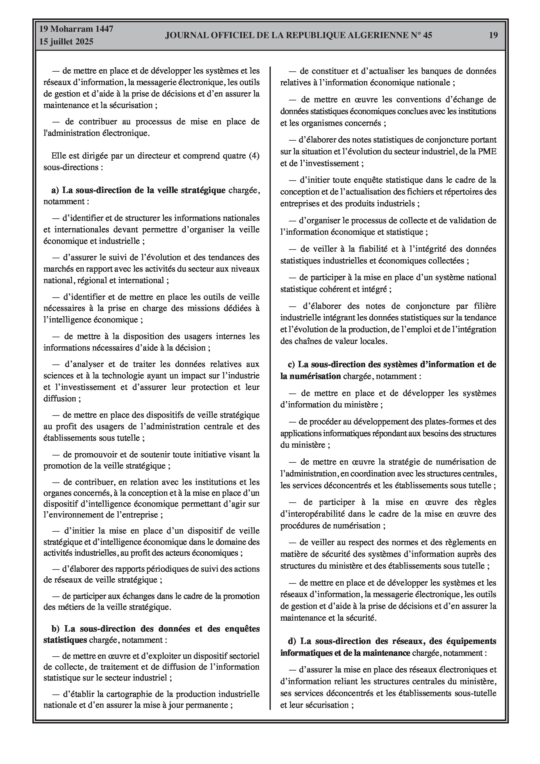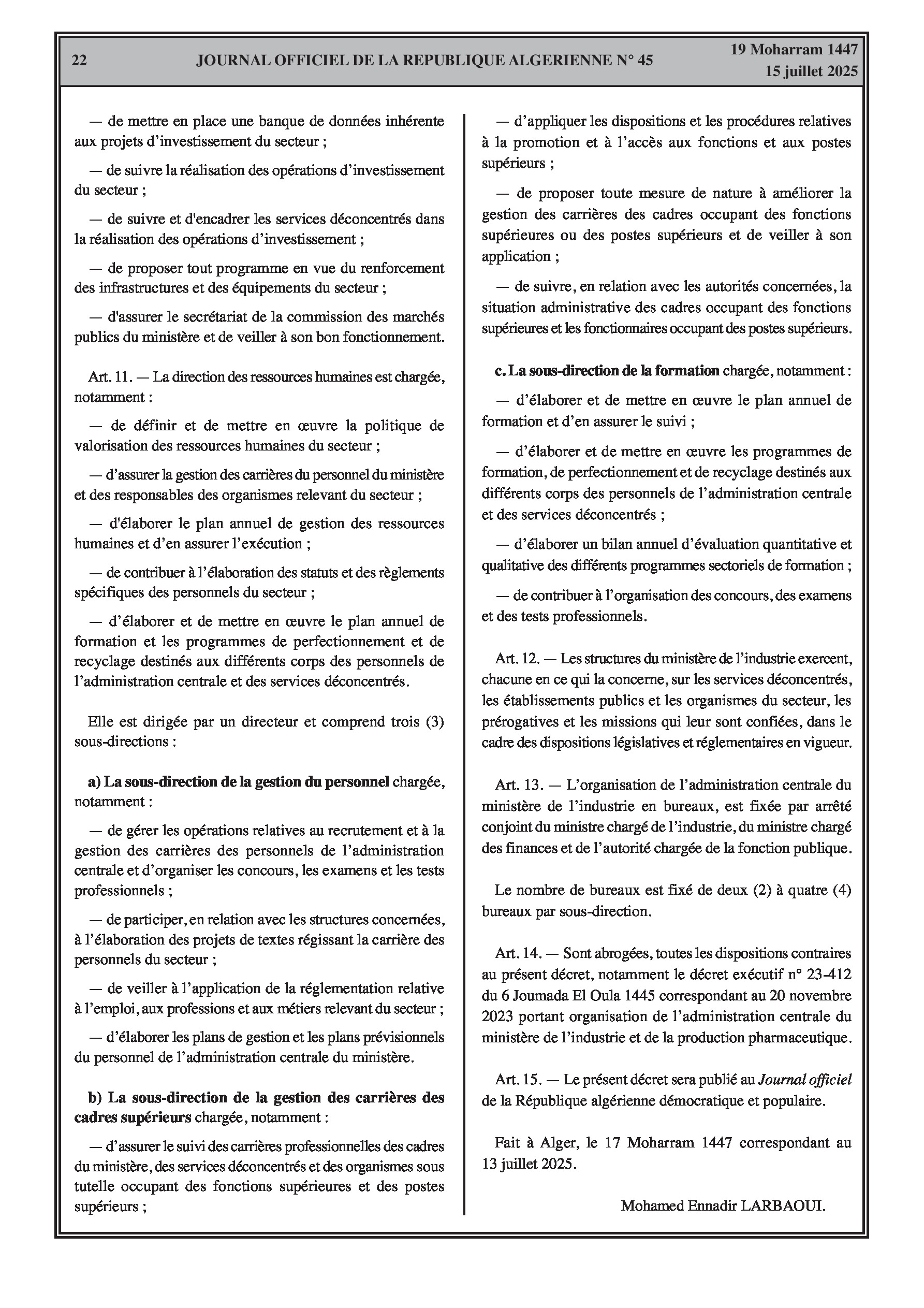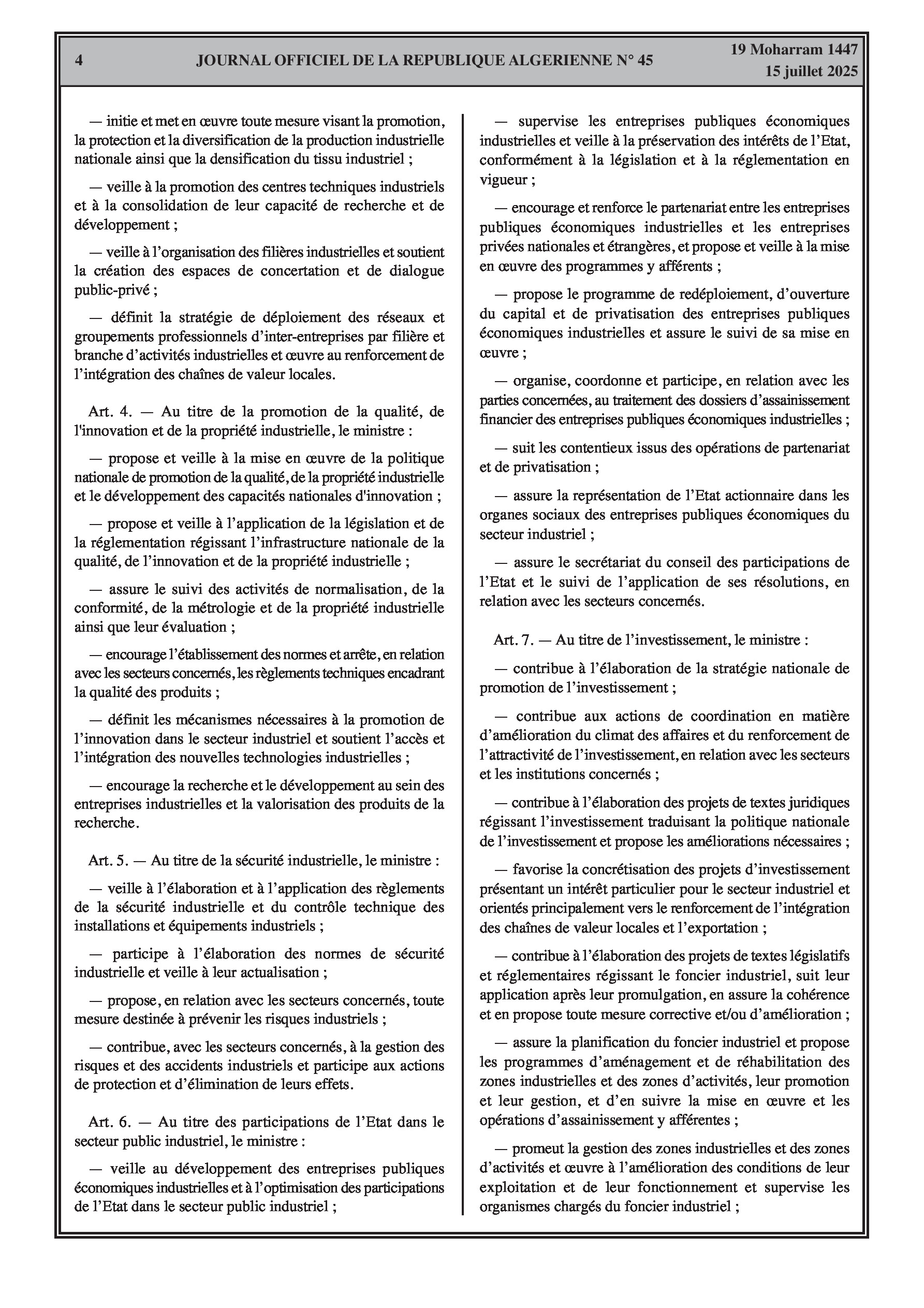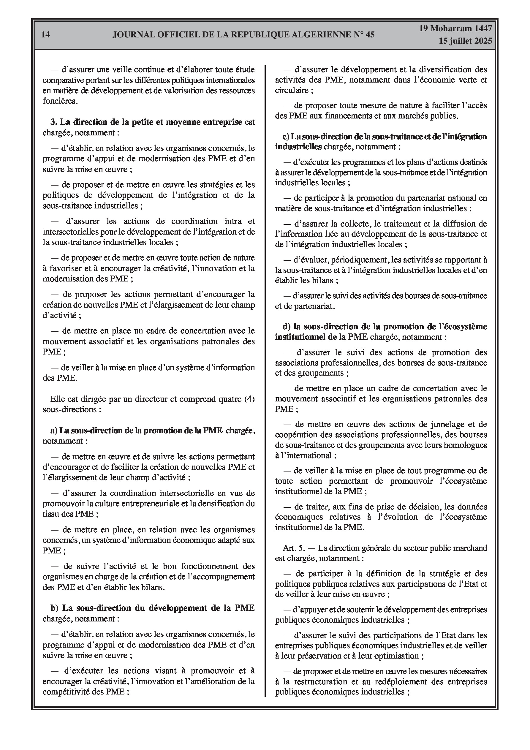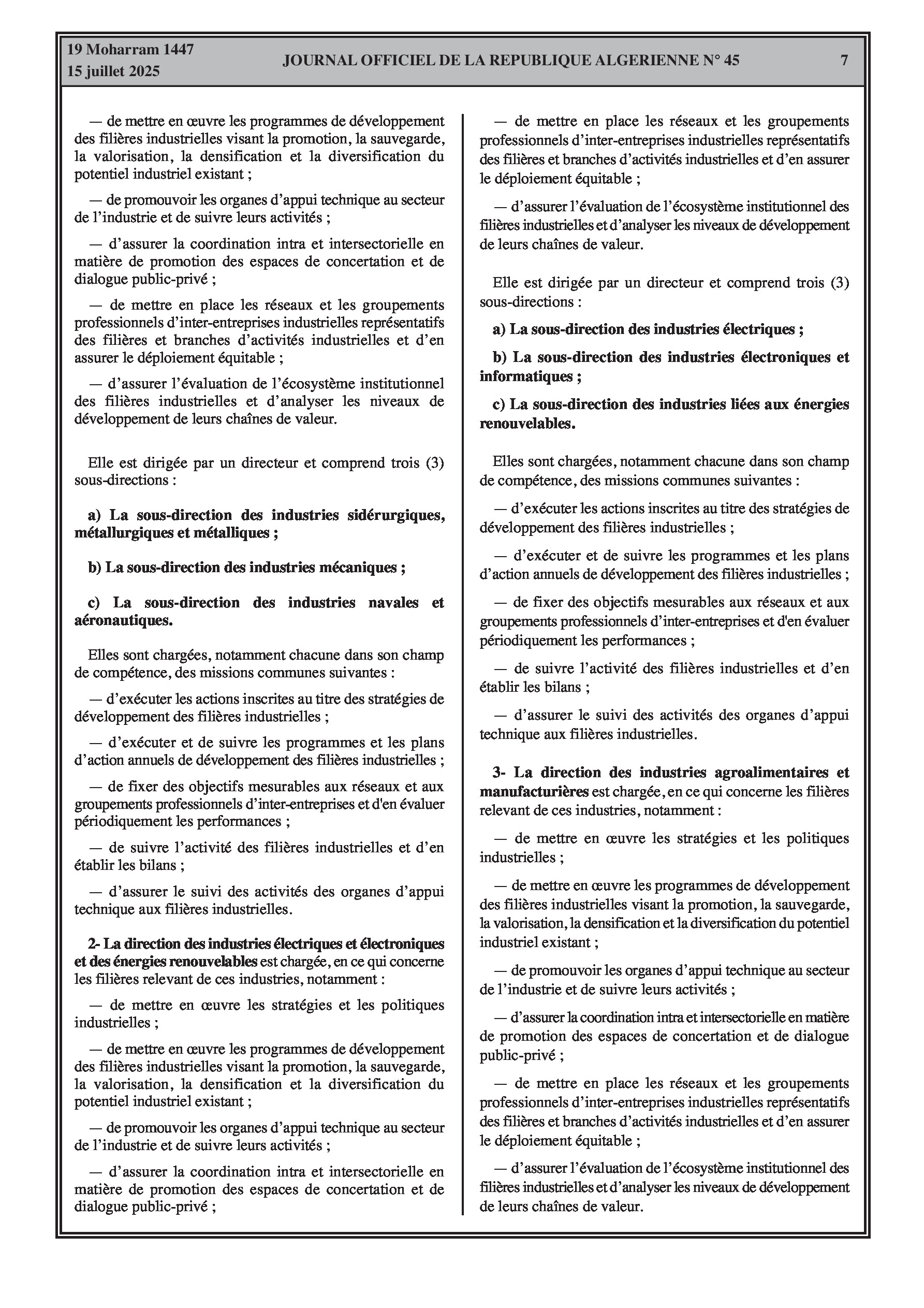Réorganisation complète du ministère de l'Industrie suite à sa séparation du secteur de la production pharmaceutique. Les nouveaux textes définissent les missions et la structure administrative du ministère, en se concentrant sur le développement industriel, l'investissement et les PME.