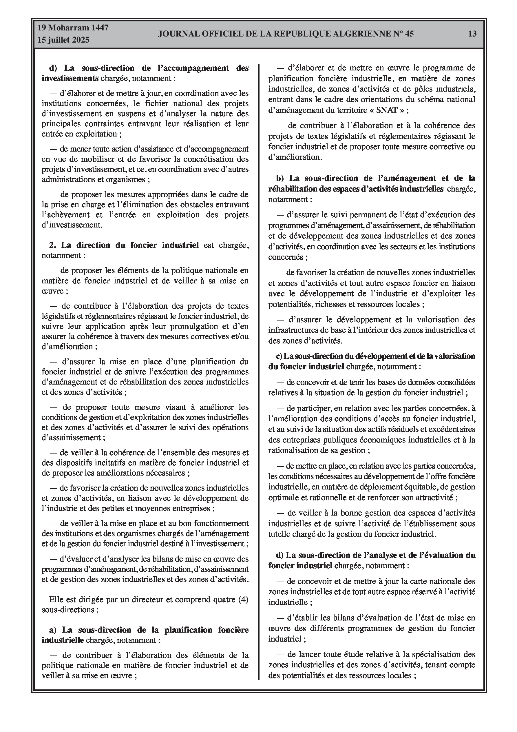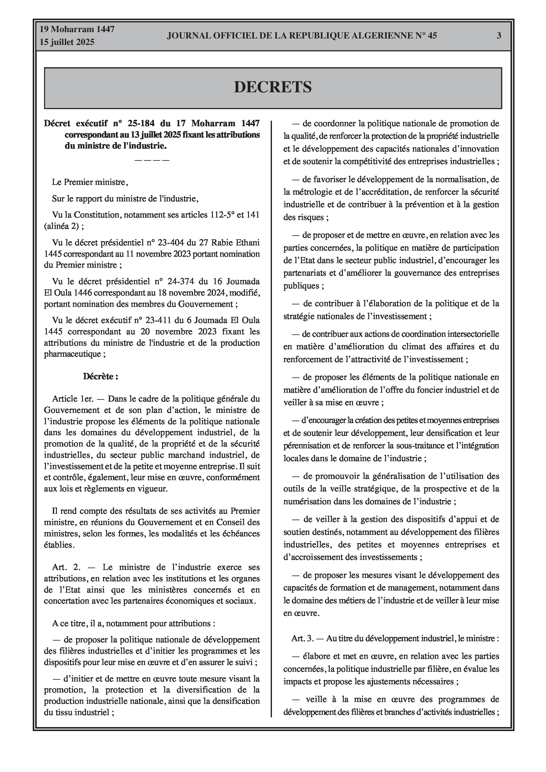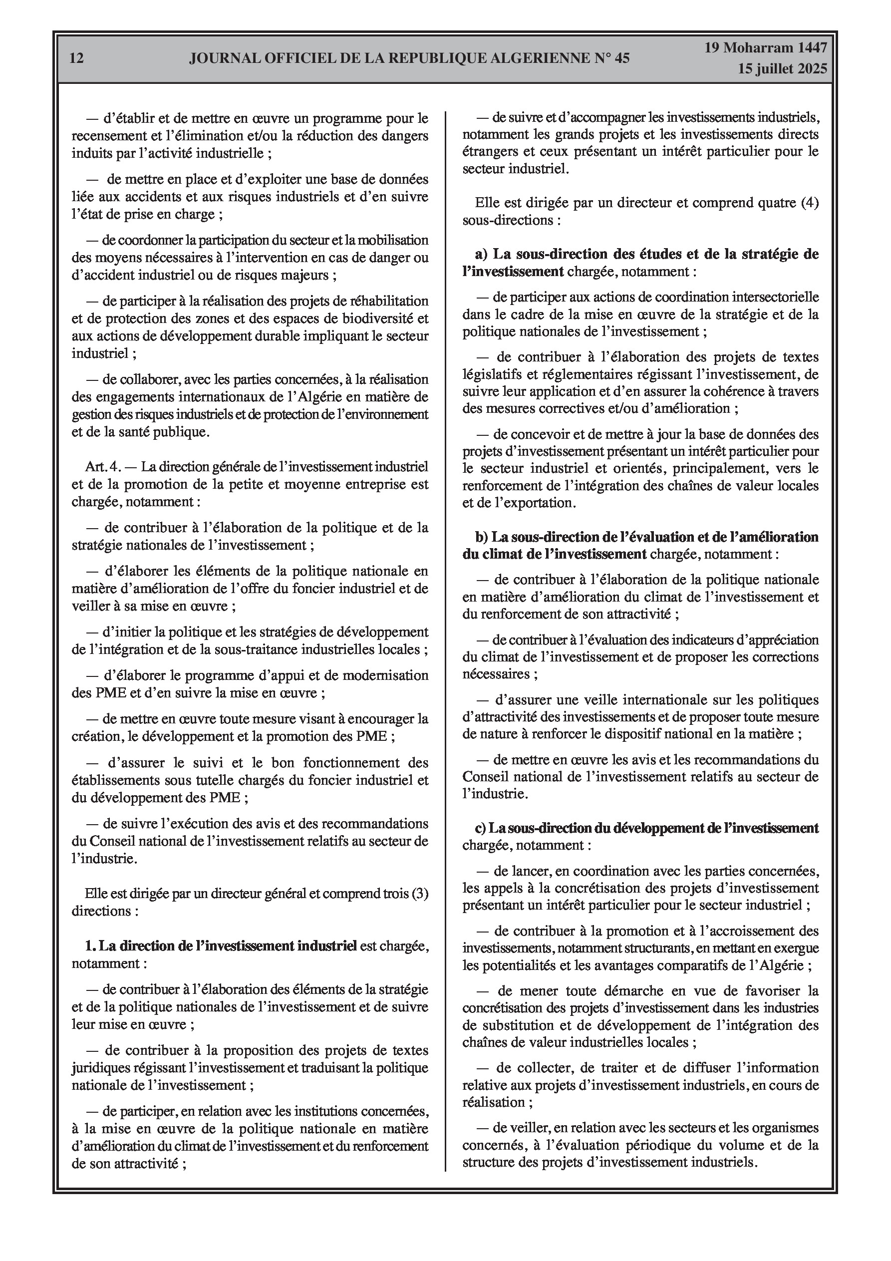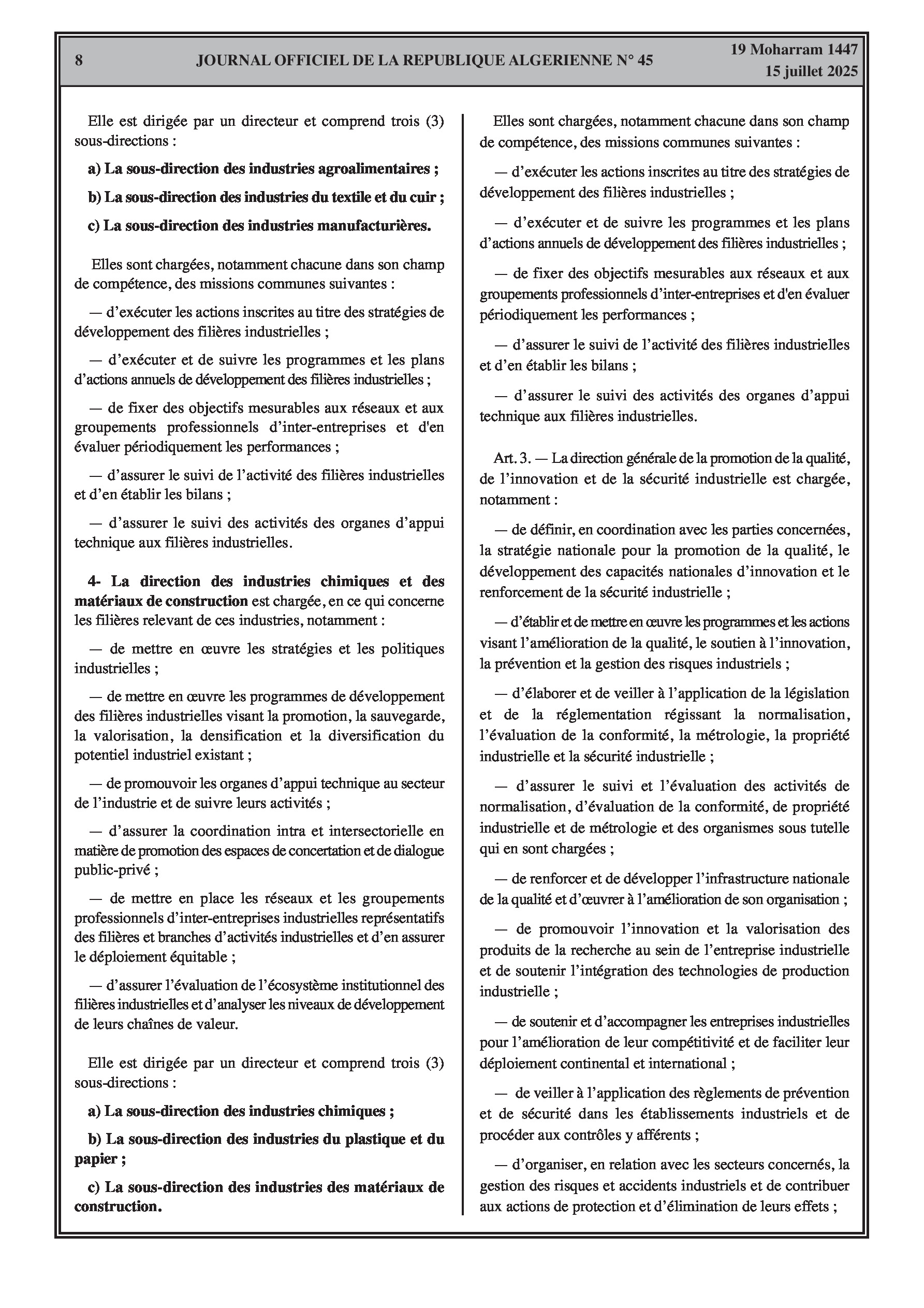 Réorganisation complète du ministère de l'Industrie suite à sa séparation du secteur de la production pharmaceutique. Les nouveaux textes définissent les missions et la structure administrative du ministère, en se concentrant sur le développement industriel, l'investissement et les PME.