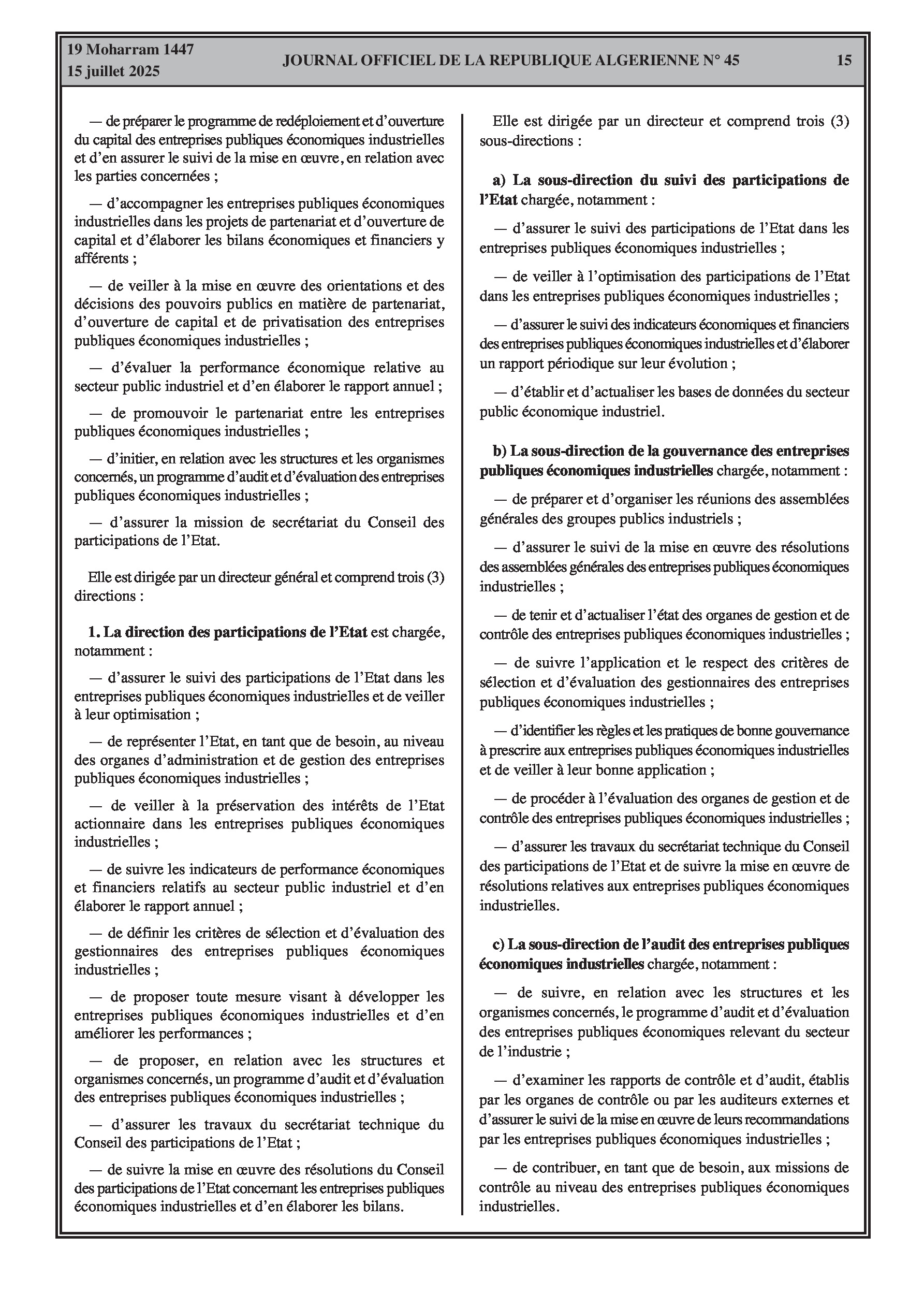 Les décrets exécutifs 25-184, 25-185 et 25-186 définissent les attributions du ministre de l'Industrie, l'organisation de l'administration centrale du ministère, ainsi que l'organisation et le fonctionnement de l'inspection générale. Ces textes abrogent les anciennes dispositions relatives à la structure combinée avec la production pharmaceutique.