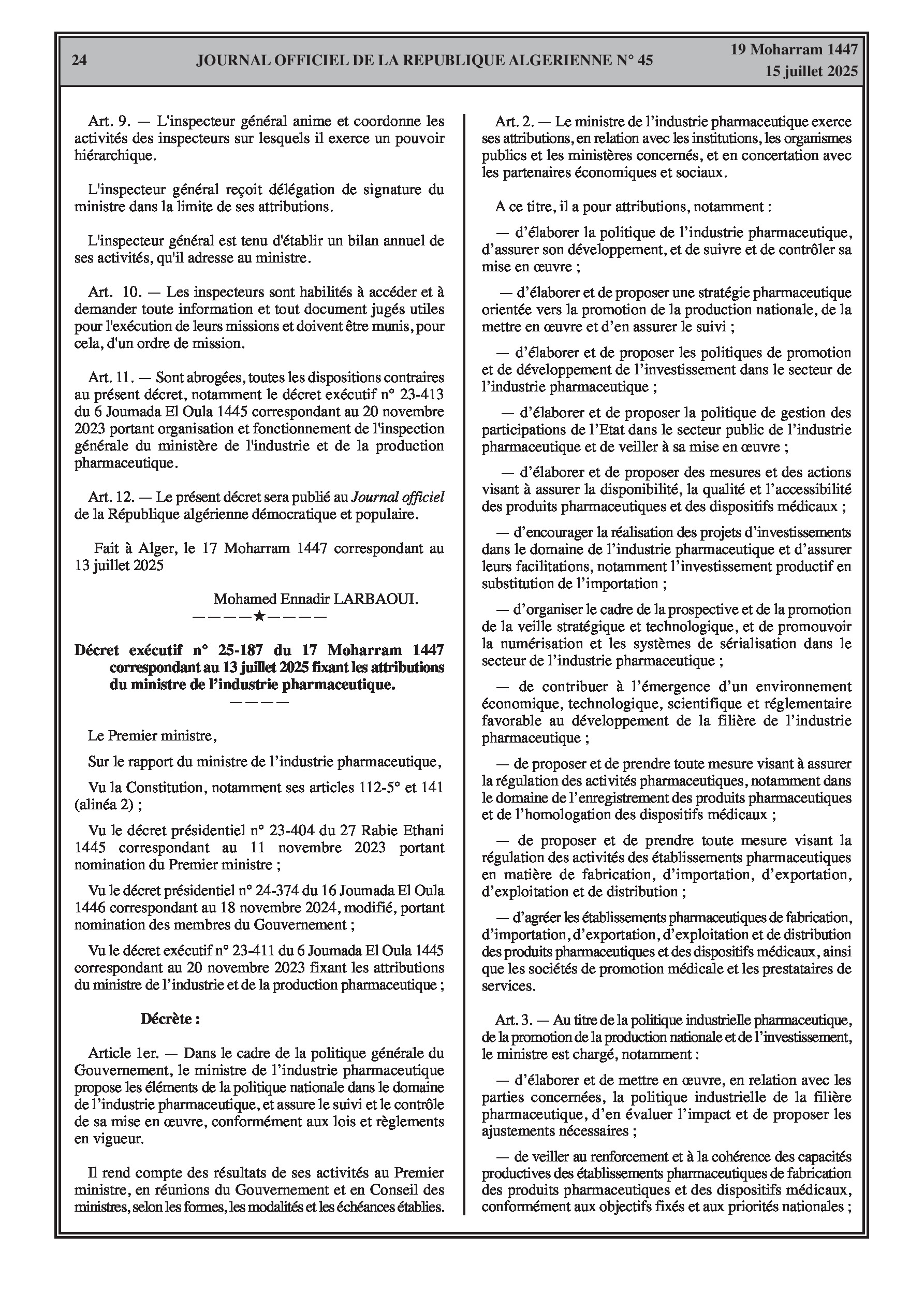 Les décrets exécutifs 25-187, 25-188 et 25-189 fixent les attributions du ministre de l'Industrie Pharmaceutique, l'organisation de l'administration centrale et l'organisation de l'inspection générale du nouveau ministère. Ces mesures visent à garantir la disponibilité et la qualité des médicaments et à promouvoir la production locale.