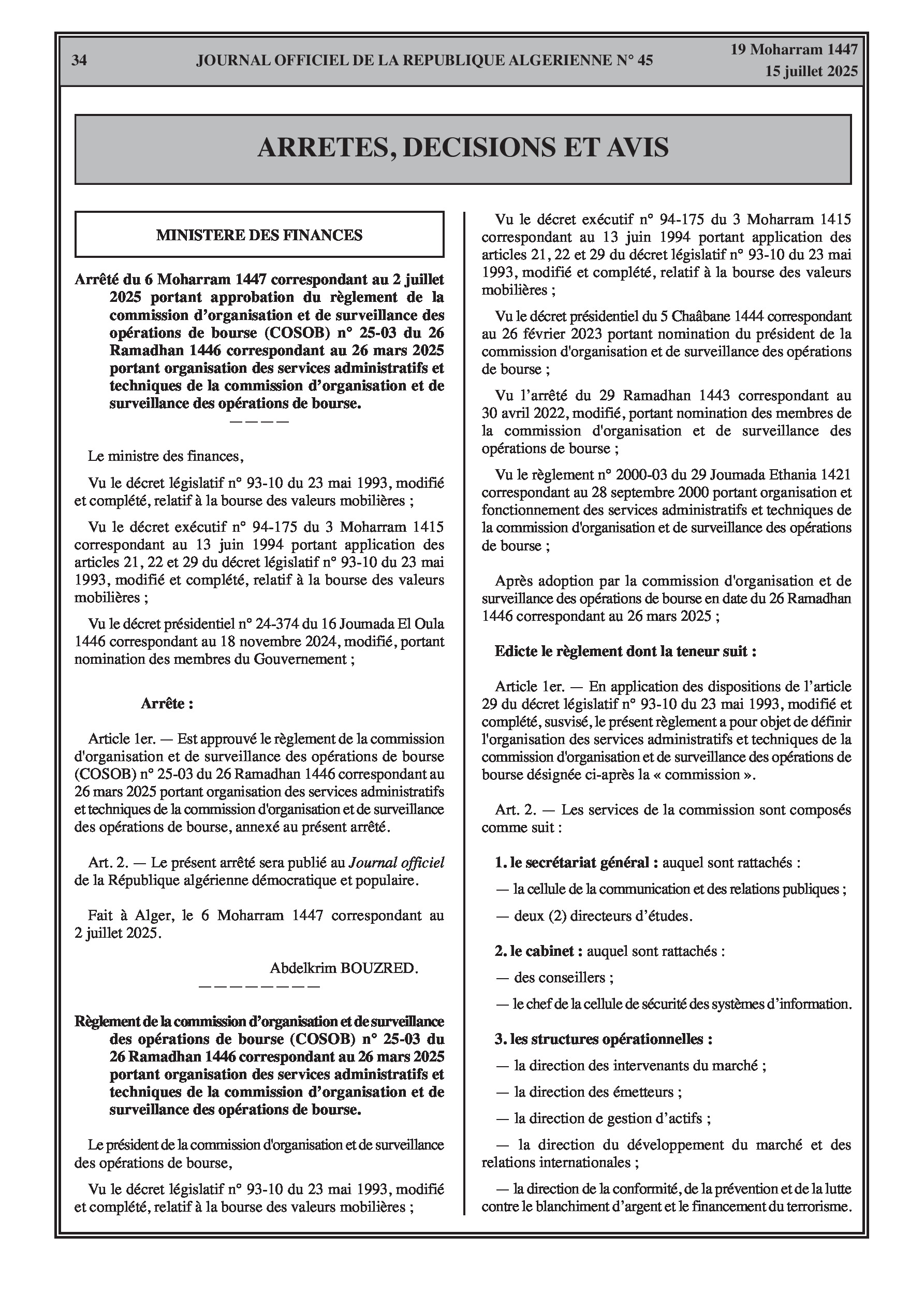 Adoption d'une nouvelle organisation pour la Commission d'Organisation et de Surveillance des Opérations de Bourse (COSOB) afin de moderniser ses méthodes de travail et de renforcer son efficacité dans la surveillance du marché des valeurs mobilières.