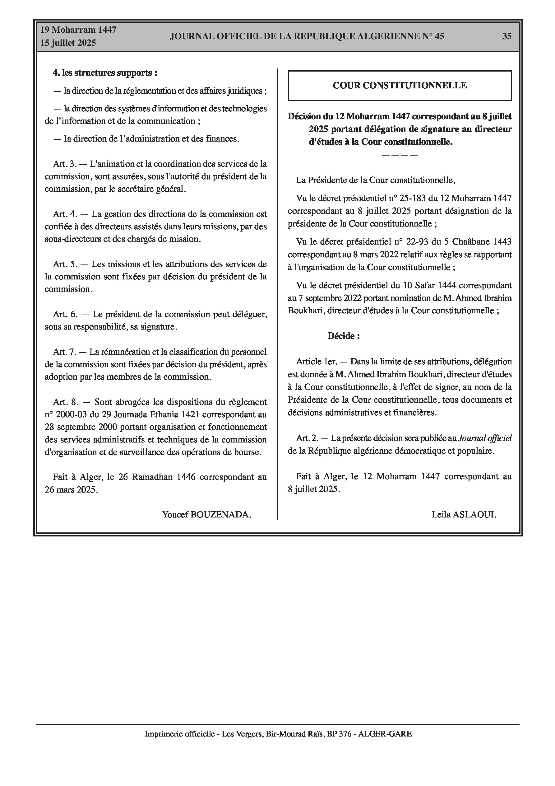 Une décision administrative interne concernant la délégation de signature au sein de la Cour constitutionnelle.