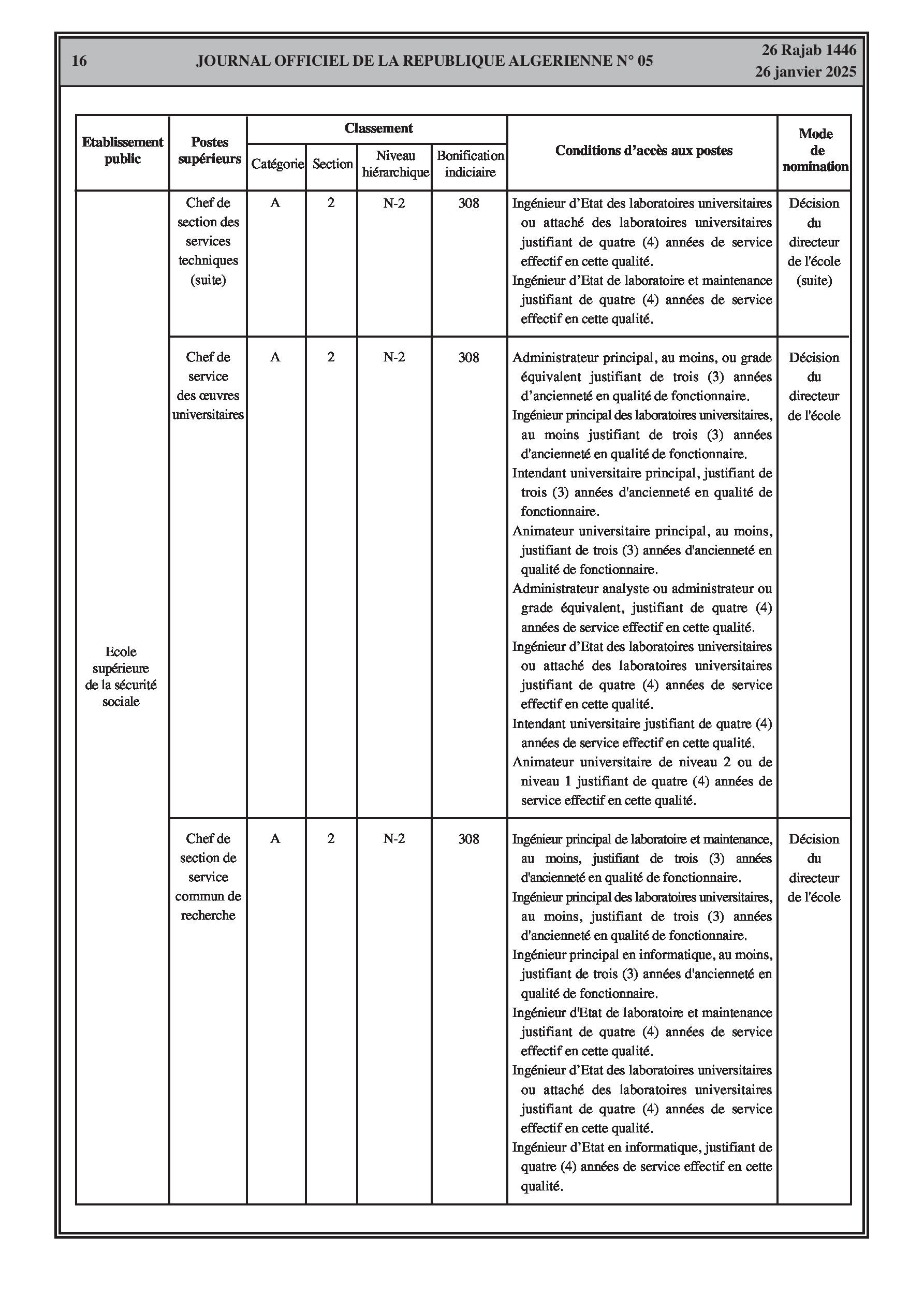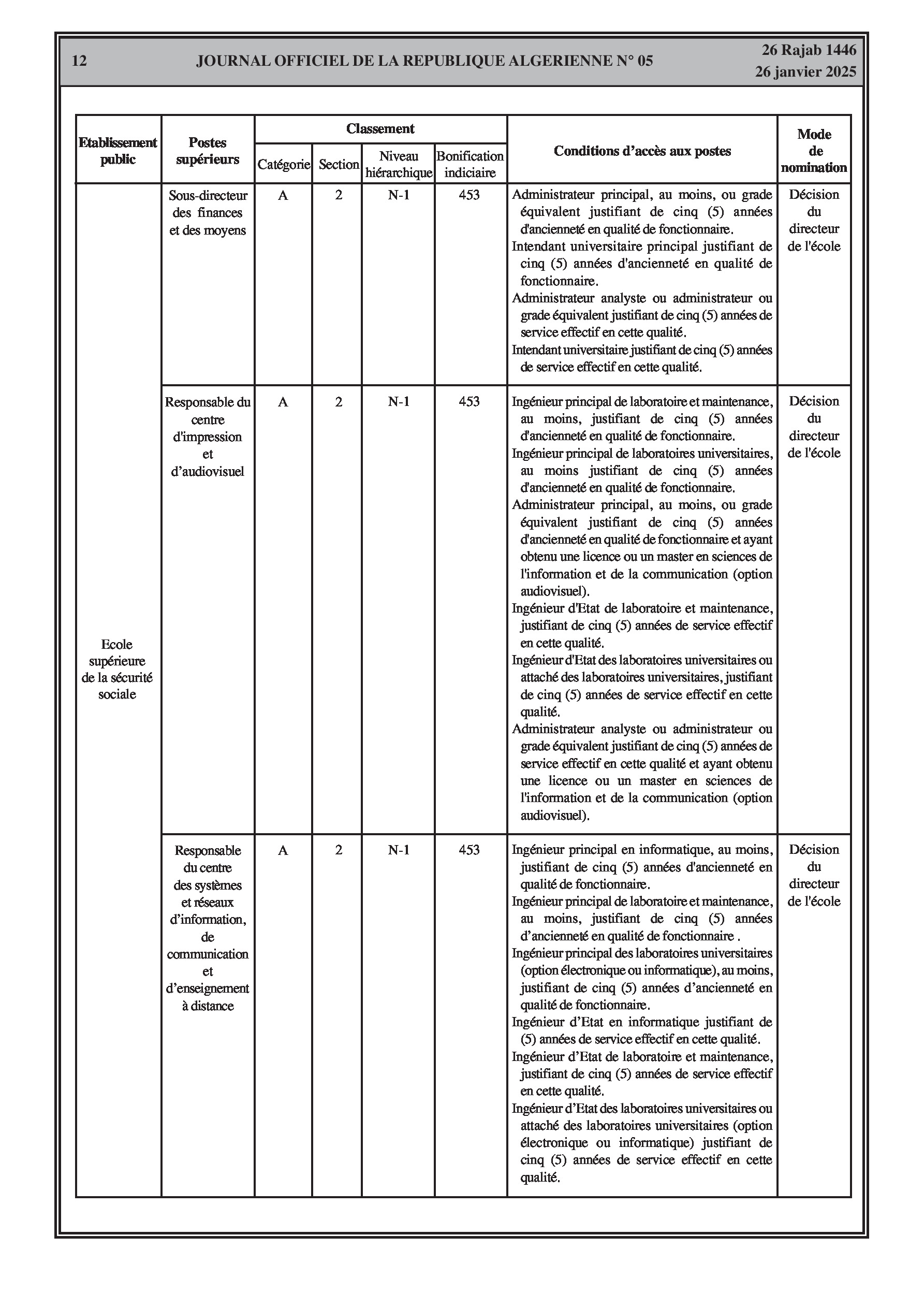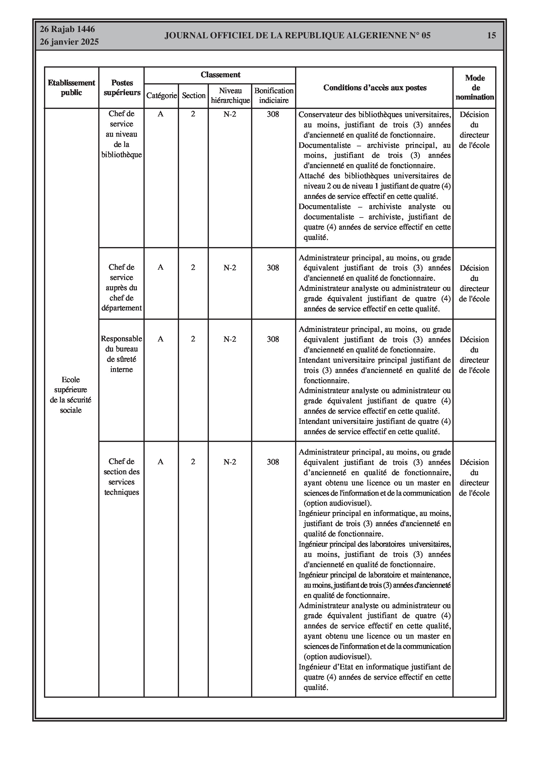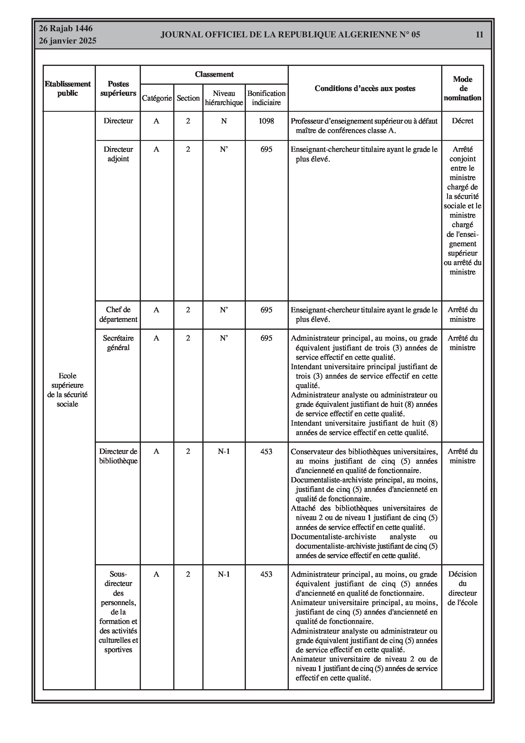 Un arrêté interministériel du 9 décembre 2024 porte création de la commission sectorielle pour l'exercice de la tutelle pédagogique sur l'école supérieure de la sécurité sociale et définit sa composition, son fonctionnement et ses réunions. Un autre arrêté du 23 décembre 2024 fixe la classification de l'école (catégorie A, section 2) et les conditions d'accès à ses différents postes supérieurs (Directeur, Directeur adjoint, Chef de département, Secrétaire général, Directeur de bibliothèque, Chefs de service, etc.) en précisant les bonifications indiciaires associées et les conditions d'ancienneté et de diplômes requis. Ces arrêtés abrogent les dispositions antérieures y afférentes.