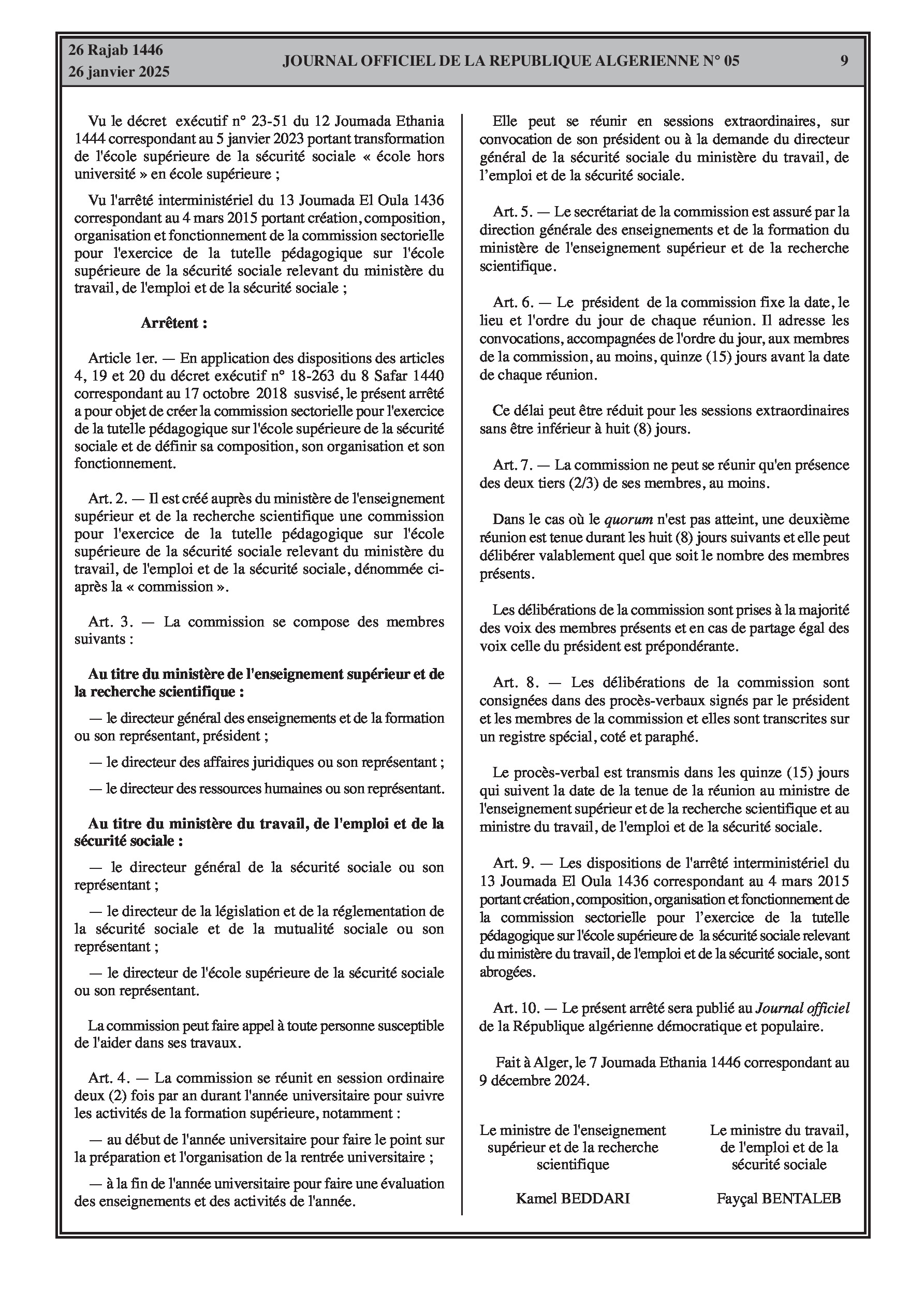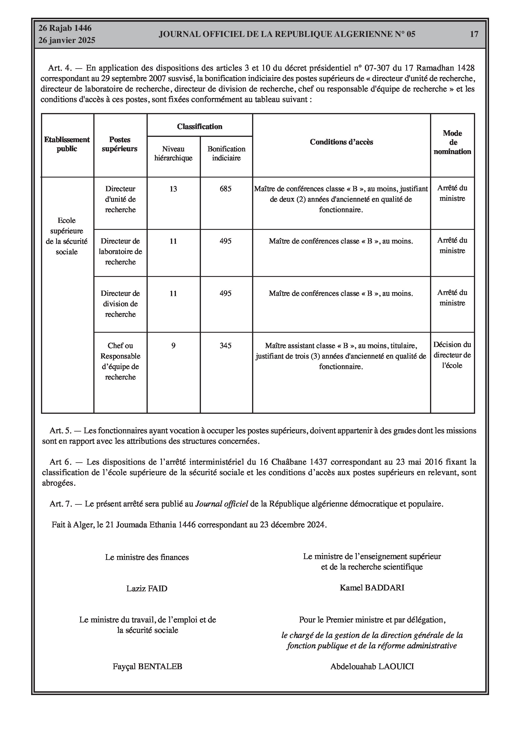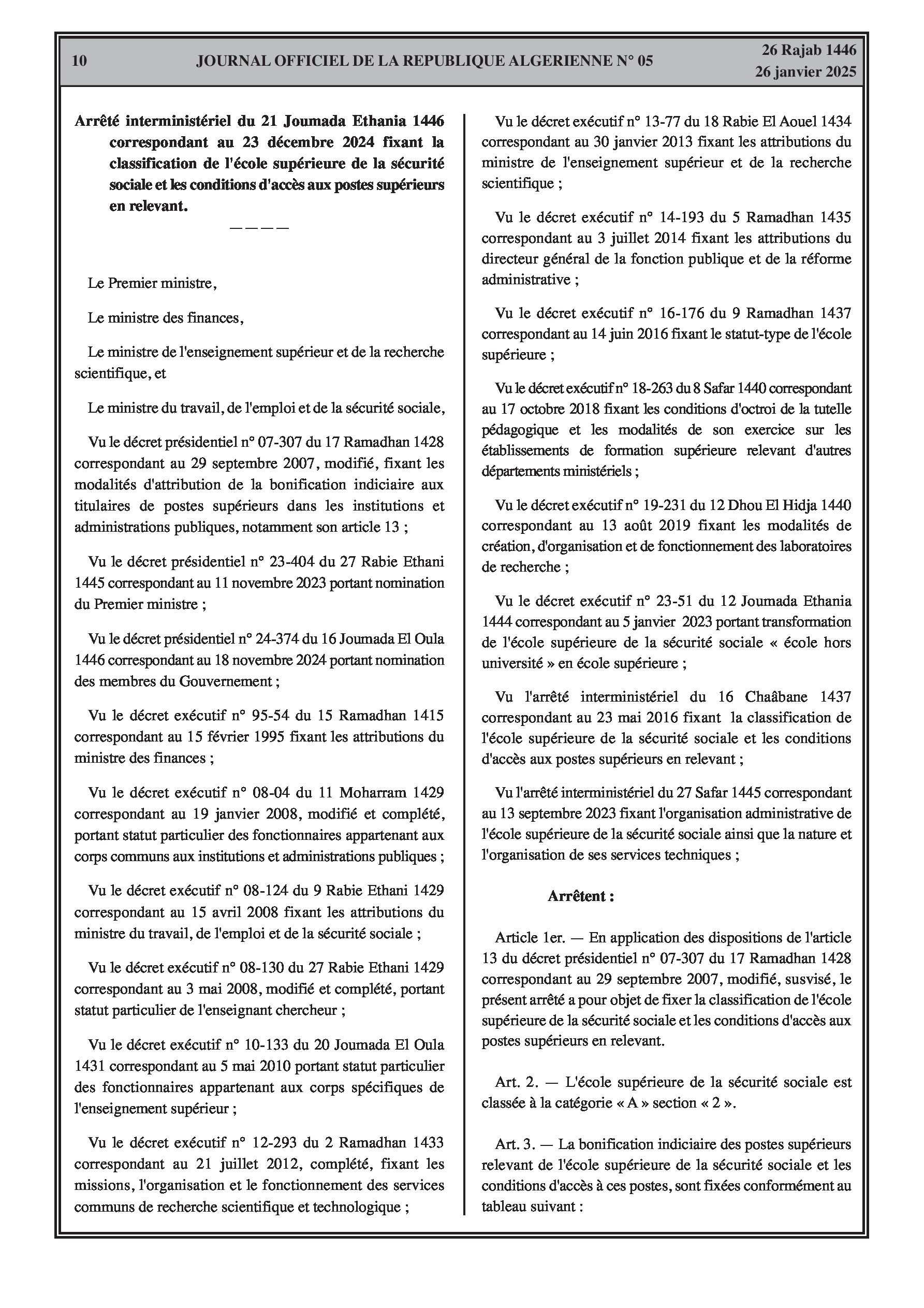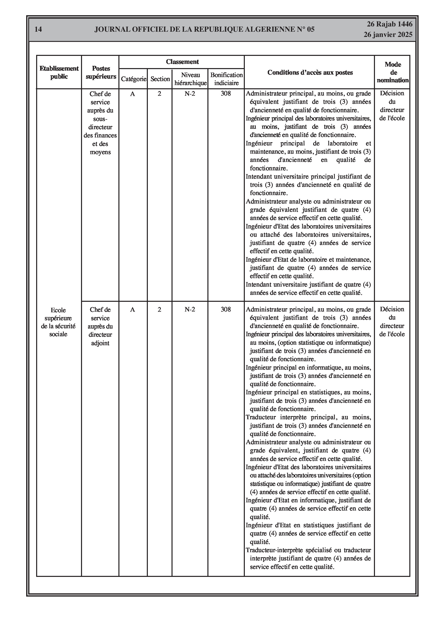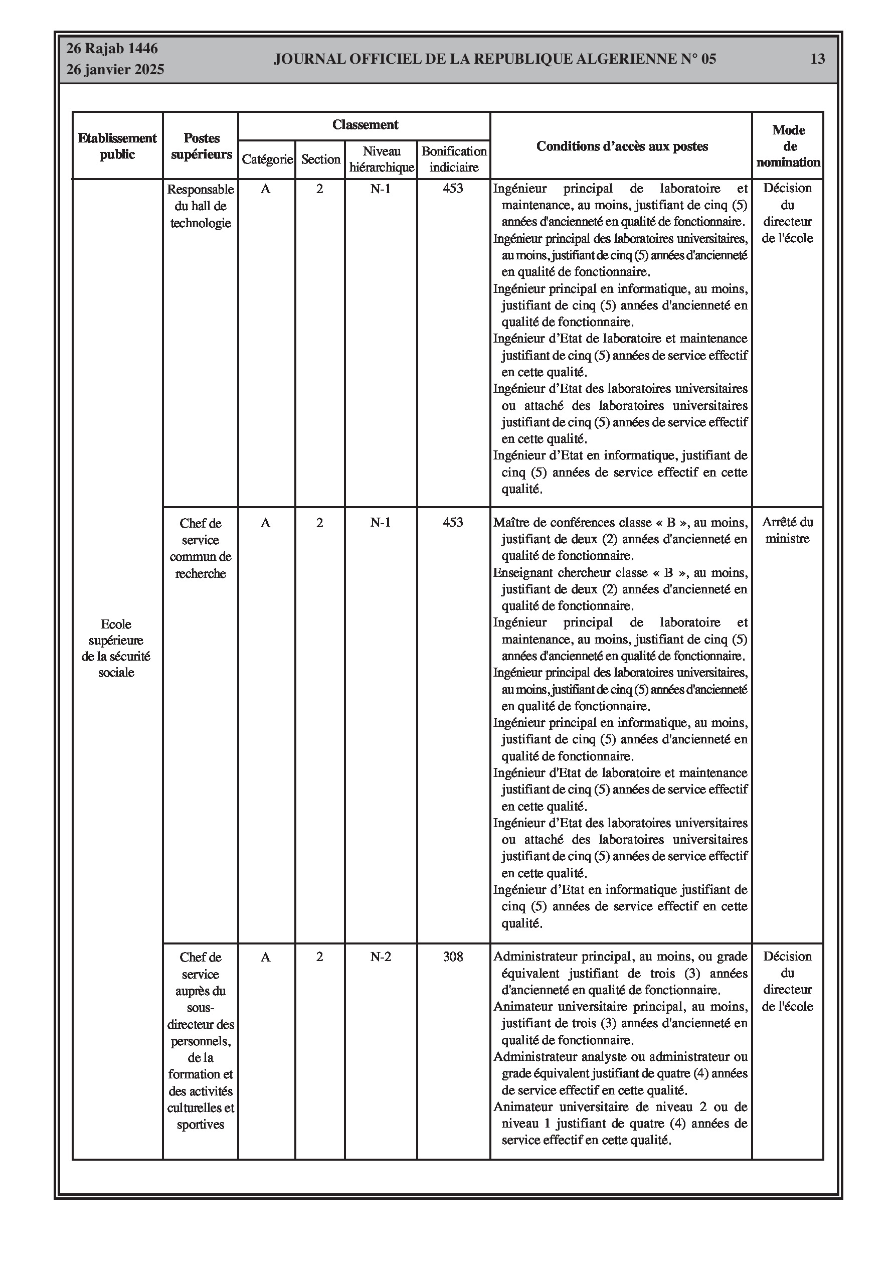 Un arrêté interministériel du 9 décembre 2024 porte création de la commission sectorielle pour l'exercice de la tutelle pédagogique sur l'école supérieure de la sécurité sociale et définit sa composition, son fonctionnement et ses réunions. Un autre arrêté du 23 décembre 2024 fixe la classification de l'école (catégorie A, section 2) et les conditions d'accès à ses différents postes supérieurs (Directeur, Directeur adjoint, Chef de département, Secrétaire général, Directeur de bibliothèque, Chefs de service, etc.) en précisant les bonifications indiciaires associées et les conditions d'ancienneté et de diplômes requis. Ces arrêtés abrogent les dispositions antérieures y afférentes.