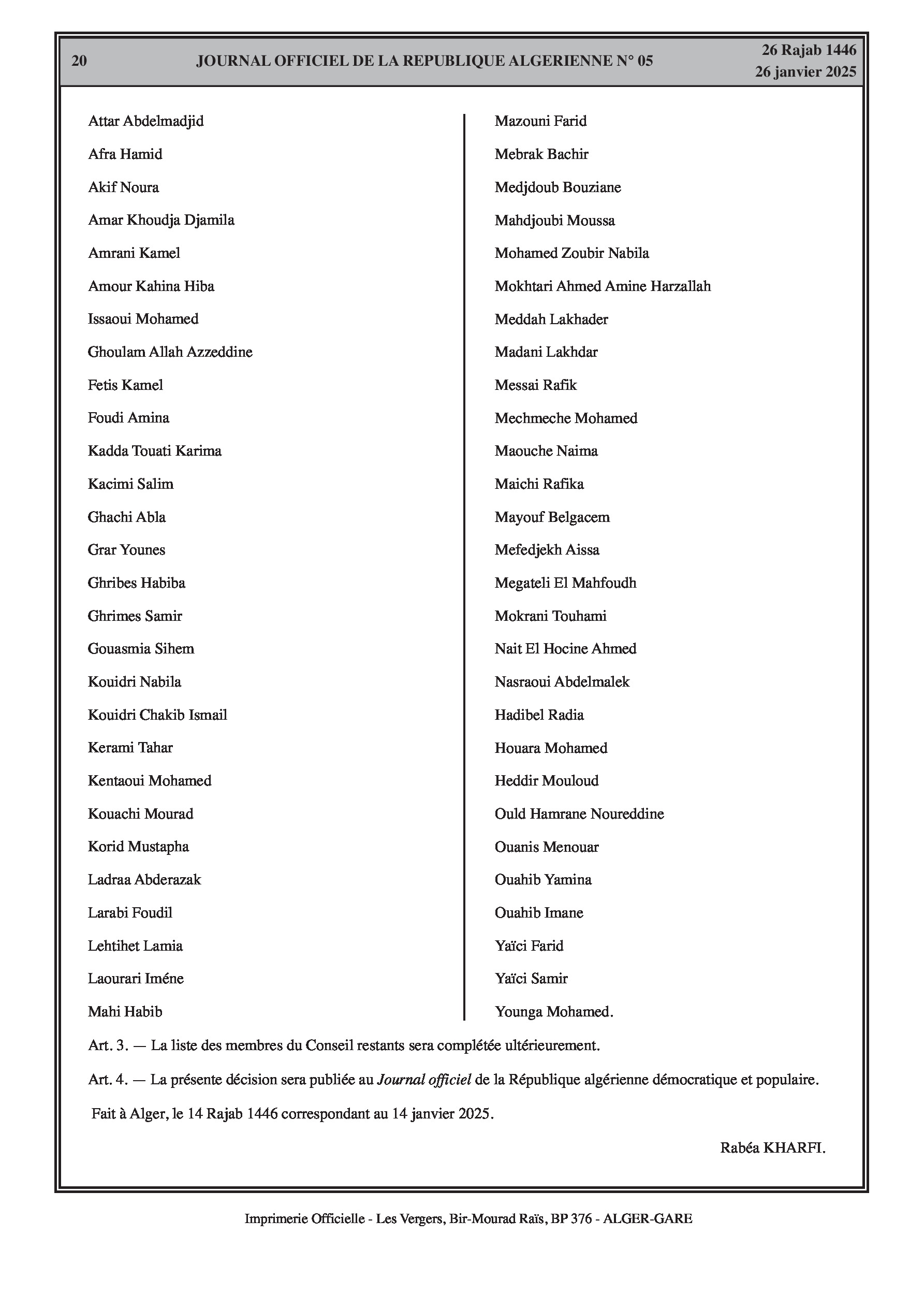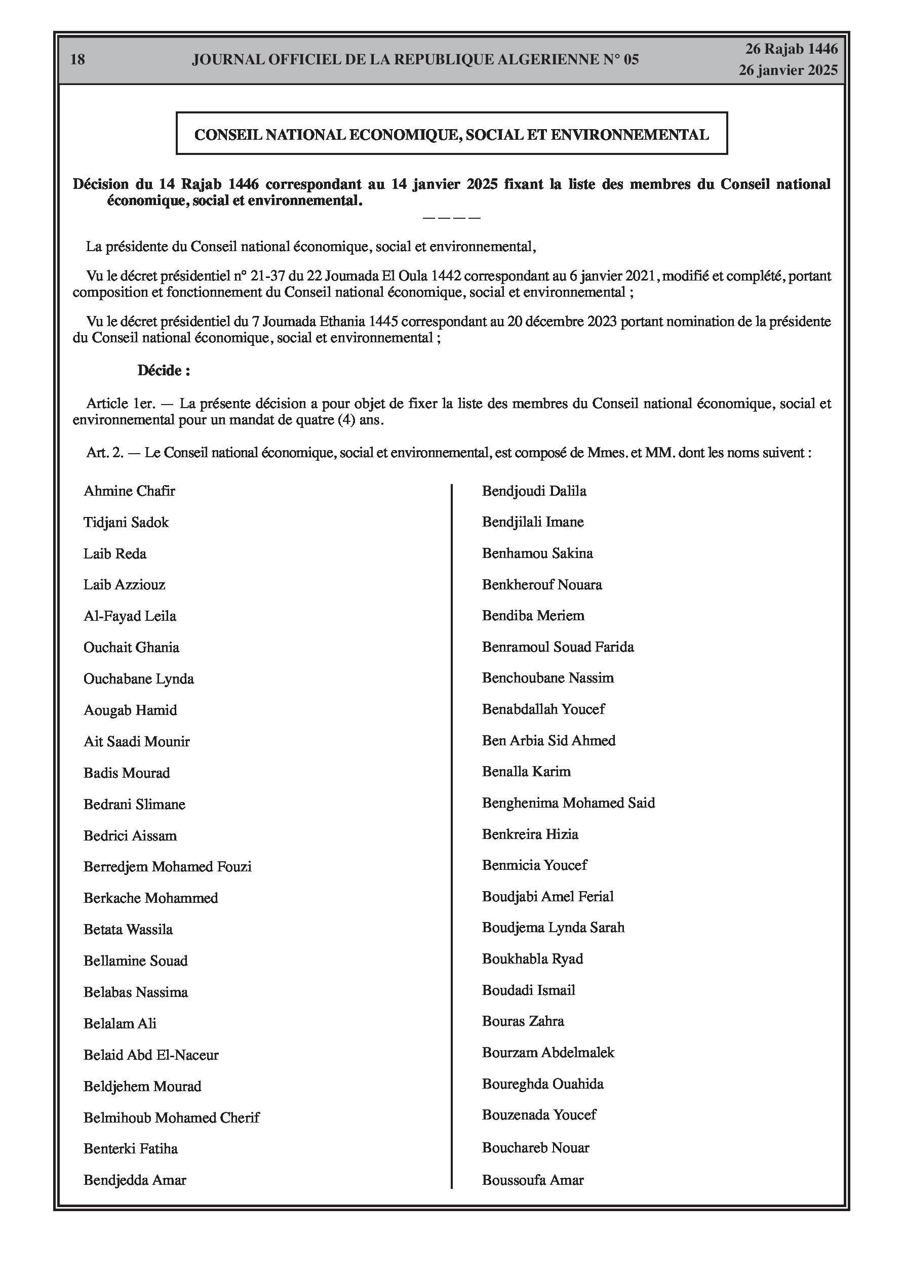 Par décision du 14 janvier 2025, la présidente du Conseil national économique, social et environnemental a fixé la liste nominative des membres du Conseil nommés pour un mandat de quatre ans. La décision comprend une liste détaillée des nouveaux membres, et la liste sera complétée ultérieurement.
